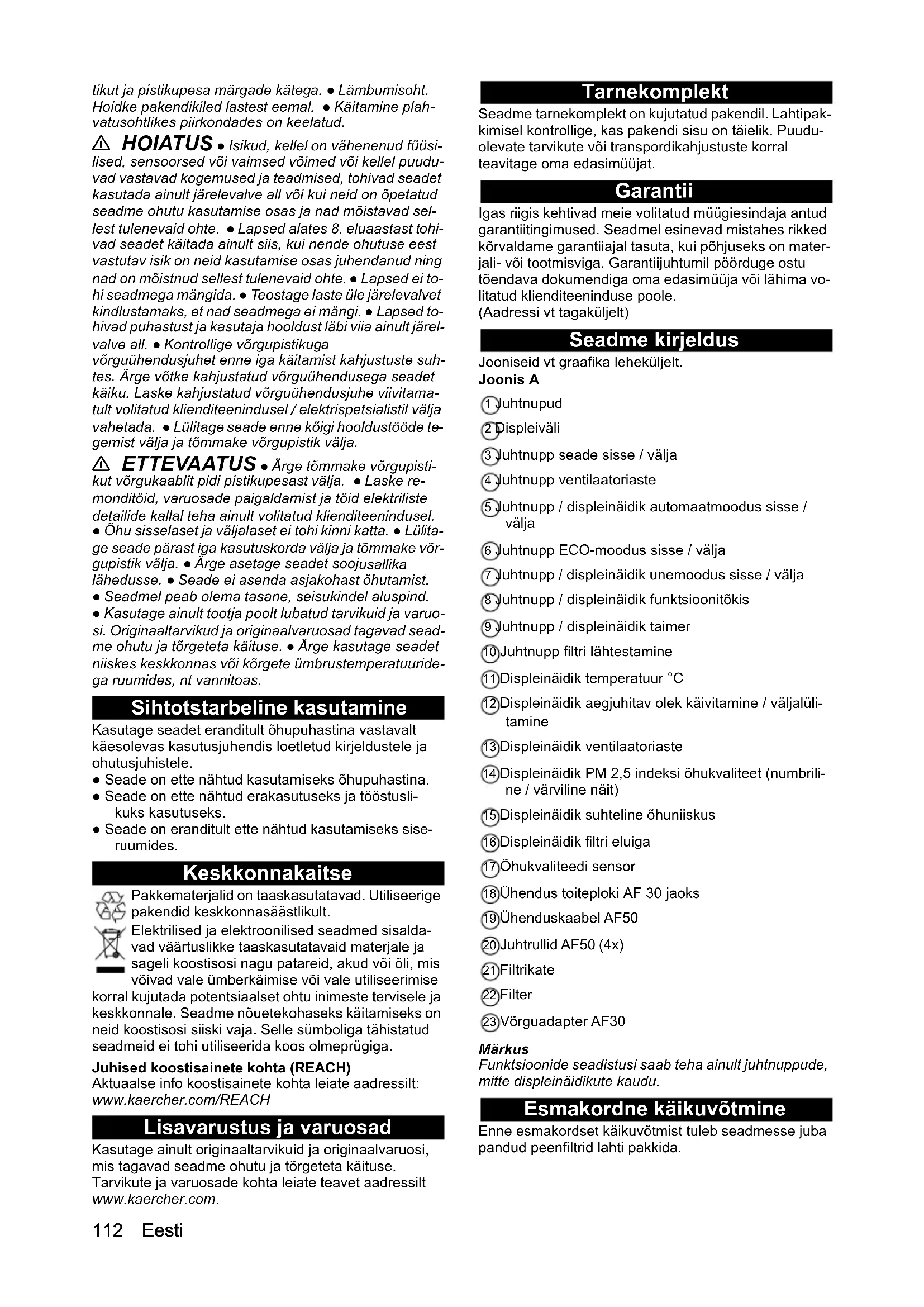 DC24V 220-240 Допустимо ниво на шум112 Eesti tikut ja pistikupesa märgade kätega. ● Lämbumisoht. Hoidke pakendikiled lastest eemal. ● Käitamine plah- vatusohtlikes piirkondades on keelatud. 몇 HOIATUS ● Isikud, kellel on vähenenud füüsi- lised, sensoorsed või vaimsed võimed või kellel puudu- vad vastavad kogemused ja teadmised, tohivad seadet kasutada ainult järelevalve all või kui neid on õpetatud seadme ohutu kasutamise osas ja nad mõistavad sel- lest tulenevaid ohte. ● Lapsed alates 8. eluaastast tohi- vad seadet käitada ainult siis, kui nende ohutuse eest vastutav isik on neid kasutamise osas juhendanud ning nad on mõistnud sellest tulenevaid ohte. ● Lapsed ei to- hi seadmega mängida. ● Teostage laste üle järelevalvet kindlustamaks, et nad seadmega ei mängi. ● Lapsed to- hivad puhastust ja kasutaja hooldust läbi viia ainult järel- valve all. ● Kontrollige võrgupistikuga võrguühendusjuhet enne iga käitamist kahjustuste suh- tes. Ärge võtke kahjustatud võrguühendusega seadet käiku. Laske kahjustatud võrguühendusjuhe viivitama- tult volitatud klienditeenindusel / elektrispetsialistil välja vahetada. ● Lülitage seade enne kõigi hooldustööde te- gemist välja ja tõmmake võrgupistik välja. 몇 ETTEVAATUS ● Ärge tõmmake võrgupisti- kut võrgukaablit pidi pistikupesast välja. ● Laske re- monditöid, varuosade paigaldamist ja töid elektriliste detailide kallal teha ainult volitatud klienditeenindusel. ● Õhu sisselaset ja väljalaset ei tohi kinni katta. ● Lülita- ge seade pärast iga kasutuskorda välja ja tõmmake võr- gupistik välja. ● Ärge asetage seadet sooj usallika lähedusse. ● Seade ei asenda asjakohast õhutamist. ● Seadmel peab olema tasane, seisukindel aluspind. ● Kasutage ainult tootja poolt lubatud tarvikuid ja varuo- si. Originaaltarvikud ja originaalvaruosad tagavad sead- me ohutu ja tõrgeteta käituse. ● Ärge kasutage seadet niiskes keskkonnas või kõrgete ümbrustemperatuuride- ga ruumides, nt vannitoas. Sihtotstarbeline kasutamine Kasutage seadet eranditult õhupuhastina vastavalt käesolevas kasutusjuhendis loetletud kirjeldustele ja ohutusjuhistele. ● Seade on ette nähtud kasutamiseks õhupuhastina. ● Seade on ette nähtud erakasutuseks ja tööstusli- kuks kasutuseks. ● Seade on eranditult ette nähtud kasutamiseks sise- ruumides. Keskkonnakaitse Pakkematerjalid on taaskasutatavad. Utiliseerige pakendid keskkonnasäästlikult. Elektrilised ja elektroonilised seadmed sisalda- vad väärtuslikke taaskasutatavaid materjale ja sageli koostisosi nagu patareid, akud või õli, mis võivad vale ümberkäimise või vale utiliseerimise korral kujutada potentsiaalset ohtu inimeste tervisele ja keskkonnale. Seadme nõuetekohaseks käitamiseks on neid koostisosi siiski vaja. Selle sümboliga tähistatud seadmeid ei tohi utiliseerida koos olmeprügiga. Juhised koostisainete kohta (REACH) Aktuaalse info koostisainete kohta leiate aadressilt: www.kaercher.com/REACH Lisavarustus ja varuosad Kasutage ainult originaaltarvikuid ja originaalvaruosi, mis tagavad seadme ohutu ja tõrgeteta käituse. Tarvikute ja varuosade kohta leiate teavet aadressilt www.kaercher.com. Tarnekomplekt Seadme tarnekomplekt on kujutatud pakendil. Lahtipak- kimisel kontrollige, kas pakendi sisu on täielik. Puudu- olevate tarvikute või transpordikahjustuste korral teavitage oma edasimüüjat. Garantii Igas riigis kehtivad meie volitatud müügiesindaja antud garantiitingimused. Seadmel esinevad mistahes rikked kõrvaldame garantiiajal tasuta, kui põhjuseks on mater- jali- või tootmisviga. Garantiijuhtumil pöörduge ostu tõendava dokumendiga oma edasimüüja või lähima vo- litatud klienditeeninduse poole. (Aadressi vt tagaküljelt) Seadme kirjeldus Jooniseid vt graafika leheküljelt. Joonis A 1 Juhtnupud 2 Displeiväli 3 Juhtnupp seade sisse / välja 4 Juhtnupp ventilaatoriaste 5 Juhtnupp / displeinäidik automaatmoodus sisse / välja 6 Juhtnupp ECO-moodus sisse / välja 7 Juhtnupp / displeinäidik unemoodus sisse / välja 8 Juhtnupp / displeinäidik funktsioonitõkis 9 Juhtnupp / displeinäidik taimer 10 Juhtnupp filtri lähtestamine 11 Displeinäidik temperatuur °C 12 Displeinäidik aegjuhitav olek käivitamine / väljalüli- tamine 13 Displeinäidik ventilaatoriaste 14 Displeinäidik PM 2,5 indeksi õhukvaliteet (numbrili- ne / värviline näit) 15 Displeinäidik suhteline õhuniiskus 16 Displeinäidik filtri eluiga 17 Õhukvaliteedi sensor 18 Ühendus toiteploki AF 30 jaoks 19 Ühenduskaabel AF50 20 Juhtrullid AF50 (4x) 21 Filtrikate 22 Filter 23 Võrguadapter AF30 Märkus Funktsioonide seadistusi saab teha ainult juhtnuppude, mitte displeinäidikute kaudu. Esmakordne käikuvõtmine Enne esmakordset käikuvõtmist tuleb seadmesse juba pandud peenfiltrid lahti pakkida.Eesti 113