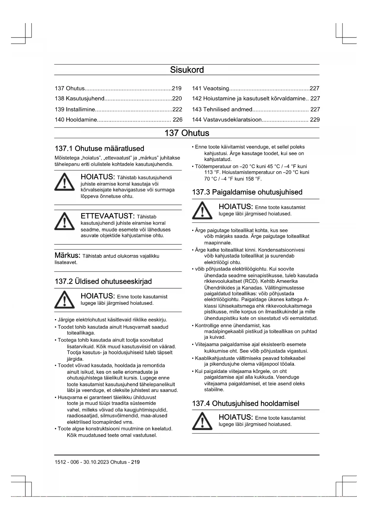 HOIATUS: Enne toote kasutamist lugege läbi järgmised hoiatused. 1512 - 006 - 30.10.2023 Ohutus - 219• Lahutage toode toiteallikast enne, kui alustate toote puhastamist või hooldamist.