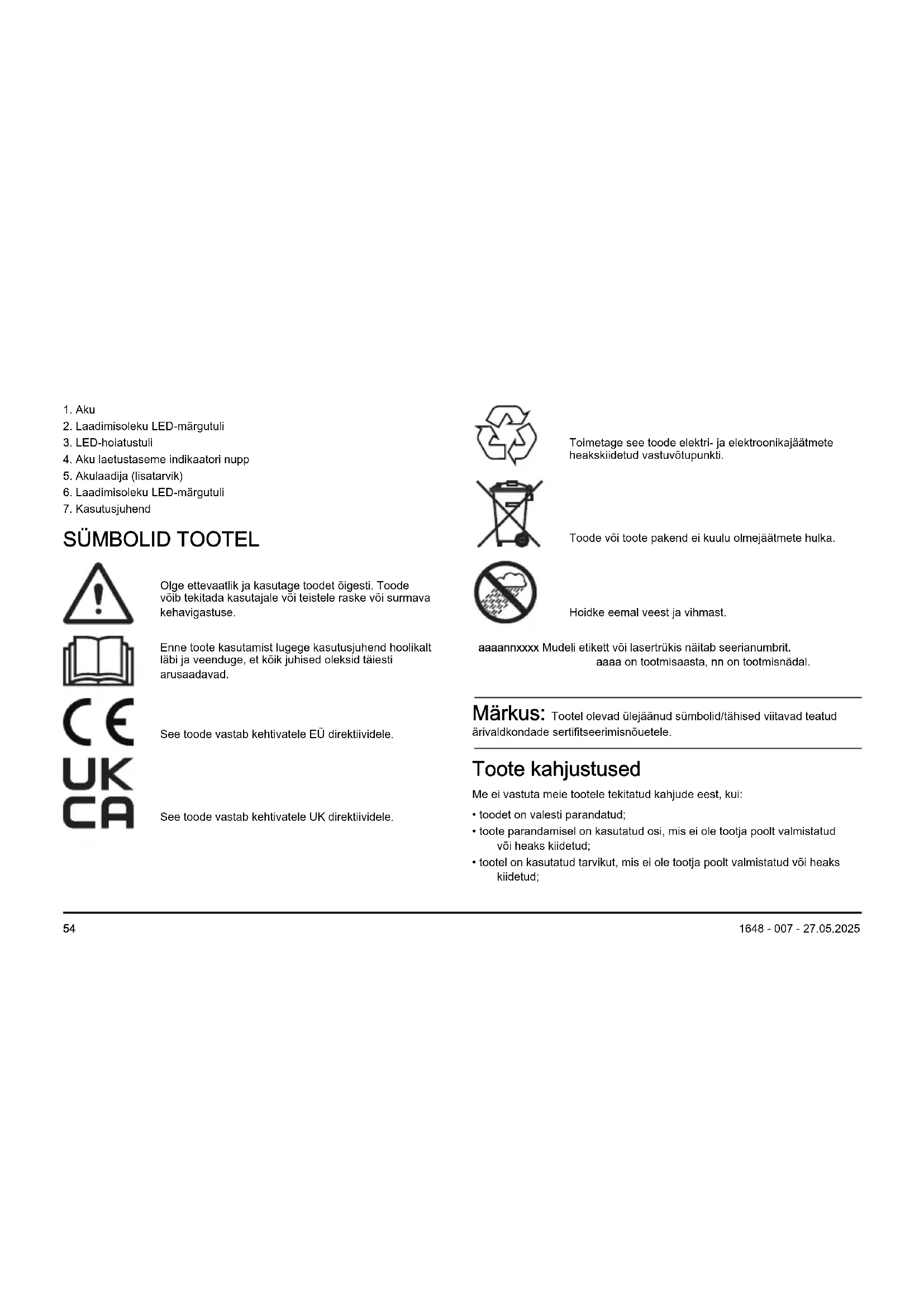 - Kui aku on täis laetud, eemaldage aku akulaadijast. 1648 - 007 - 27.05.2025 55• Kui te toodet ei kasuta või transpordite toodet teise kohta, ühendage aku lahti.