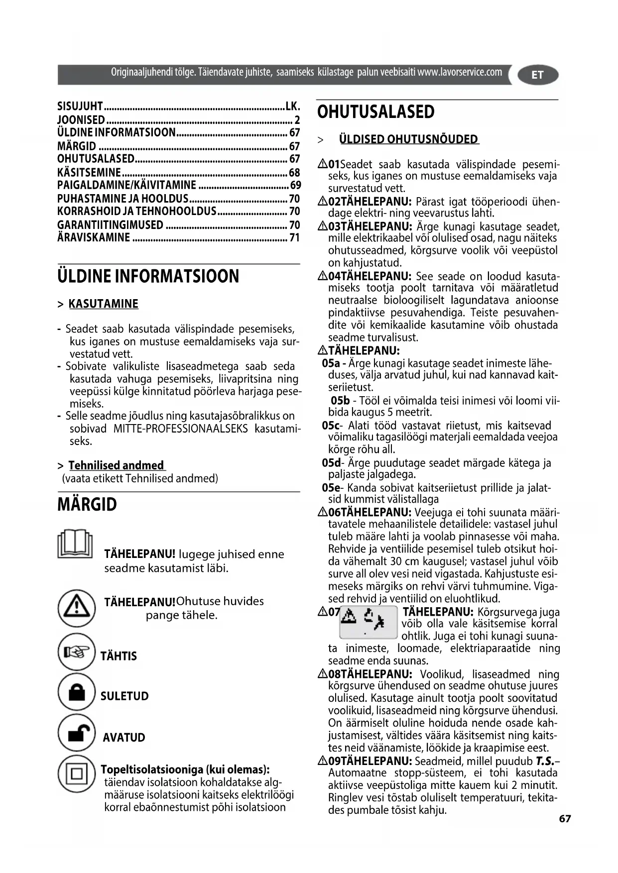 01Seadet saab kasutada välispindade pesemi- seks, kus iganes on mustuse eemaldamiseks vaja survestatud vett. 02TÄHELEPANU: Pärast igat tööperioodi ühen- dage elektri- ning veevarustus lahti. 03TÄHELEPANU: Ärge kunagi kasutage seadet, mille elektrikaabel või olulised osad, nagu näiteks ohutusseadmed, kõrgsurve voolik või veepüstol on kahjustatud. 04TÄHELEPANU: See seade on loodud kasuta- miseks tootja poolt tarnitava või määratletud neutraalse bioloogiliselt lagundatava anioonse pindaktiivse pesuvahendiga. Teiste pesuvahen- dite või kemikaalide kasutamine võib ohustada seadme turvalisust. TÄHELEPANU: 05a - Ärge kunagi kasutage seadet inimeste lähe- duses, välja arvatud juhul, kui nad kannavad kait- seriietust. 05b - Tööl ei võimalda teisi inimesi või loomi vii- bida kaugus 5 meetrit. 05c- Alati tööd vastavat riietust, mis kaitsevad võimaliku tagasilöögi materjali eemaldada veejoa kõrge rõhu all. 05d- Ärge puudutage seadet märgade kätega ja paljaste jalgadega. 05e- Kanda sobivat kaitseriietust prillide ja jalat- sid kummist välistallaga 06TÄHELEPANU: Veejuga ei tohi suunata määri- tavatele mehaanilistele detailidele: vastasel juhul tuleb määre lahti ja voolab pinnasesse või maha. Rehvide ja ventiilide pesemisel tuleb otsikut hoi- da vähemalt 30 cm kaugusel; vastasel juhul võib surve all olev vesi neid vigastada. Kahjustuste esi- meseks märgiks on rehvi värvi tuhmumine. Viga- sed rehvid ja ventiilid on eluohtlikud. 07 TÄHELEPANU: Kõrgsurvega juga võib olla vale käsitsemise korral ohtlik. Juga ei tohi kunagi suuna- ta inimeste, loomade, elektriaparaatide ning seadme enda suunas. 08TÄHELEPANU: Voolikud, lisaseadmed ning kõrgsurve ühendused on seadme ohutuse juures olulised. Kasutage ainult tootja poolt soovitatud voolikuid, lisaseadmeid ning kõrgsurve ühendusi. On äärmiselt oluline hoiduda nende osade kah- justamisest, vältides väära käsitsemist ning kaits- tes neid väänamiste, löökide ja kraapimise eest. 09TÄHELEPANU: Seadmeid, millel puudub T.S.– Automaatne stopp-süsteem, ei tohi kasutada aktiivse veepüstoliga mitte kauem kui 2 minutit. Ringlev vesi tõstab oluliselt temperatuuri, tekita- des pumbale tõsist kahju. SISUJUHT ......................................................................LK. JOONISED ........................................................................ 2 ÜLDINE INFORMATSIOON ........................................... 67 MÄRGID ......................................................................... 67 OHUTUSALASED ........................................................... 67 KÄSITSEMINE ................................................................ 68