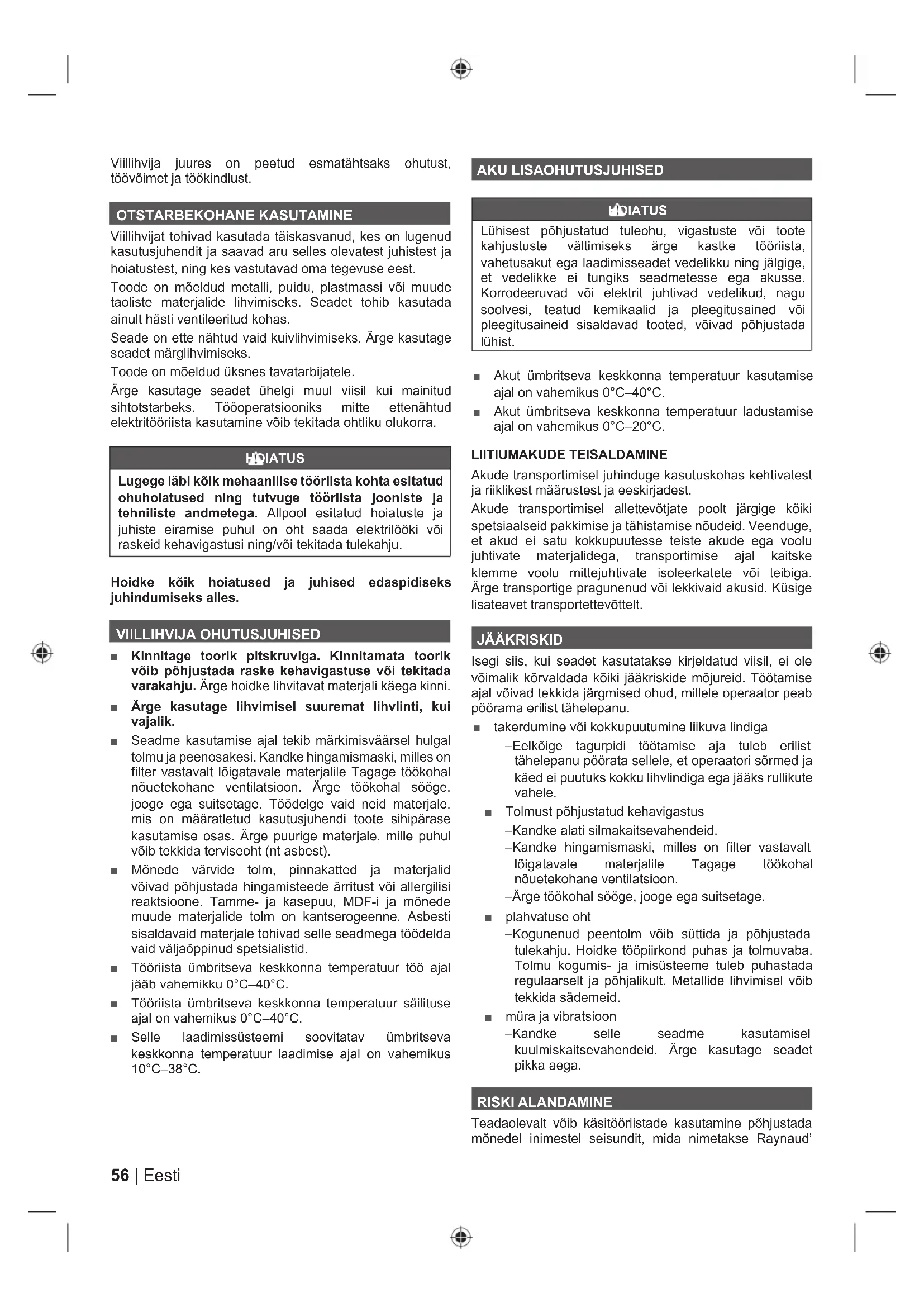 sündroomiks. Sümptomidena võib ilmneda sõrmede tuimus ja valkjaks muutumine, mis tavaliselt ilmneb külmas töötamisel. Nende sümptomite puhul tuleb hoiduda külmast ja niiskusest, dieedist ning suitsetamisest ja kasutada õigeid töövõtteid. Vibratsiooni mõju vähendamiseks tuleb rakendada järgmisi abinõusid. ■ Külma ilmaga hoidke oma keha soe. Kandke kindaid, et hoida oma käed ja randmed soojad. Uuringud näitavad, et Raynaud’s Syndrome ilmneb põhiliselt külma ilmaga. ■ Pärast külmas töötamist tehke harjutusi, et verevarustust kiirendada. ■ Tehke regulaarselt töövaheaegasid. Piirake tööperioodi pikkust. Kui ilmnevad haigustunnused, lõpetage kohe töö ja pöörduge arsti poole. HOIATUS Seadme pikaajalisel kasutamisel võite saada kehavigastusi või vigastused võivad süveneda. Seadme kasutamisel pika aja jooksul tuleb teha korralisi vaheaegasid.