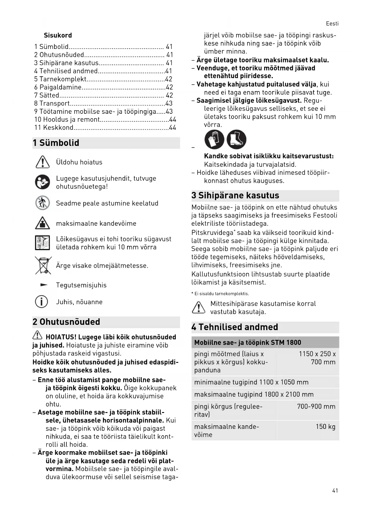 Kandke sobivat isiklikku kaitsevarustust: Kaitsekindada ja turvajalatsid. – Hoidke läheduses viibivad inimesed tööpiir konnast ohutus kauguses. 3 Sihipärane kasutus Mobiilne sae- ja tööpink on ette nähtud ohutuks ja täpseks saagimiseks ja freesimiseks Festooli elektriliste tööriistadega. Pitskruvidega