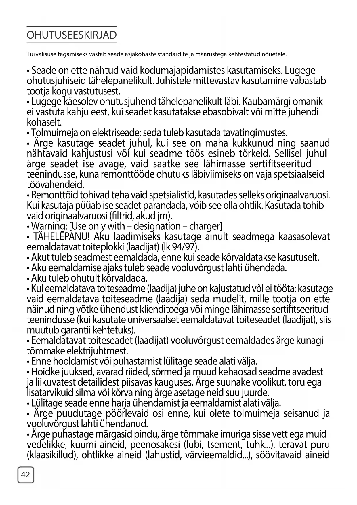 - TÄHELEPANU! Aku laadimiseks kasutage ainult seadmega kaasasolevat eemaldatavat toiteplokki (laadijat) (lk 94/97).