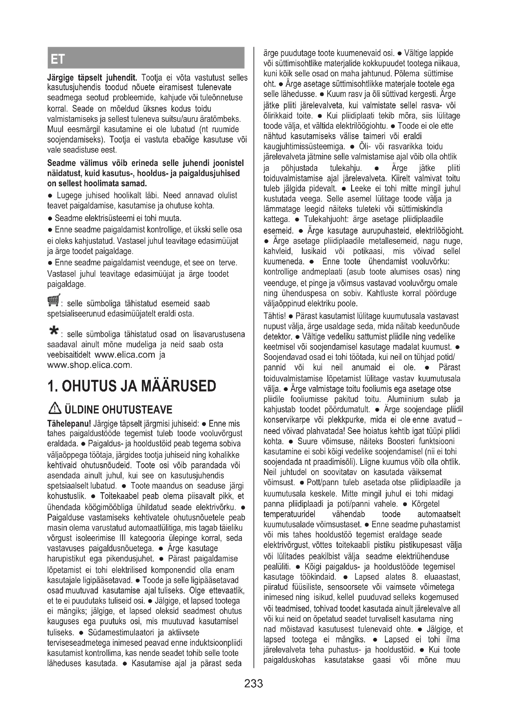 Егер тексерулерден кейін ақау жойылмаса, ең жақын Тұтынушыларды қолдау орталығына хабарласыңыз. 232ET Järgige täpselt juhendit. Tootja ei võta vastutust selles kasutusjuhendis toodud nõuete eiramisest tulenevate seadmega seotud probleemide, kahjude või tuleõnnetuse korral. Seade on mõeldud üksnes kodus toidu valmistamiseks ja sellest tuleneva suitsu/auru äratõmbeks. Muul eesmärgil kasutamine ei ole lubatud (nt ruumide soojendamiseks). Tootja ei vastuta ebaõige kasutuse või vale seadistuse eest. Seadme välimus võib erineda selle juhendi joonistel näidatust, kuid kasutus-, hooldus- ja paigaldusjuhised on sellest hoolimata samad. ● Lugege juhised hoolikalt läbi. Need annavad olulist teavet paigaldamise, kasutamise ja ohutuse kohta. ● Seadme elektrisüsteemi ei tohi muuta. ● Enne seadme paigaldamist kontrollige, et ükski selle osa ei oleks kahjustatud. Vastasel juhul teavitage edasimüüjat ja ärge toodet paigaldage. ● Enne seadme paigaldamist veenduge, et see on terve. Vastasel juhul teavitage edasimüüjat ja ärge toodet paigaldage. : selle sümboliga tähistatud esemeid saab spetsialiseerunud edasimüüjatelt eraldi osta. : selle sümboliga tähistatud osad on lisavarustusena saadaval ainult mõne mudeliga ja neid saab osta veebisaitidelt www.elica.com ja www.shop.elica.com.