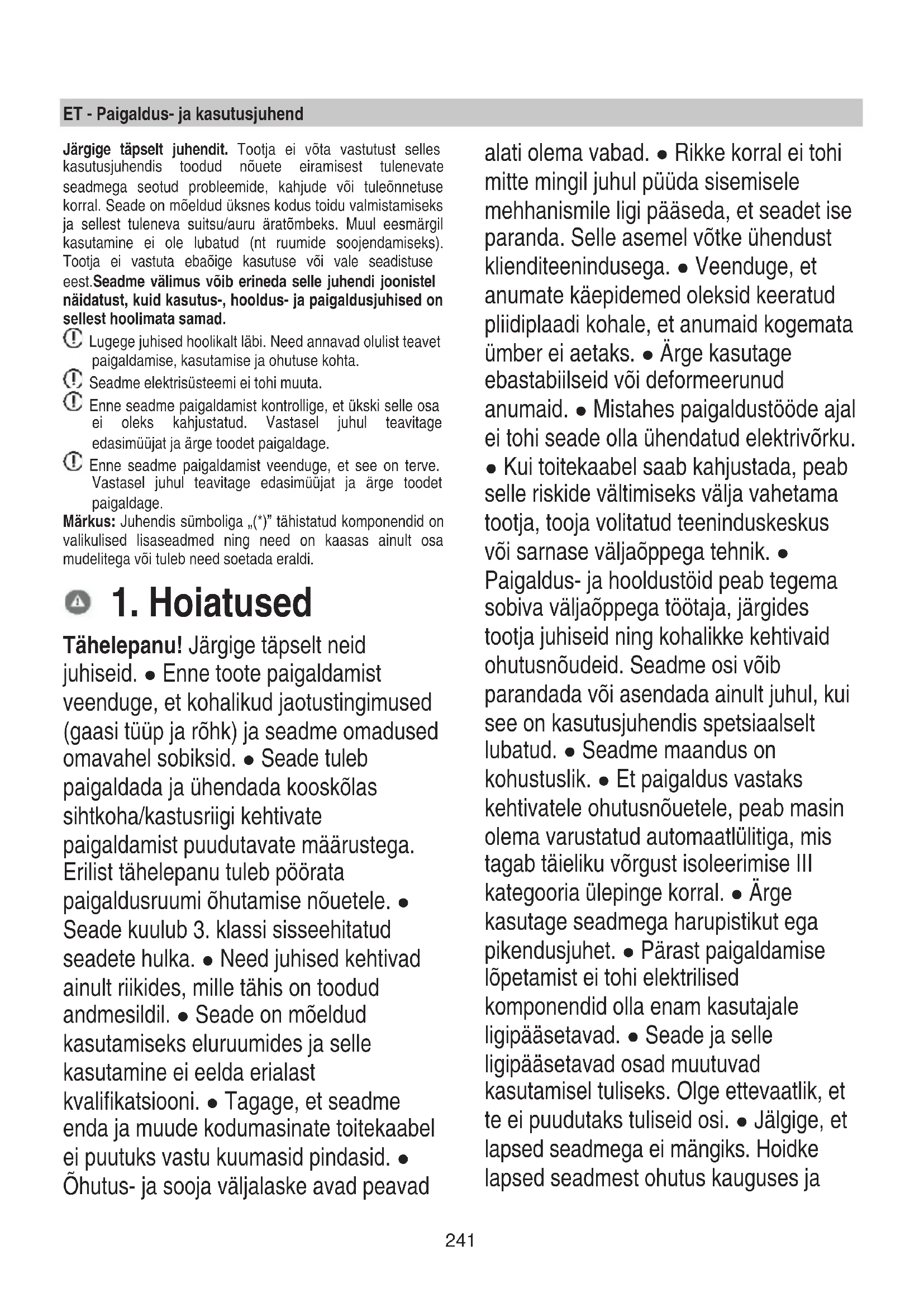Tähelepanu! Järgige täpselt neid juhiseid. ● Enne toote paigaldamist veenduge, et kohalikud jaotustingimused (gaasi tüüp ja rõhk) ja seadme omadused omavahel sobiksid. ● Seade tuleb paigaldada ja ühendada kooskõlas sihtkoha/kastusriigi kehtivate paigaldamist puudutavate määrustega. Erilist tähelepanu tuleb pöörata paigaldusruumi õhutamise nõuetele. ● Seade kuulub 3. klassi sisseehitatud seadete hulka. ● Need juhised kehtivad ainult riikides, mille tähis on toodud andmesildil. ● Seade on mõeldud kasutamiseks eluruumides ja selle kasutamine ei eelda erialast kvalifikatsiooni. ● Tagage, et seadme enda ja muude kodumasinate toitekaabel ei puutuks vastu kuumasid pindasid. ● Õhutus- ja sooja väljalaske avad peavad alati olema vabad. ● Rikke korral ei tohi mitte mingil juhul püüda sisemisele mehhanismile ligi pääseda, et seadet ise paranda. Selle asemel võtke ühendust klienditeenindusega. ● Veenduge, et anumate käepidemed oleksid keeratud pliidiplaadi kohale, et anumaid kogemata ümber ei aetaks. ● Ärge kasutage ebastabiilseid või deformeerunud anumaid. ● Mistahes paigaldustööde ajal ei tohi seade olla ühendatud elektrivõrku. ● Kui toitekaabel saab kahjustada, peab selle riskide vältimiseks välja vahetama tootja, tooja volitatud teeninduskeskus või sarnase väljaõppega tehnik. ● Paigaldus- ja hooldustöid peab tegema sobiva väljaõppega töötaja, järgides tootja juhiseid ning kohalikke kehtivaid ohutusnõudeid. Seadme osi võib parandada või asendada ainult juhul, kui see on kasutusjuhendis spetsiaalselt lubatud. ● Seadme maandus on kohustuslik. ● Et paigaldus vastaks kehtivatele ohutusnõuetele, peab masin olema varustatud automaatlülitiga, mis tagab täieliku võrgust isoleerimise III kategooria ülepinge korral. ● Ärge kasutage seadmega harupistikut ega pikendusjuhet. ● Pärast paigaldamise lõpetamist ei tohi elektrilised komponendid olla enam kasutajale ligipääsetavad. ● Seade ja selle ligipääsetavad osad muutuvad kasutamisel tuliseks. Olge ettevaatlik, et te ei puudutaks tuliseid osi. ● Jälgige, et lapsed seadmega ei mängiks. Hoidke lapsed seadmest ohutus kauguses ja242 jälgige neid, sest seadme ligipääsetavad osad muutuvad kasutamisel väga tuliseks. ● Kasutamise ajal ja pärast seda ärge puudutage seadme kuumenevaid osi. ● Vältige lappide või süttimisohtlike materjalide kokkupuudet pliidiplaadiga niikaua, kuni kõik selle osad on maha jahtunud. ● Ärge asetage süttimisohtlikke materjale seadmele ega selle lähedusse. ● Kuum rasv ja õli süttivad kergesti. Olge eriti hoolikas, kui valmistate rasva- või õlirikast toitu. ● Kui pliidiplaati tekib mõra, siis elektrilöögiohtu vältimiseks lülitage seade välja. ● Seade ei ole projekteeritud nii, et seda võiks sisse lülitada eraldiseisva taimeri või kaugjuhtimissüsteemiga. ● Ärge jätke pliiti toiduvalmistamise ajal järelevalveta. ● Leeke ei tohi mitte mingil juhul kustutada veega. Selle asemel lülitage seade välja ja lämmatage leegid näiteks tuleteki või süttimiskindla kattega. Tulekahjuoht: ärge asetage pliidiplaadile esemeid. ● Ärge kasutage seadmega aurupuhasteid. ● Enne seadme elektrivõrku ühendamist kontrollige, kas andmesildil (seadme alumisel küljel) toodud väärtused sobivad elektrivõrgu ja pistiku pinge ning võimsusega. Kahtluste korral pöörduge väljaõppinud elektriku poole. Tähtis! ● Pärast kasutamist lülitage seade välja. ● Et vältida vedelike ülevoolamist, vähendage leegi intensiivsust. ● Soojendavad osad ei tohi töötada, kui neil on tühjad anumad või kui neil anumaid ei ole. ● Pärast toiduvalmistamise lõpetamist lülitage kasutatud keedualad välja. ● Ärge asetage töötavale pliidiplaadile tühjasid anumeid. ● Ärge kasutage anumaid, mis ulatuvad üle pliidiplaadi ääre.