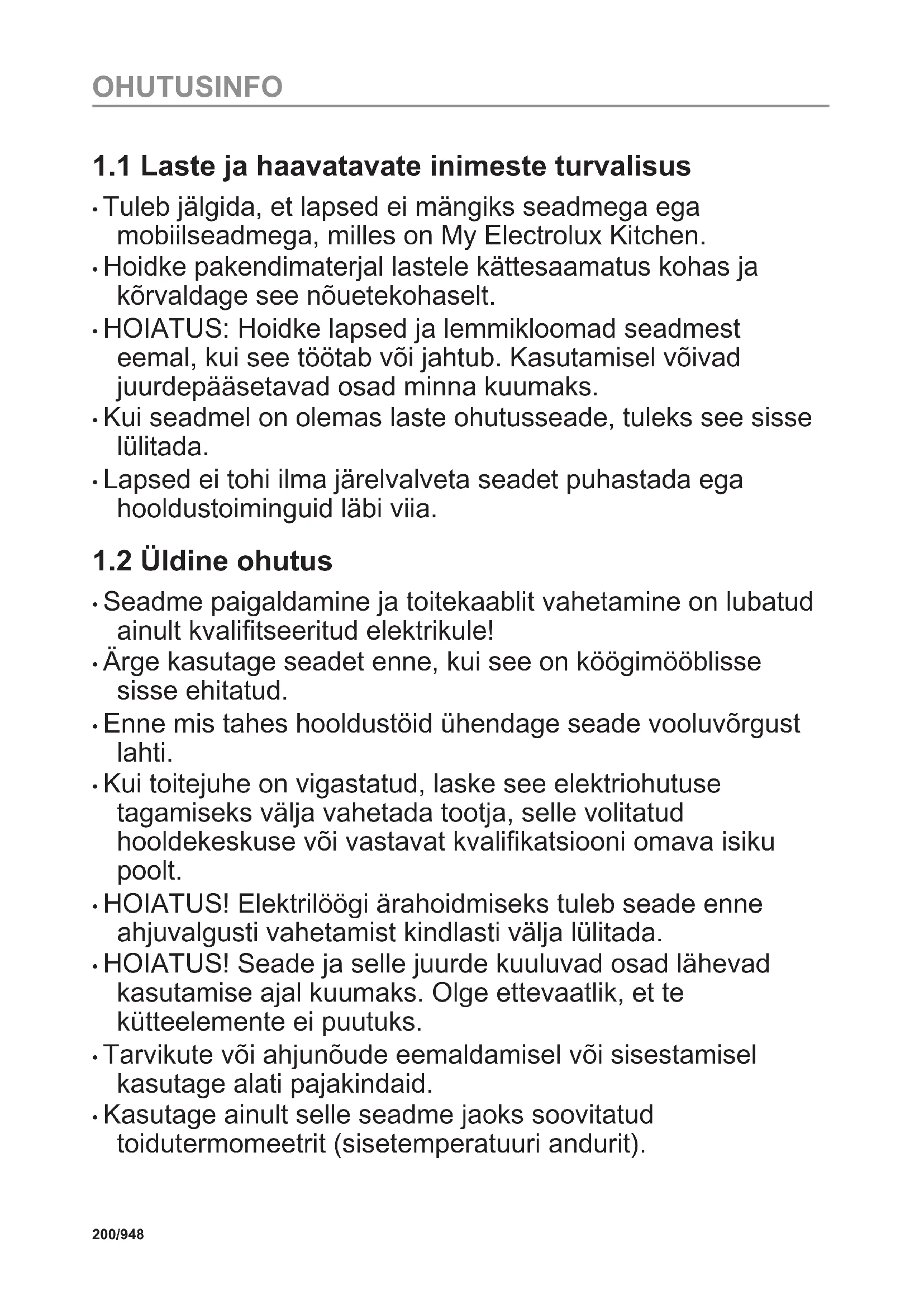 - Tuleb jälgida, et lapsed ei mängiks seadmega ega mobiilseadmega, milles on My Electrolux Kitchen.