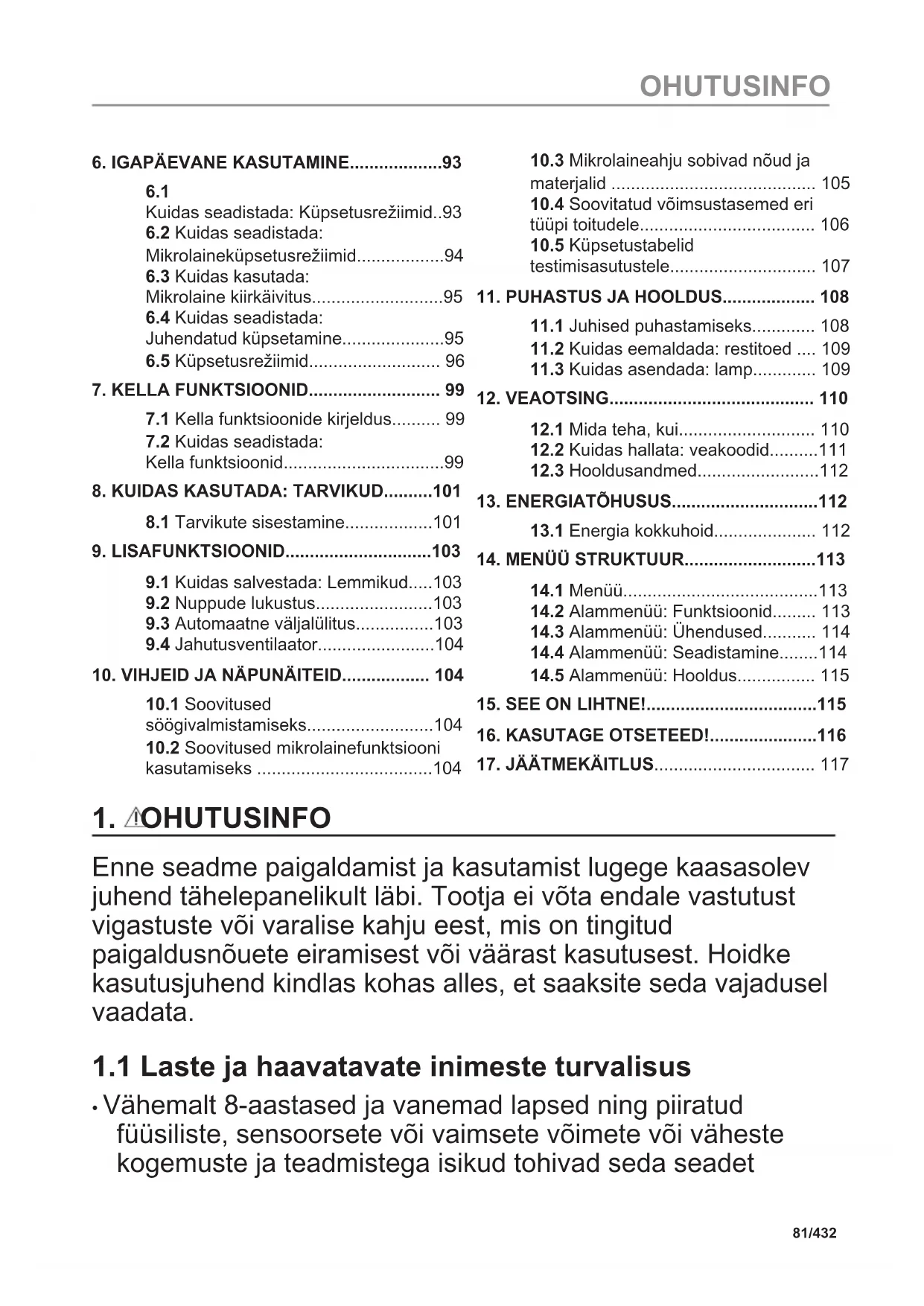 - Tarvikute või ahjunõude eemaldamisel või sisestamisel kasutage alati pajakindaid. 82/432 OHUTUSINFO• Ärge aktiveerige mikrolainefunktsiooni, kui seade on tühi. Ahjuõõnsuses olevad metallosad võivad tekitada elektrikaare.