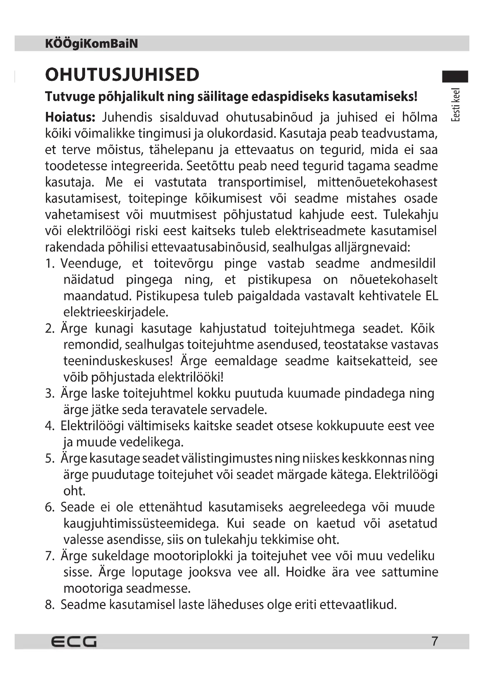 Pakkepaber ja lainepapp – viige jäätmejaama. Pakkekiled, PE kotid, plastist osad – visake plasti utiliseerimiskonteineritesse. TOOTE KASUTUSEST KÕRVALDAMINE TÖÖEA LÕPUS Elektri- ja elektroonikaseadmete kasutusest kõrvaldamine (kehtib EL-i liikmesriikides ja teistes Euroopa riikides, kus rakendatakse ringlussevõtusüsteemi) Näidatud sümbol tootel või pakendil tähendab, et toodet ei tohiks käidelda nagu olmejäätmeid. Viige toode elektri-ja elektroonikaseadmetele ettenähtud ringlussevõtupunkti. Vältige võimalikke negatiivseid mõjusid inimese tervisele ja keskkonnale, tagades oma tootele nõuetekohase ringlussevõtu. Ringlussevõtt aitab säilitada loodusvarasid. Lisateavet selle toote ringlussevõtu kohta saate oma kohalikust omavalitsusest, olmejäätmete käitlemise ettevõttest või poest, kust te toote ostsite. See toode vastab EL-i elektromagnetilise ühilduvuse ja elektriohutuse direktiivide nõuetele ning raskmetallide emissiooninõuetele elektri- ja elektroonikaseadmetest. Lisaks vastab see asjakohastele energiaintensiivsusele ja hügieeninõuetele otsesel kokkupuutel toiduga. Kasutusjuhend on kättesaadav Internetis www.ecg-electro.eu veebilehel. Teksti ja tehniliste parameetrite muutmise õigused on kaitstud. 08/05Español Español