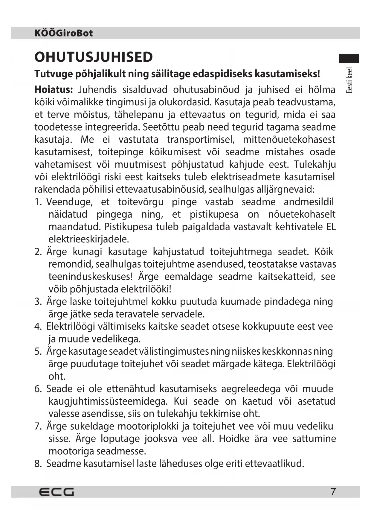 Pakkepaber ja lainepapp – viige jäätmejaama. Pakkekiled, PE kotid, plastist osad – visake plasti utiliseerimiskonteineritesse. TOOTE KASUTUSEST KÕRVALDAMINE TÖÖEA LÕPUS Elektri- ja elektroonikaseadmete kasutusest kõrvaldamine (kehtib EL-i liikmesriikides ja teistes Euroopa riikides, kus rakendatakse ringlussevõtusüsteemi) Näidatud sümbol tootel või pakendil tähendab, et toodet ei tohiks käidelda nagu olmejäätmeid. Viige toode elektri-ja elektroonikaseadmetele ettenähtud ringlussevõtupunkti. Vältige võimalikke negatiivseid mõjusid inimese tervisele ja keskkonnale, tagades oma tootele nõuetekohase ringlussevõtu. Ringlussevõtt aitab säilitada loodusvarasid. Lisateavet selle toote ringlussevõtu kohta saate oma kohalikust omavalitsusest, olmejäätmete käitlemise ettevõttest või poest, kust te toote ostsite. See toode vastab EL-i elektromagnetilise ühilduvuse ja elektriohutuse direktiivide nõuetele ning raskmetallide emissiooninõuetele elektri- ja elektroonikaseadmetest. Lisaks vastab see asjakohastele energiaintensiivsusele ja hügieeninõuetele otsesel kokkupuutel toiduga. Kasutusjuhend on kättesaadav Internetis www.ecg-electro.euveebilehel. Teksti ja tehniliste parameetrite muutmise õigused on kaitstud. 08/05Español Español