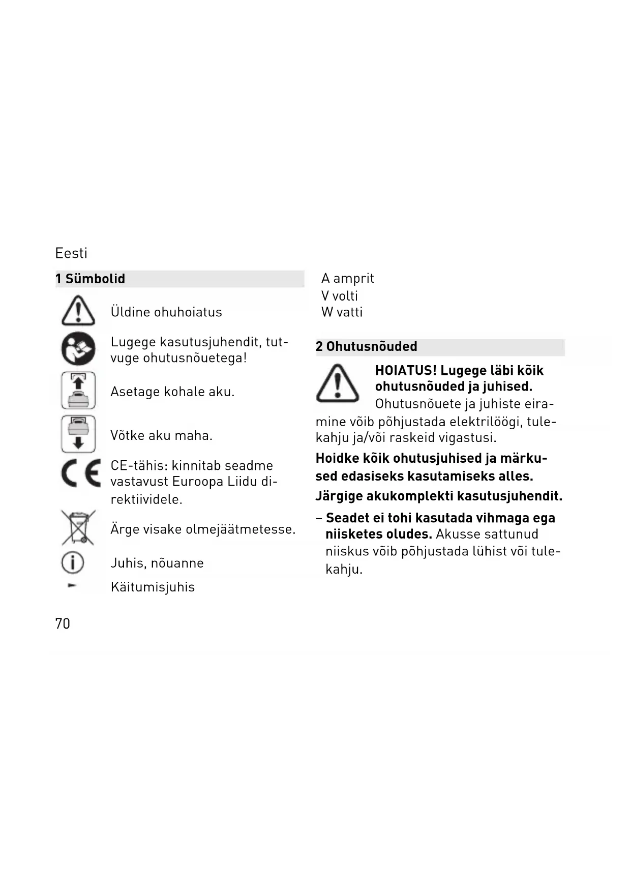 ► Skader kan undgås ved at rengøre apparatet med en tør, blød klud. Brug ikke opløsningsmidler. 9 Miljø Maskinen må ikke bort skaffes med almindeligt husholdningsaffald! Udstyr, tilbehør og emballage skal bortskaffes miljømæssigt korrekt på en kommunal genbrugsstati on. Gældende nationale forskrifter skal overholdes. Kun EU: Ifølge Rådets direktiv om affald af elektrisk og elektronisk udstyr og gennemførelse i national ret skal gam melt el-værktøj indsamles separat og afleveres til miljøvenlig genvinding. Informationer om REACH: www.fe stool.com/reach Dansk 691 Sümbolid Üldine ohuhoiatus Lugege kasutusjuhendit, tut vuge ohutusnõuetega! Asetage kohale aku. Võtke aku maha. CE-tähis: kinnitab seadme vastavust Euroopa Liidu di rektiividele. Ärge visake olmejäätmetesse. Juhis, nõuanne Käitumisjuhis A amprit V volti W vatti 2 Ohutusnõuded HOIATUS! Lugege läbi kõik ohutusnõuded ja juhised. Ohutusnõuete ja juhiste eira mine võib põhjustada elektrilöögi, tule kahju ja/või raskeid vigastusi. Hoidke kõik ohutusjuhised ja märku sed edasiseks kasutamiseks alles. Järgige akukomplekti kasutusjuhendit. – Seadet ei tohi kasutada vihmaga ega niisketes oludes. Akusse sattunud niiskus võib põhjustada lühist või tule kahju. Eesti 70– Ärge torgake USB-pesasse naelu, traati ega muid esemeid. Vastasel korral võib tekkida lühis, eralduda võib suitsu ja tekkida võib põleng. – Ärge ühendage USB-pesa tavalise pistikupesa, mõne teise vooluallika ga või kõrgepingeseadmega. Vastaval juhul püsib tuleoht. USB-pesad on mõeldud madalpingeseadmete laadi miseks (USB-A-väljund = 5 V / 2,4 A; väljund ühildub USB‑C-ga