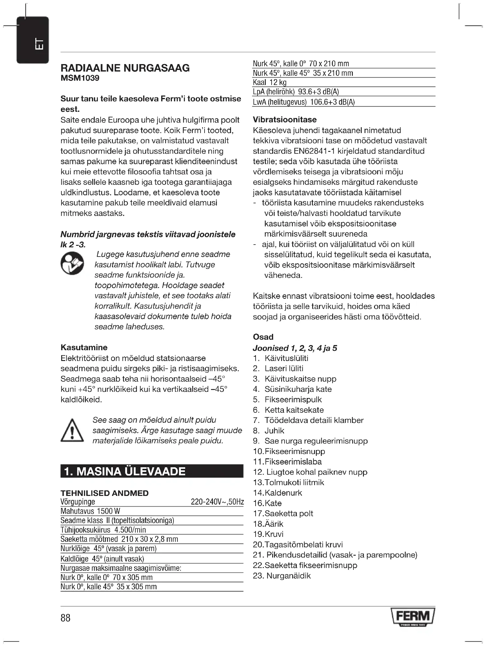 RADIAALNE NURGASAAG MSM1039 Suur tanu teile kaesoleva Ferm’i toote ostmise eest. Saite endale Euroopa uhe juhtiva hulgifirma poolt pakutud suureparase toote. Koik Ferm’i tooted, mida teile pakutakse, on valmistatud vastavalt tootlusnormidele ja ohutusstandarditele ning samas pakume ka suureparast klienditeenindust kui meie ettevotte filosoofia tahtsat osa ja lisaks sellele kaasneb iga tootega garantiiajaga uldkindlustus. Loodame, et kaesoleva toote kasutamine pakub teile meeldivaid elamusi mitmeks aastaks. Numbrid jargnevas tekstis viitavad joonistele lk 2 -3. Lugege kasutusjuhend enne seadme kasutamist hoolikalt labi. Tutvuge seadme funktsioonide ja. toopohimotetega. Hooldage seadet vastavalt juhistele, et see tootaks alati korralikult. Kasutusjuhendit ja kaasasolevaid dokumente tuleb hoida seadme laheduses. Kasutamine Elektritööriist on mõeldud statsionaarse seadmena puidu sirgeks piki- ja ristisaagimiseks. Seadmega saab teha nii horisontaalseid –45° kuni +45° nurklõikeid kui ka vertikaalseid –45° kaldlõikeid. See saag on mõeldud ainult puidu saagimiseks. Ärge kasutage saagi muude materjalide lõikamiseks peale puidu.