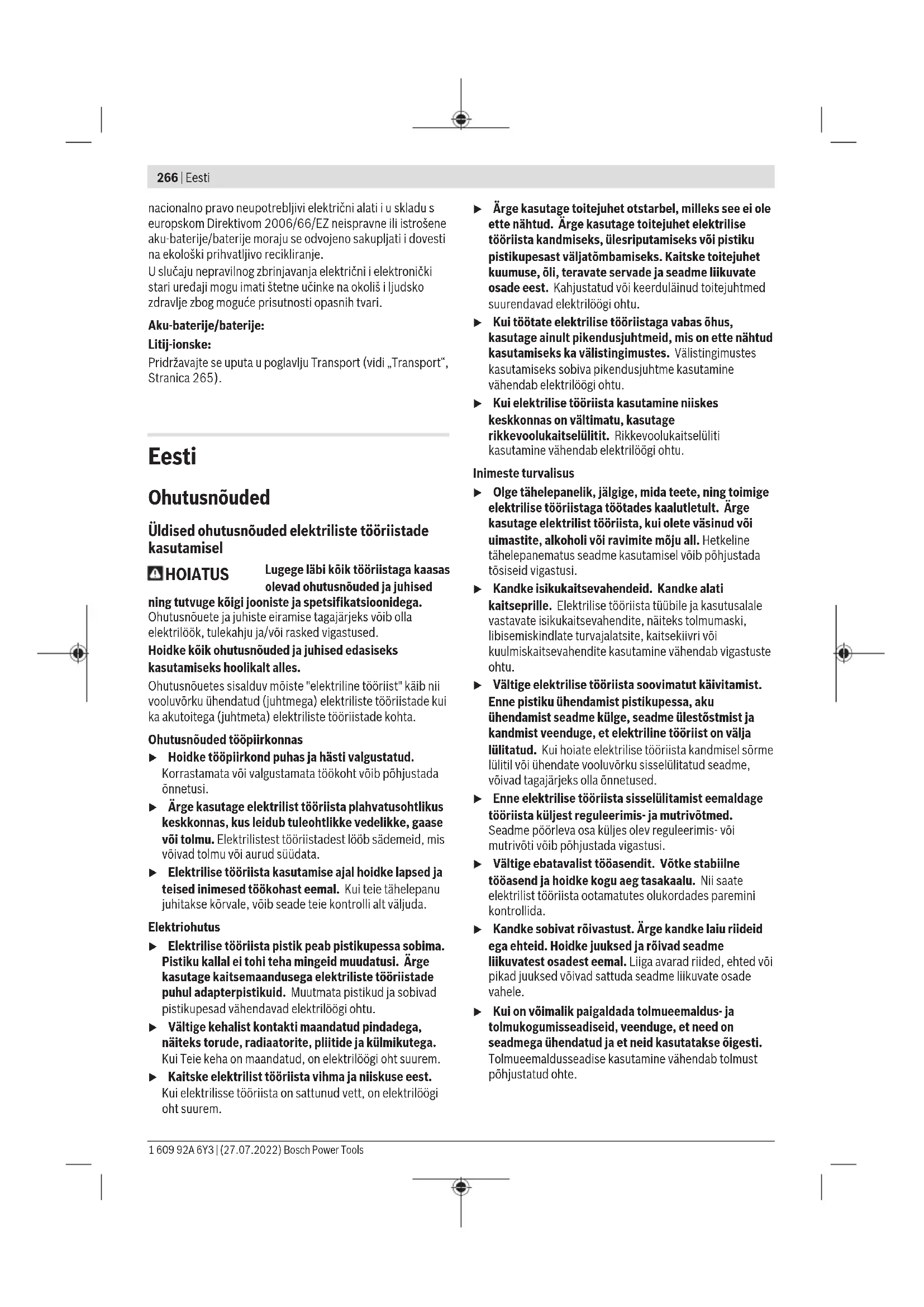 Low Energy Module šalje signal u redovitim razmacima. Ovisno o okolini možda će biti potrebno nekoliko intervala slanja prije nego što se prepozna električni alat. Ako se ne prepozna električni alat, provjerite sljedeće: – Je li prevelika udaljenost do mobilnog krajnjeg uređaja? Smanjite razmak između mobilnog krajnjeg uređaja i električnog alata. – Isključite Bluetooth® na svojem mobilnom krajnjem uređaju i ponovno ga uključite. Provjerite je li sada prepoznat električni alat. Funkcije povezane s električnim alatom Zajedno s modulom Bluetooth® Low Energy Module raspoložive su sljedeće funkcije Connectivity električnog alata: – Registracija i personalizacija – Provjera statusa, javljanje upozorenja – Opće informacije i postavke – Upravljanje – Programiranje stupnjeva broja hodova – Uključivanje/isključivanje i upravljanje ASC-a (GST18V‑155SC) – Upozorenja (zaštita od preopterećenja ovisna o temperaturi, isključivanje kod udarca o pod) Održavanje i servisiranje Održavanje i čišćenje u Prije svih radova na električnom alatu (npr. održavanje, zamjena alata, itd.), kao i kod njegovog transporta i spremanja, aku-bateriju treba izvaditi iz električnog alata. Kod nehotičnog aktiviranja prekidača za uključivanje/isključivanje postoji opasnost od ozljeda. u Električni alat i otvore za hlađenje održavajte čistima kako bi se moglo dobro i sigurno raditi. Redovito čistite stezač lista pile. U tu svrhu izvadite list pile iz električnog alata i lagano protresite električni alat na ravnoj površini. Jaka zaprljanost električnog alata može dovesti do funkcionalnih smetnji. Stoga nemojte piliti materijale koji stvaraju veliku količinu prašine s donje strane ili iznad glave. Ako se začepi ispust prašine, isključite električni alat, odvojite uređaj za usisavanje prašne i uklonite prašinu i strugotine. Servisna služba i savjeti o uporabi Naša servisna služba će odgovoriti na vaša pitanja o popravku i održavanju vašeg proizvoda, kao i o rezervnim dijelovima. Crteže u rastavljenom obliku i informacije o rezervnim dijelovima možete naći i na našoj adresi: www.bosch-pt.com Tim Bosch savjetnika o uporabi rado će odgovoriti na vaša pitanja o našim proizvodima i njihovom priboru. U slučaju upita ili naručivanja rezervnih dijelova, molimo vas obavezno navedite 10‑znamenkasti kataloški broj s tipske pločice proizvoda. Hrvatski Robert Bosch d.o.o PT/SHR-BSC Kneza Branimira 22 10040 Zagreb Tel.: +385 12 958 051 Fax: +385 12 958 050 E-Mail: RBKN-bsc@hr.bosch.com www.bosch.hr Ostale adrese servisa možete pronaći na: www.bosch-pt.com/serviceaddresses Transport Preporučene litij-ionske aku-baterije podliježu zakonu o transportu opasnih tvari. Korisnik bez ikakvih preduvjeta može transportirati aku-baterije cestovnim transportom. Ako transport obavlja treća strana (npr. transport zrakoplovom ili špedicija), treba se pridržavati posebnih zahtjeva za ambalažu i označavanje. Kod pripreme ovakvih pošiljki za transport prethodno se treba savjetovati sa stručnjakom za transport opasnih tvari. Aku-bateriju šaljite nekim transportnim sredstvom samo ako je njezino kućište neoštećeno. Oblijepite otvorene kontakte i zapakirajte aku-bateriju tako da se ne može pomicati u ambalaži. Pridržavajte se i eventualnih dodatnih nacionalnih propisa. Zbrinjavanje Električne alate, aku-baterije, pribor i ambalažu treba dovesti na ekološki prihvatljivo recikliranje. Električni alat i aku-baterije/baterije ne bacajte u kućni otpad! Samo za zemljeEU: U skladu s europskom Direktivom 2012/19/EU o električnim i elektroničkim starim uređajima i njihovom provedbom u Bosch Power Tools 1 609 92A 6Y3 | (27.07.2022)266 | Eesti nacionalno pravo neupotrebljivi električni alati i u skladu s europskom Direktivom 2006/66/EZ neispravne ili istrošene aku-baterije/baterije moraju se odvojeno sakupljati i dovesti na ekološki prihvatljivo recikliranje. U slučaju nepravilnog zbrinjavanja električni i elektronički stari uređaji mogu imati štetne učinke na okoliš i ljudsko zdravlje zbog moguće prisutnosti opasnih tvari. Aku-baterije/baterije: Litij-ionske: Pridržavajte se uputa u poglavlju Transport (vidi „Transport“, Stranica265). Eesti Ohutusnõuded Üldised ohutusnõuded elektriliste tööriistade kasutamisel HOIATUS Lugege läbi kõik tööriistaga kaasas olevad ohutusnõuded ja juhised ning tutvuge kõigi jooniste ja spetsifikatsioonidega. Ohutusnõuete ja juhiste eiramise tagajärjeks võib olla elektrilöök, tulekahju ja/või rasked vigastused. Hoidke kõik ohutusnõuded ja juhised edasiseks kasutamiseks hoolikalt alles. Ohutusnõuetes sisalduv mõiste "elektriline tööriist" käib nii vooluvõrku ühendatud (juhtmega) elektriliste tööriistade kui ka akutoitega (juhtmeta) elektriliste tööriistade kohta. Ohutusnõuded tööpiirkonnas u Hoidke tööpiirkond puhas ja hästi valgustatud. Korrastamata või valgustamata töökoht võib põhjustada õnnetusi. u Ärge kasutage elektrilist tööriista plahvatusohtlikus keskkonnas, kus leidub tuleohtlikke vedelikke, gaase või tolmu. Elektrilistest tööriistadest lööb sädemeid, mis võivad tolmu või aurud süüdata. u Elektrilise tööriista kasutamise ajal hoidke lapsed ja teised inimesed töökohast eemal. Kui teie tähelepanu juhitakse kõrvale, võib seade teie kontrolli alt väljuda. Elektriohutus u Elektrilise tööriista pistik peab pistikupessa sobima. Pistiku kallal ei tohi teha mingeid muudatusi. Ärge kasutage kaitsemaandusega elektriliste tööriistade puhul adapterpistikuid. Muutmata pistikud ja sobivad pistikupesad vähendavad elektrilöögi ohtu. u Vältige kehalist kontakti maandatud pindadega, näiteks torude, radiaatorite, pliitide ja külmikutega. Kui Teie keha on maandatud, on elektrilöögi oht suurem. u Kaitske elektrilist tööriista vihma ja niiskuse eest. Kuielektrilisse tööriista on sattunud vett, on elektrilöögi oht suurem. u Ärge kasutage to