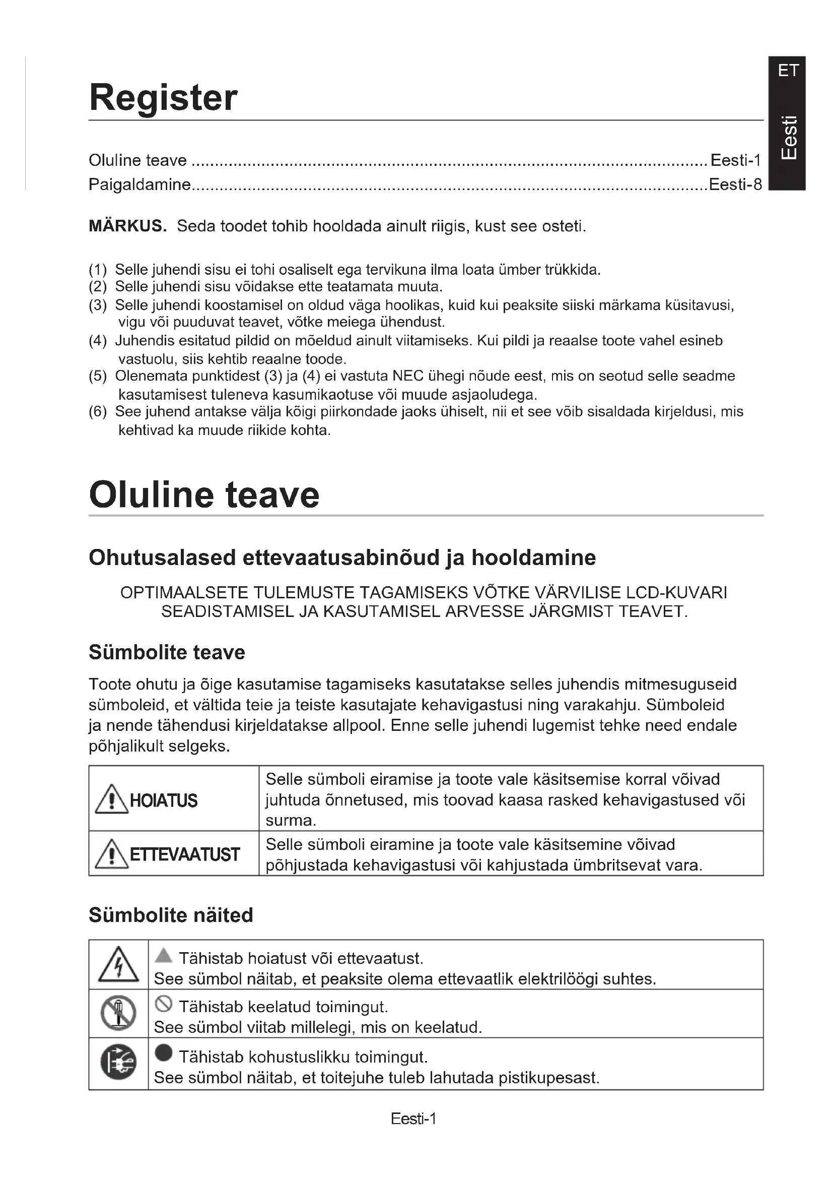 Eesti Oluline teave ...............................................................................................................Eesti-1 Paigaldamine...............................................................................................................Eesti-8 Register MÄRKUS. Seda toodet tohib hooldada ainult riigis, kust see osteti. (1) Selle juhendi sisu ei tohi osaliselt ega tervikuna ilma loata ümber trükkida.(2) Selle juhendi sisu võidakse ette teatamata muuta.(3) Selle juhendi koostamisel on oldud väga hoolikas, kuid kui peaksite siiski märkama küsitavusi, vigu või puuduvat teavet, võtke meiega ühendust.(4) Juhendis esitatud pildid on mõeldud ainult viitamiseks. Kui pildi ja reaalse toote vahel esineb vastuolu, siis kehtib reaalne toode.(5) Olenemata punktidest (3) ja (4) ei vastuta NEC ühegi nõude eest, mis on seotud selle seadme kasutamisest tuleneva kasumikaotuse või muude asjaoludega.(6) See juhend antakse välja kõigi piirkondade jaoks ühiselt, nii et see võib sisaldada kirjeldusi, mis kehtivad ka muude riikide kohta. Oluline teave Ohutusalased ettevaatusabinõud ja hooldamine OPTIMAALSETE TULEMUSTE TAGAMISEKS VÕTKE VÄRVILISE LCD-KUVARI SEADISTAMISEL JA KASUTAMISEL ARVESSE JÄRGMIST TEAVET. Sümbolite teave Toote ohutu ja õige kasutamise tagamiseks kasutatakse selles juhendis mitmesuguseid sümboleid, et vältida teie ja teiste kasutajate kehavigastusi ning varakahju. Sümboleid ja nende tähendusi kirjeldatakse allpool. Enne selle juhendi lugemist tehke need endale põhjalikult selgeks. HOIATUS Selle sümboli eiramise ja toote vale käsitsemise korral võivad juhtuda õnnetused, mis toovad kaasa rasked kehavigastused või surma. ETTEVAATUST Selle sümboli eiramine ja toote vale käsitsemine võivad põhjustada kehavigastusi või kahjustada ümbritsevat vara. Sümbolite näited Tähistab hoiatust või ettevaatust. See sümbol näitab, et peaksite olema ettevaatlik elektrilöögi suhtes. Tähistab keelatud toimingut. See sümbol viitab millelegi, mis on keelatud. Tähistab kohustuslikku toimingut. See sümbol näitab, et toitejuhe tuleb lahutada pistikupesast.Eesti-2 HOIATUS