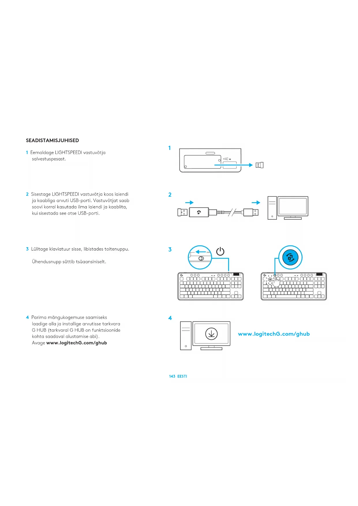 .143 EESTI SEADISTAMISJUHISED 1 Eemaldage LIGHTSPEEDI vastuvõtja salvestuspesast. 2 Sisestage LIGHTSPEEDI vastuvõtja koos laiendi ja kaabliga arvuti USB-porti. Vastuvõtjat saab soovi korral kasutada ilma laiendi ja kaablita, kuisisestada see otse USB-porti. 3 Lülitage klaviatuur sisse, libistades toitenuppu. Ühendusnupp süttib tsüaansiniselt. 4 Parima mängukogemuse saamiseks laadige allaja installige arvutisse tarkvara G HUB (tarkvaral G HUB on funktsioonide kohta saadaval alustamise abi). Avagewww.logitechG.com/ghub