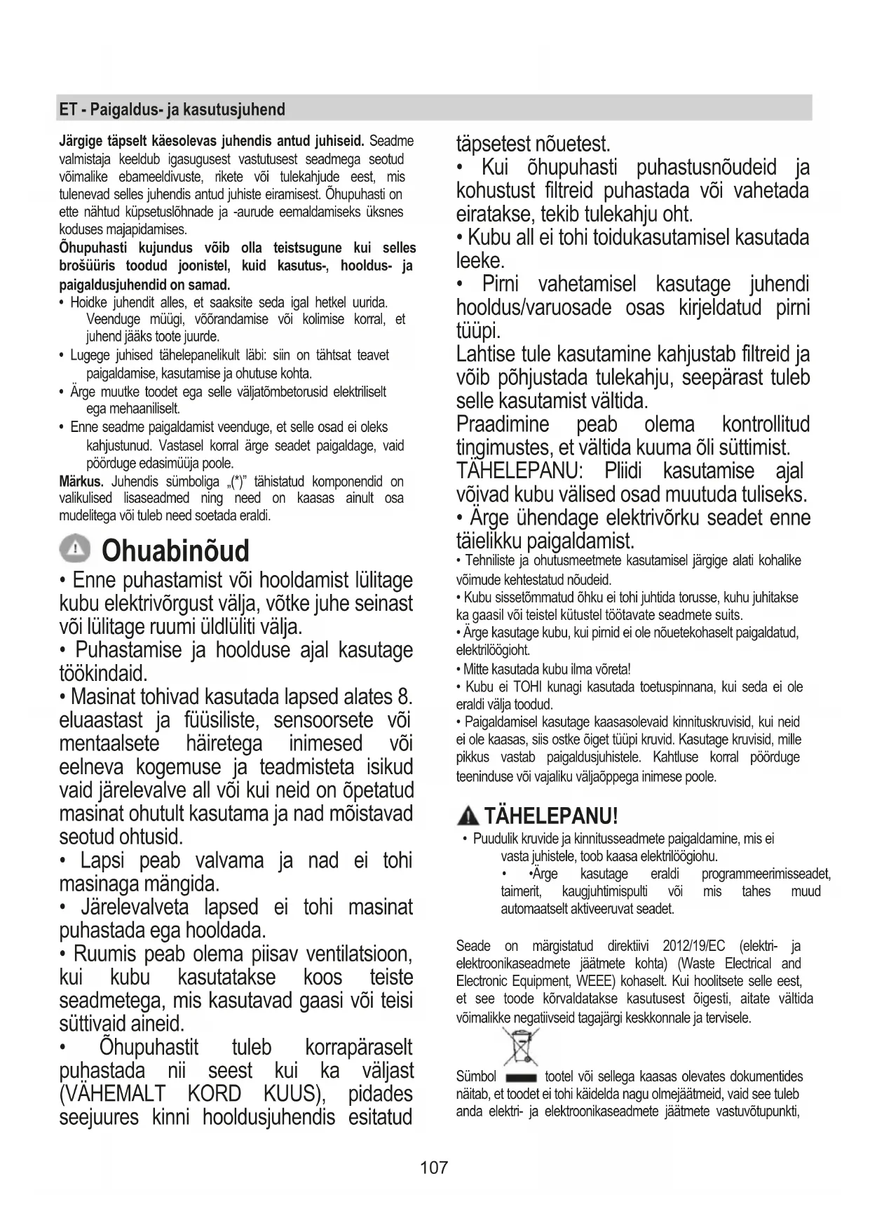 Ɏɢɥɶɬɪɝɟ ɡɚԕɵɦ ɤɟɥɬɿɪɦɟɣ ɚɪɬɵԕ ɫɭɞɵ ɚɥɵɩ ɬɚɫɬɚԙɵɡ ɞɚ ɮɢɥɶɬɪɞɿԙ ɚɪɬԕɵ ɛԧɥɿɝɿɧ ɬɨɥɵԕ ɤɟɩɬɿɪɭ ԛɲɿɧ ɨɧɵ 10 ɦɢɧɭɬԕɚ 100°C, ɬɟɦɩɟɪɚɬɭɪɚɞɚԑɵ ɞɭɯɨɜɤɚԑɚ ɫɚɥɵԙɵɡ. 3 ɠɵɥ ɫɚɣɵɧ ɠԥɧɟ ɦɚɬɟɪɢɚɥ ɡɚԕɵɦɞɚɧԑɚɧ ɫɚɣɵɧ ԕɨɫɵɦɲɚ ɛɟɬɬɿ ɚɭɵɫɬɵɪɵɩ ɬԝɪɵԙɵɡ. ɓɛɧ ɛɮɶɬɭɶɫɮ Ʉɨɪɩɭɫ ɠɚɪɵԕ ɞɢɨɞ ɬɟɯɧɨɥɨɝɢɹɫɵɧɚ ɧɟɝɿɡɞɟɥɝɟɧ ɠɚɪɵԕ ɠԛɣɟɫɿɦɟɧ ɠɚɛɞɵԕɬɚɥԑɚɧ. ɀɚɪɵԕ ɞɢɨɞɬɚɪɵ ɨԙɬɚɣɥɵ ɠɚɪɵԕɬɵ, ԥɞɟɬɬɟɝɿ ɲɚɦɞɚɪɞɚɧ 10 ɟɫɟ ɚɪɬɵԕ ԝɡɚԕɬɵԕɬɵ ԕɚɦɬɚɦɚɫɵɡ ɟɬɟɞɿ ɠԥɧɟ 90% ɷɥɟɤɬɪ ɷɧɟɪɝɢɹɫɵɧ ɫɚԕɬɚɭԑɚ ɦԛɦɤɿɧɞɿɤ ɛɟɪɟɞɿ. ɒɚɦɞɚɪɞɵ ɚɭɵɫɬɵɪɭ ԛɲɿɧ, ԧɤɿɥɟɬɬɿ ԕɨɫɚɥԕɵ ɛԧɥɲɟɤɬɟɪ ɨɪɬɚɥɵԑɵɧɚ ɯɚɛɚɪɥɚɫɵԙɵɡ.107 ET - Paigaldus- ja kasutusjuhend Järgige täpselt käesolevas juhendis antud juhiseid. Seadme valmistaja keeldub igasugusest vastutusest seadmega seotud võimalike ebameeldivuste, rikete või tulekahjude eest, mis tulenevad selles juhendis antud juhiste eiramisest. Õhupuhasti on ette nähtud küpsetuslõhnade ja -aurude eemaldamiseks üksnes koduses majapidamises. Õhupuhasti kujundus võib olla teistsugune kui selles brošüüris toodud joonistel, kuid kasutus-, hooldus- ja paigaldusjuhendid on samad.