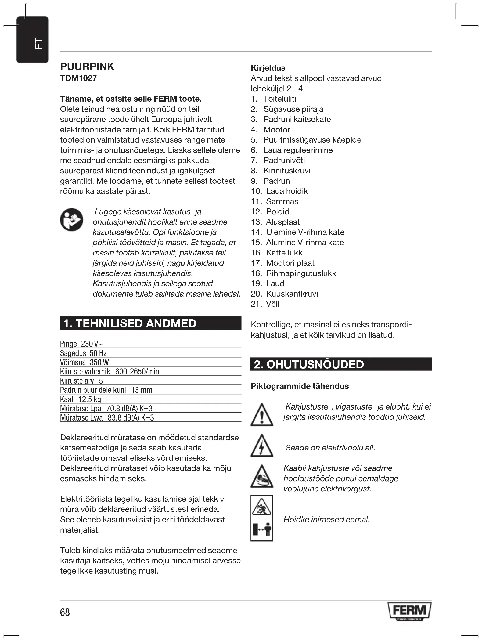 PUURPINK TDM1027 Täname, et ostsite selle FERM toote. Olete teinud hea ostu ning nüüd on teil suurepärane toode ühelt Euroopa juhtivalt elektritööriistade tarnijalt. Kõik FERM tarnitud tooted on valmistatud vastavuses rangeimate toimimis- ja ohutusnõuetega. Lisaks sellele oleme me seadnud endale eesmärgiks pakkuda suurepärast klienditeenindust ja igakülgset garantiid. Me loodame, et tunnete sellest tootest rõõmu ka aastate pärast. Lugege käesolevat kasutus- ja ohutusjuhendit hoolikalt enne seadme kasutuselevõttu. Õpi funktsioone ja põhilisi töövõtteid ja masin. Et tagada, et masin töötab korralikult, palutakse teil järgida neid juhiseid, nagu kirjeldatud käesolevas kasutusjuhendis. Kasutusjuhendis ja sellega seotud dokumente tuleb säilitada masina lähedal.