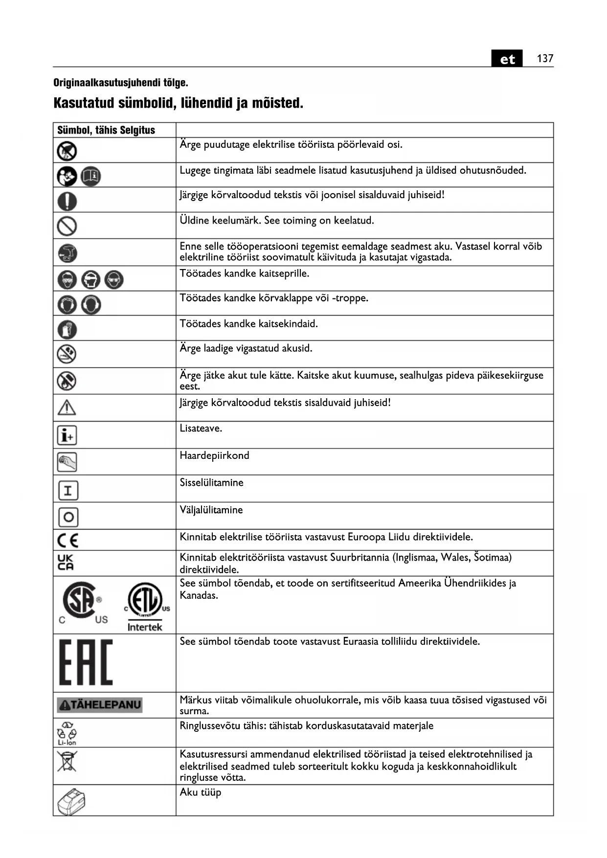 Originaalkasutusjuhendi tõlge. Kasutatud sümbolid, lühendid ja mõisted. Sümbol, tähis Selgitus Ärge puudutage elektrilise tööriista pöörlevaid osi. Lugege tingimata läbi seadmele lisatud kasutusjuhend ja üldised ohutusnõuded. Järgige kõrvaltoodud tekstis või joonisel sisalduvaid juhiseid! Üldine keelumärk. See toiming on keelatud. Enne selle tööoperatsiooni tegemist eemaldage seadmest aku. Vastasel korral võib elektriline tööriist soovimatult käivituda ja kasutajat vigastada. Töötades kandke kaitseprille. Töötades kandke kõrvaklappe või -troppe. Töötades kandke kaitsekindaid. Ärge laadige vigastatud akusid. Ärge jätke akut tule kätte. Kaitske akut kuumuse, sealhulgas pideva päikesekiirguse eest. Järgige kõrvaltoodud tekstis sisalduvaid juhiseid! Lisateave. Haardepiirkond Sisselülitamine Väljalülitamine Kinnitab elektrilise tööriista vastavust Euroopa Liidu direktiividele. Kinnitab elektritööriista vastavust Suurbritannia (Inglismaa, Wales, Šotimaa) direktiividele. See sümbol tõendab, et toode on sertifitseeritud Ameerika Ühendriikides ja Kanadas. See sümbol tõendab toote vastavust Euraasia tolliliidu direktiividele. Märkus viitab võimalikule ohuolukorrale, mis võib kaasa tuua tõsised vigastused või surma. Ringlussevõtu tähis: tähistab korduskasutatavaid materjale Kasutusressursi ammendanud elektrilised tööriistad ja teised elektrotehnilised ja elektrilised seadmed tuleb sorteeritult kokku koguda ja keskkonnahoidlikult ringlusse võtta. Aku tüüp138