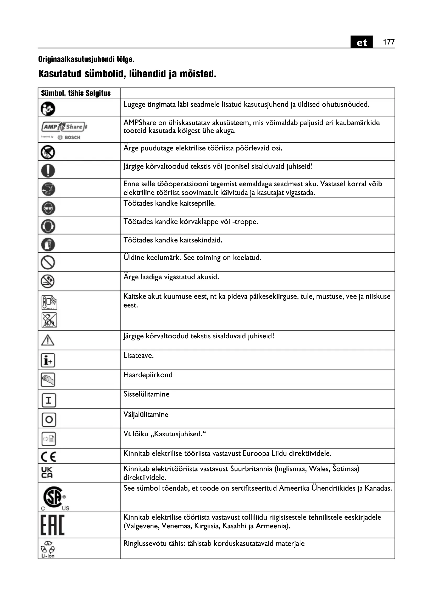 Originaalkasutusjuhendi tõlge. Kasutatud sümbolid, lühendid ja mõisted. Sümbol, tähis Selgitus Lugege tingimata läbi seadmele lisatud kasutusjuhend ja üldised ohutusnõuded. AMPShare on ühiskasutatav akusüsteem, mis võimaldab paljusid eri kaubamärkide tooteid kasutada kõigest ühe akuga. Ärge puudutage elektrilise tööriista pöörlevaid osi. Järgige kõrvaltoodud tekstis või joonisel sisalduvaid juhiseid! Enne selle tööoperatsiooni tegemist eemaldage seadmest aku. Vastasel korral võib elektriline tööriist soovimatult käivituda ja kasutajat vigastada. Töötades kandke kaitseprille. Töötades kandke kõrvaklappe või -troppe. Töötades kandke kaitsekindaid. Üldine keelumärk. See toiming on keelatud. Ärge laadige vigastatud akusid. Kaitske akut kuumuse eest, nt ka pideva päikesekiirguse, tule, mustuse, vee ja niiskuse eest. Järgige kõrvaltoodud tekstis sisalduvaid juhiseid! Lisateave. Haardepiirkond Sisselülitamine Väljalülitamine Vt lõiku „Kasutusjuhised.“ Kinnitab elektrilise tööriista vastavust Euroopa Liidu direktiividele. Kinnitab elektritööriista vastavust Suurbritannia (Inglismaa, Wales, Šotimaa) direktiividele. See sümbol tõendab, et toode on sertifitseeritud Ameerika Ühendriikides ja Kanadas. Kinnitab elektrilise tööriista vastavust tolliliidu riigisisestele tehnilistele eeskirjadele (Valgevene, Venemaa, Kirgiisia, Kasahhi ja Armeenia). Ringlussevõtu tähis: tähistab korduskasutatavaid materjale max.50°C178