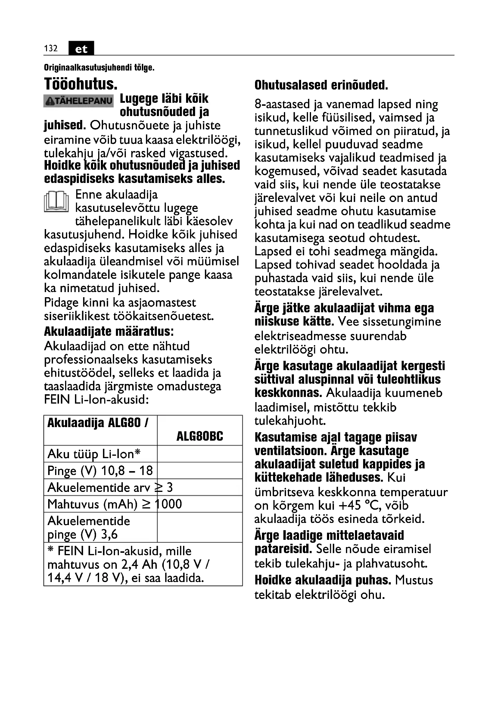 Originaalkasutusjuhendi tõlge. Tööohutus. Lugege läbi kõik ohutusnõuded ja juhised. Ohutusnõuete ja juhiste eiramine võib tuua kaasa elektrilöögi, tulekahju ja/või rasked vigastused. Hoidke kõik ohutusnõuded ja juhised edaspidiseks kasutamiseks alles. Enne akulaadija kasutuselevõttu lugege tähelepanelikult läbi käesolev kasutusjuhend. Hoidke kõik juhised edaspidiseks kasutamiseks alles ja akulaadija üleandmisel või müümisel kolmandatele isikutele pange kaasa ka nimetatud juhised. Pidage kinni ka asjaomastest siseriiklikest töökaitsenõuetest. Akulaadijate määratlus: Akulaadijad on ette nähtud professionaalseks kasutamiseks ehitustöödel, selleks et laadida ja taaslaadida järgmiste omadustega FEIN Li-Ion-akusid: Ohutusalased erinõuded. 8-aastased ja vanemad lapsed ning isikud, kelle füüsilised, vaimsed ja tunnetuslikud võimed on piiratud, ja isikud, kellel puuduvad seadme kasutamiseks vajalikud teadmised ja kogemused, võivad seadet kasutada vaid siis, kui nende üle teostatakse järelevalvet või kui neile on antud juhised seadme ohutu kasutamise kohta ja kui nad on teadlikud seadme kasutamisega seotud ohtudest. Lapsed ei tohi seadmega mängida. Lapsed tohivad seadet hooldada ja puhastada vaid siis, kui nende üle teostatakse järelevalvet. Ärge jätke akulaadijat vihma ega niiskuse kätte. Vee sissetungimine elektriseadmesse suurendab elektrilöögi ohtu. Ärge kasutage akulaadijat kergesti süttival aluspinnal või tuleohtlikus keskkonnas. Akulaadija kuumeneb laadimisel, mistõttu tekkib tulekahjuoht. Kasutamise ajal tagage piisav ventilatsioon. Ärge kasutage akulaadijat suletud kappides ja küttekehade läheduses. Kui ümbritseva keskkonna temperatuur on kõrgem kui +45 °C, võib akulaadija töös esineda tõrkeid. Ärge laadige mittelaetavaid patareisid. Selle nõude eiramisel tekib tulekahju- ja plahvatusoht. Hoidke akulaadija puhas. Mustus tekitab elektrilöögi ohu. Akulaadija ALG80 / ALG80BC Aku tüüp Li-Ion* Pinge (V) 10,8 – 18 Akuelementide arv ≥ 3 Mahtuvus (mAh) ≥ 1000 Akuelementide pinge (V) 3,6