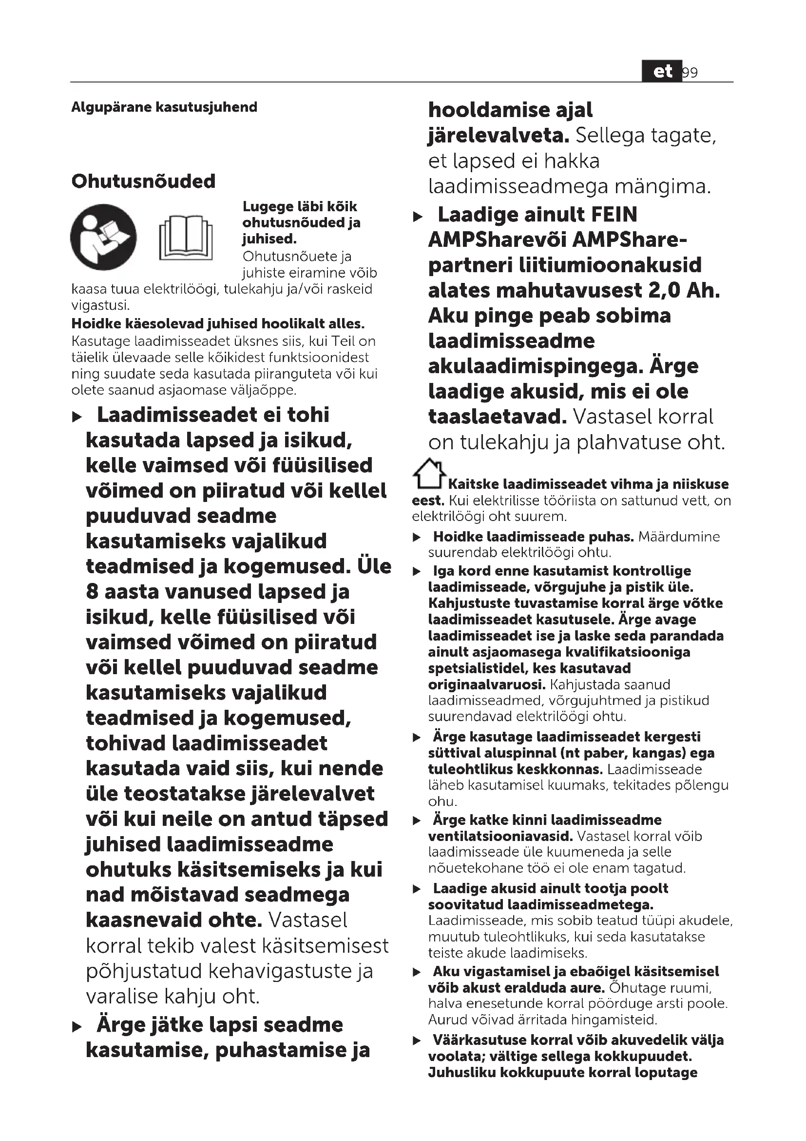 Не изхвърляйте зарядните устройс- тва при битовите отпадъци! Само за страни отЕС:Български Съгласно Европейска директива 2012/19/EС относно отпадъци от електрическо и елект- ронно оборудване и утвърждаването й от на- ционалното законодателство зарядни уст- ройства, които не могат да се използват пове- че, трябва да се събират отделно и да бъдат предавани за оползотворяване на съдържащи- те се в тях суровини. При неправилно изхвърляне старите електри- чески и електронни уреди поради възможното наличие на опасни вещества могат да окажат вредни влияния върху околната среда и чо- вешкото здраве. 98 bg 34101363060 • 1.6.22Algupärane kasutusjuhend OhutusnõudedEesti Lugege läbi kõik ohutusnõuded ja juhised. Ohutusnõuete ja juhiste eiramine võib kaasa tuua elektrilöögi, tulekahju ja/või raskeid vigastusi. Hoidke käesolevad juhised hoolikalt alles. Kasutage laadimisseadet üksnes siis, kui Teil on täielik ülevaade selle kõikidest funktsioonidest ning suudate seda kasutada piiranguteta või kui olete saanud asjaomase väljaõppe. u Laadimisseadet ei tohi kasutada lapsed ja isikud, kelle vaimsed või füüsilised võimed on piiratud või kellel puuduvad seadme kasutamiseks vajalikud teadmised ja kogemused. Üle 8 aasta vanused lapsed ja isikud, kelle füüsilised või vaimsed võimed on piiratud või kellel puuduvad seadme kasutamiseks vajalikud teadmised ja kogemused, tohivad laadimisseadet kasutada vaid siis, kui nende üle teostatakse järelevalvet või kui neile on antud täpsed juhised laadimisseadme ohutuks käsitsemiseks ja kui nad mõistavad seadmega kaasnevaid ohte. Vastasel korral tekib valest käsitsemisest põhjustatud kehavigastuste ja varalise kahju oht. u Ärge jätke lapsi seadme kasutamise, puhastamise ja hooldamise ajal järelevalveta. Sellega tagate, et lapsed ei hakka laadimisseadmega mängima. u Laadige ainult FEIN AMPSharevõi AMPShare- partneri liitiumioonakusid alates mahutavusest 2,0Ah. Aku pinge peab sobima laadimisseadme akulaadimispingega. Ärge laadige akusid, mis ei ole taaslaetavad. Vastasel korral on tulekahju ja plahvatuse oht. Kaitske laadimisseadet vihma ja niiskuse eest. Kui elektrilisse tööriista on sattunud vett, on elektrilöögi oht suurem. u Hoidke laadimisseade puhas. Määrdumine suurendab elektrilöögi ohtu. u Iga kord enne kasutamist kontrollige laadimisseade, võrgujuhe ja pistik üle. Kahjustuste tuvastamise korral ärge võtke laadimisseadet kasutusele. Ärge avage laadimisseadet ise ja laske seda parandada ainult asjaomasega kvalifikatsiooniga spetsialistidel, kes kasutavad originaalvaruosi. Kahjustada saanud laadimisseadmed, võrgujuhtmed ja pistikud suurendavad elektrilöögi ohtu. u Ärge kasutage laadimisseadet kergesti süttival aluspinnal (nt paber, kangas) ega tuleohtlikus keskkonnas. Laadimisseade läheb kasutamisel kuumaks, tekitades põlengu ohu. u Ärge katke kinni laadimisseadme ventilatsiooniavasid. Vastasel korral võib laadimisseade üle kuumeneda ja selle nõuetekohane töö ei ole enam tagatud. u Laadige akusid ainult tootja poolt soovitatud laadimisseadmetega. Laadimisseade, mis sobib teatud tüüpi akudele, muutub tuleohtlikuks, kui seda kasutatakse teiste akude laadimiseks. u Aku vigastamisel ja ebaõigel käsitsemisel võib akust eralduda aure. Õhutage ruumi, halva enesetunde korral pöörduge arsti poole. Aurud võivad ärritada hingamisteid. u Väärkasutuse korral võib akuvedelik välja voolata; vältige sellega kokkupuudet. Juhusliku kokkupuute korral loputage et 99 34101363060 • 1.6.22kahjustatud kohta veega. Kui vedelik satub silma, pöörduge lisaks arsti poole. Väljavoolav akuvedelik võib põhjustada nahaärritusi või põletusi. u Ärge kasutage laadimisseadet suletud kappides või soojusallikate läheduses. Vastasel korral võib laadimisseade üle kuumeneda ja selle nõuetekohane töö ei ole enam tagatud. u Kui laadimisseadet pikemat aega ei kasutata, eemaldage aku laadimisseadmest ja tõmmake võrgupistik välja. Energia säästmine on keskkonnahoidlik. u Puhastustöödeks tõmmake laadimisseadme võrgupistik pistikupesast välja. On elektrilöögioht. u Ärge kruvige ega neetige laadimisseadmele mitte mingeid silte või tähiseid. Vigastatud isolatsioon ei kaitse elektrilöögi eest. Kasutage selle asemel kleebitavaid silte. Toote kirjeldus ja kasutusjuhendEesti Nõuetekohane kasutamineEesti Laadimisseade on ette nähtud taaslaetavate FEIN AMPShare või AMPShare-partnerite Li-Ion-akude laadimiseks. Kujutatud komponendidEesti Seadme osade numeratsiooni aluseks on jooniste leheküljel toodud joonised. (1) Laadimispesa (2) Kaablitrummel (3) Aku roheline laadimisnäit (4) Aku punane laadimisnäit Tehnilised andmedEesti Akulaadija GAL 1880 CV Tootenumber 9 26 04 332 00 0