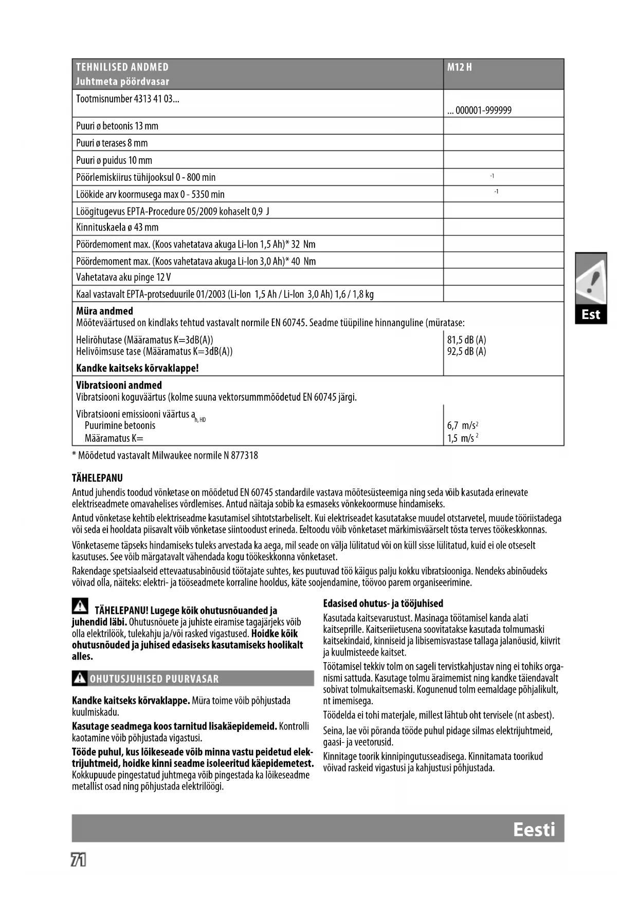 - Mõõdetud vastavalt Milwaukee normile N 877318 TÄHELEPANU Antud juhendis toodud võnketase on mõõdetud EN 60745 standardile vastava mõõtesüsteemiga ning seda võib kasutada erinevate elektriseadmete omavahelises võrdlemises. Antud näitaja sobib ka esmaseks võnkekoormuse hindamiseks. Antud võnketase kehtib elektriseadme kasutamisel sihtotstarbeliselt. Kui elektriseadet kasutatakse muudel otstarvetel, muude tööriistadega või seda ei hooldata piisavalt võib võnketase siintoodust erineda. Eeltoodu võib võnketaset märkimisväärselt tõsta terves töökeskkonnas. Võnketaseme täpseks hindamiseks tuleks arvestada ka aega, mil seade on välja lülitatud või on küll sisse lülitatud, kuid ei ole otseselt kasutuses. See võib märgatavalt vähendada kogu töökeskkonna võnketaset. Rakendage spetsiaalseid ettevaatusabinõusid töötajate suhtes, kes puutuvad töö käigus palju kokku vibratsiooniga. Nendeks abinõudeks võivad olla, näiteks: elektri- ja tööseadmete korraline hooldus, käte soojendamine, töövoo parem organiseerimine.72 Est Eesti Palun lülitage seade rakendustööriista blokeerumise korral kohe välja! Ärge lülitage seadet sisse tagasi, kuni rakendustööriist on blokeeritud; seejuures võib kõrge reaktsioonimomendiga tagasilöök tekkida. Tehke ohutusjuhiseid arvesse võttes kindlaks ja kõrvaldage rakendustööriista blokeerumise põhjus. Automaatse seiskumise võimalikud põhjused: