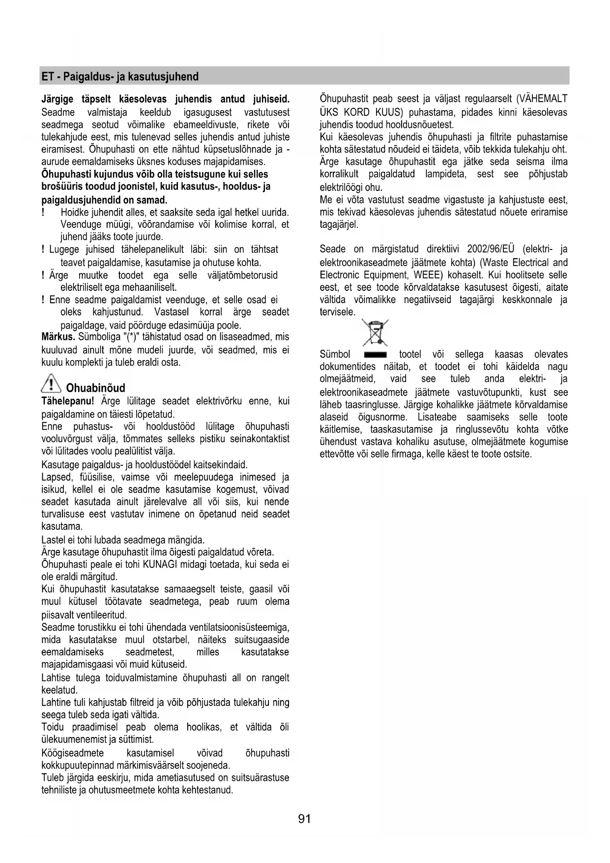 Якщо система підсвітки не працює, перевірте вірну установку ламп в гнізда, перед тим як звертатися до центру технічної допомоги. - Модель з LED лампами Витяжка обладнана системою освітлення на основі технології діодів (LED). ДІОДИ забезпечують оптимальне освітлення, тривалість їх в 10 раз вища від звичайних лампочок та дають 90% економії електроенергії. Щодо їх заміни звертайтеся до служби технічного обслуговування.91 ET - Paigaldus- ja kasutusjuhend Järgige täpselt käesolevas juhendis antud juhiseid. Seadme valmistaja keeldub igasugusest vastutusest seadmega seotud võimalike ebameeldivuste, rikete või tulekahjude eest, mis tulenevad selles juhendis antud juhiste eiramisest. Õhupuhasti on ette nähtud küpsetuslõhnade ja - aurude eemaldamiseks üksnes koduses majapidamises. Õhupuhasti kujundus võib olla teistsugune kui selles brošüüris toodud joonistel, kuid kasutus-, hooldus- ja paigaldusjuhendid on samad. ! Hoidke juhendit alles, et saaksite seda igal hetkel uurida. Veenduge müügi, võõrandamise või kolimise korral, et juhend jääks toote juurde. ! Lugege juhised tähelepanelikult läbi: siin on tähtsat teavet paigaldamise, kasutamise ja ohutuse kohta. ! Ärge muutke toodet ega selle väljatõmbetorusid elektriliselt ega mehaaniliselt. ! Enne seadme paigaldamist veenduge, et selle osad ei oleks kahjustunud. Vastasel korral ärge seadet paigaldage, vaid pöörduge edasimüüja poole. Märkus. Sümboliga "(*)" tähistatud osad on lisaseadmed, mis kuuluvad ainult mõne mudeli juurde, või seadmed, mis ei kuulu komplekti ja tuleb eraldi osta. Ohuabinõud Tähelepanu! Ärge lülitage seadet elektrivõrku enne, kui paigaldamine on täiesti lõpetatud. Enne puhastus- või hooldustööd lülitage õhupuhasti vooluvõrgust välja, tõmmates selleks pistiku seinakontaktist või lülitades voolu pealülitist välja. Kasutage paigaldus- ja hooldustöödel kaitsekindaid. Lapsed, füüsilise, vaimse või meelepuudega inimesed ja isikud, kellel ei ole seadme kasutamise kogemust, võivad seadet kasutada ainult järelevalve all või siis, kui nende turvalisuse eest vastutav inimene on õpetanud neid seadet kasutama. Lastel ei tohi lubada seadmega mängida. Ärge kasutage õhupuhastit ilma õigesti paigaldatud võreta. Õhupuhasti peale ei tohi KUNAGI midagi toetada, kui seda ei ole eraldi märgitud. Kui õhupuhastit kasutatakse samaaegselt teiste, gaasil või muul kütusel töötavate seadmetega, peab ruum olema piisavalt ventileeritud. Seadme torustikku ei tohi ühendada ventilatsioonisüsteemiga, mida kasutatakse muul otstarbel, näiteks suitsugaaside eemaldamiseks seadmetest, milles kasutatakse majapidamisgaasi või muid kütuseid. Lahtise tulega toiduvalmistamine õhupuhasti all on rangelt keelatud. Lahtine tuli kahjustab filtreid ja võib põhjustada tulekahju ning seega tuleb seda igati vältida. Toidu praadimisel peab olema hoolikas, et vältida õli ülekuumenemist ja süttimist. Köögiseadmete kasutamisel võivad õhupuhasti kokkupuutepinnad märkimisväärselt soojeneda. Tuleb järgida eeskirju, mida ametiasutused on suitsuärastuse tehniliste ja ohutusmeetmete kohta kehtestanud. Õhupuhastit peab seest ja väljast regulaarselt (VÄHEMALT ÜKS KORD KUUS) puhastama, pidades kinni käesolevas juhendis toodud hooldusnõuetest. Kui käesolevas juhendis õhupuhasti ja filtrite puhastamise kohta sätestatud nõudeid ei täideta, võib tekkida tulekahju oht. Ärge kasutage õhupuhastit ega jätke seda seisma ilma korralikult paigaldatud lampideta, sest see põhjustab elektrilöögi ohu. Me ei võta vastutust seadme vigastuste ja kahjustuste eest, mis tekivad käesolevas juhendis sätestatud nõuete eriramise tagajärjel. Seade on märgistatud direktiivi 2002/96/EÜ (elektri- ja elektroonikaseadmete jäätmete kohta) (Waste Electrical and Electronic Equipment, WEEE) kohaselt. Kui hoolitsete selle eest, et see toode kõrvaldatakse kasutusest õigesti, aitate vältida võimalikke negatiivseid tagajärgi keskkonnale ja tervisele. Sümbol tootel või sellega kaasas olevates dokumentides näitab, et toodet ei tohi käidelda nagu olmejäätmeid, vaid see tuleb anda elektri- ja elektroonikaseadmete jäätmete vastuvõtupunkti, kust see läheb taasringlusse. Järgige kohalikke jäätmete kõrvaldamise alaseid õigusnorme. Lisateabe saamiseks selle toote käitlemise, taaskasutamise ja ringlussevõtu kohta võtke ühendust vastava kohaliku asutuse, olmejäätmete kogumise ettevõtte või selle firmaga, kelle käest te toote ostsite.92 Kasutamine Õhupuhasti on valmistatud nii, et seda saaks kasutada nii väljatõmberežiimis kui ka õhku filtreeriva toasisese tsirkulatsiooniga režiimis. Väljatõmberežiim Aur viiakse välja ühendusääriku külge kinnitatud väljatõmbetoru abil. Väljatõmbetoru diameeter peab olema sama suur kui ühendusvõru oma. Tähelepanu! Väljatõmbetoru ei kuulu komplekti ja tuleb ise osta. Toru horisontaalne lõik peab olema kergelt ülespoole kaldu (umbes 10°), et õhku kergemini väliskeskkonda viia. Kui õhupuhastil on söefiltrid, tuleb need eemaldada. Ühendage õhupuhasti väljatõmbetorude ja seinal asuvate väljalaskeavadega, mille diameeter on võrdne õhupuhasti väljalaskeava (ühendusäärikuga) omaga. Peenemate torude ja väiksemate seinal asuvate väljalaskeavade kasutamisel väheneb tõmme ja suureneb oluliselt müra. Seetõttu ei võta meie sellisel juhul endale mingit vastutust. ! Kasutage minimaalse vajaliku pikkusega toru. ! Kasutage võimalikult väheste põlvedega toru (torupõlve maksimaalne nurk: 90°). ! Vältige toru ristlõike olulist muutumist. ! Kasutage võimalikult sileda sisepinnaga toru. ! Toru m