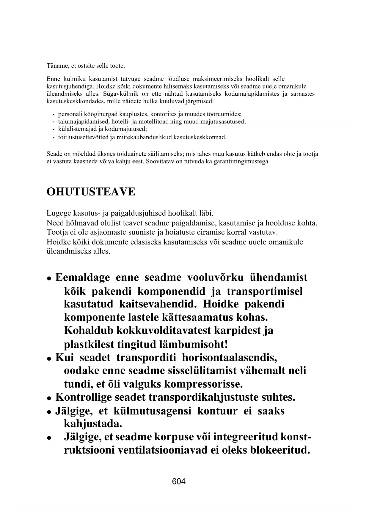 VEAOTSING ........................................................................................ 626604 Täname, et ostsite selle toote. Enne külmiku kasutamist tutvuge seadme jõudluse maksimeerimiseks hoolikalt selle kasutusjuhendiga. Hoidke kõiki dokumente hilisemaks kasutamiseks või seadme uuele omanikule üleandmiseks alles. Sügavkülmik on ette nähtud kasutamiseks kodumajapidamistes ja sarnastes kasutuskeskkondades, mille näidete hulka kuuluvad järgmised: - personali kööginurgad kauplustes, kontorites ja muudes tööruumides; - talumajapidamised, hotelli- ja motellitoad ning muud majutusasutused; - külalistemajad ja kodumajutused; - toitlustusettevõtted ja mittekaubanduslikud kasutuskeskkonnad. Seade on mõeldud üksnes toiduainete säilitamiseks; mis tahes muu kasutus kätkeb endas ohte ja tootja ei vastuta kaasneda võiva kahju eest. Soovitatav on tutvuda ka garantiitingimustega. OHUTUSTEAVE Lugege kasutus- ja paigaldusjuhised hoolikalt läbi. Need hõlmavad olulist teavet seadme paigaldamise, kasutamise ja hoolduse kohta. Tootja ei ole asjaomaste suuniste ja hoiatuste eiramise korral vastutav. Hoidke kõiki dokumente edasiseks kasutamiseks või seadme uuele omanikule üleandmiseks alles. ⚫ Eemaldage enne seadme vooluvõrku ühendamist kõik pakendi komponendid ja transportimisel kasutatud kaitsevahendid. Hoidke pakendi komponente lastele kättesaamatus kohas. Kohaldub kokkuvolditavatest karpidest ja plastkilest tingitud lämbumisoht! ⚫ Kui seadet transporditi horisontaalasendis, oodake enne seadme sisselülitamist vähemalt neli tundi, et õli valguks kompressorisse. ⚫ Kontrollige seadet transpordikahjustuste suhtes. ⚫ Jälgige, et külmutusagensi kontuur ei saaks kahjustada. ⚫ Jälgige, et seadme korpuse või integreeritud konst- ruktsiooni ventilatsiooniavad ei oleks blokeeritud.605 ⚫ Kompressori puhastamisel ei tohi kasutada vett; pühkige seda rooste tekke vältimiseks pärast puhastamist kuiva riidelapiga. ⚫ Seadet peab alati teisaldama vähemalt kaks inimest, sest see on raske. ⚫ Seade tuleb paigaldada ja nivelleerida kohas, mis on seadme mõõtmetele vastav ning seadme kasutamiseks sobiv. ⚫ Veenduge, et andmesildil välja toodud elektrilised parameetrid on toiteallikaga vastavuses. Lahknevuste korral võtke ühendust elektrikuga. ⚫ Seadme toiteallikas peab vastama järgmistele pa- rameetritele: 220–240 VAC / 50 Hz. Pinge ano- maalse kõikumisega võib kaasneda seadme mitte- käivitumine, temperatuuriregulaatori või komp- ressori kahjustumine või seadme käitamisaegne tavatu müra. Sellisel juhul tuleb paigaldada auto- maatregulaator. ⚫ Ainult Ühendkuningriigis: seadme toitekaablil on kolmejuhtmeline (maandusega) pistik, mis on ette nähtud ühendamiseks standardse kolmejuhtmelise (maandusega) pistikupesaga. Kolmandat kontakti (maandust) ei tohi ära lõigata ega demonteerida. Pistik peab pärast seadme paigaldamist ligipääse- tav olema. ⚫ Jälgige, et toitekaabel ei jääks seadme tõstmisel/teisaldamisel ja pärast paigaldamist seadme alla, et vältida toitekaabli purunemist või kahjustumist. Toitekaabli kahjustuste korral peab606 selle ohtude minimeerimiseks välja vahetama tootja, tootja volitatud hooldustehnik või sarnase kvalifikatsiooniga spetsialist. ⚫ Ärge paigaldage seadet kohta, kus see võiks puutuda kokku niiskuse, õli, tolmu, otsese päikesevalguse või veega. ⚫ Ärge paigaldage seadet küttekehade või kergsütti- vate ainete lähedusse. ⚫ Sügavkülmiku kambriga seadme puhul: voolukat- kestuse korral ärge avage külmiku ust. Külmuta- tud toiduaineid ei tohiks mõjutada see, kui voolu- katkestus on andmesildil osutatust (temperatuuri tõusu aja näitajast) lühem. Kui voolukatkestus kestab kauem, tuleb toiduaineid kontrollida ning kui need on sulanud, tuleb neid koheselt tarbida või kuumtöödelda ja seejärel uuesti külmutada. ⚫ Ärge muretsege, kui külmiku ust on vahetult pärast selle sulgemist raske avada. See on tingitud rõhkude erinevusest, mis ühtlustub: paari minuti möödudes tuleb uks tavapäraselt lahti. ⚫ Ärge hoidke seadmes ravimeid, baktereid ega kemikaale. Seade on mõeldud kasutamiseks kodukeskkonnas. Selles ei ole soovitatav hoida aineid, mille säilitamisele kohalduvad ranged temperatuurinõuded. ⚫ Ärge tõmmake ega painutage toitekaablit ülemäära ja ärge võtke pistikust kinni märgade kätega.607 ⚫ Ärge hoidke seadmes tuleohtlikku propellenti sisaldavaid tooteid (näiteks aerosoolpurke) ega plahvatusohtlikke aineid. Kohaldub plahvatusoht! ⚫ Ärge asetage külmikule ebastabiilseid esemeid (näiteks raskeid esemeid või veega täidetud anu- maid), et vältida eseme kukkumisega kaasnevaid kehavigastusi või veega kokkupuutest tingitud elektrilööki. ⚫ Ärge kasutage külmiku toiduainete hoiualades elektriseadmeid, kui nende tüüp ei ole vastavuses tootjapoolsete soovitustega. ⚫ Materjali pragunemise ja vigastuste vältimiseks ei tohi puudutada sisemisi jahutuselemente, eriti siis, kui käed on märjad. ⚫ See kohaldub eeskätt lastele, kasutajatele, kellel on piiratud füüsilised, vaimsed või sensoorsed võimed, ning neile, kellel on ebapiisavad teadmised seadme ohutu kasutamise osas. ⚫ Lapsed ja piiratud võimete või kogemustega isikud peavad mõistma seadme kasutamisega seonduvaid ohte. Ohutuse eest vastutaja peab seadet kasutavaid lapsi ja piiratud võimete või kogemustega isikuid jälgima või juhendama. Seadet tohivad kasutada lapsed alates kaheksandast eluaastast. ⚫ Lapsed ei tohi seadmega mängida. ⚫ Kolme kuni kaheksa aasta vanustel lastel on lubatud külmikusse toiduaineid panna ja neid sealt välja võtta.608 ⚫ Sügavkülmiku kambriga seadme puhul: ärge hoidke sügavkülmiku kambris karboniseeritud jooke ega vedelikega täidetud pudeleid või plekk- purke. Pudelid ja plekkpurgid võiksid lõhkeda. ⚫ Sügavkülmiku kambriga seadme puhul: ärge tarbige külmutatud toiduaineid kohe pärast nende sügavkülmiku kambrist välja võtmist. 