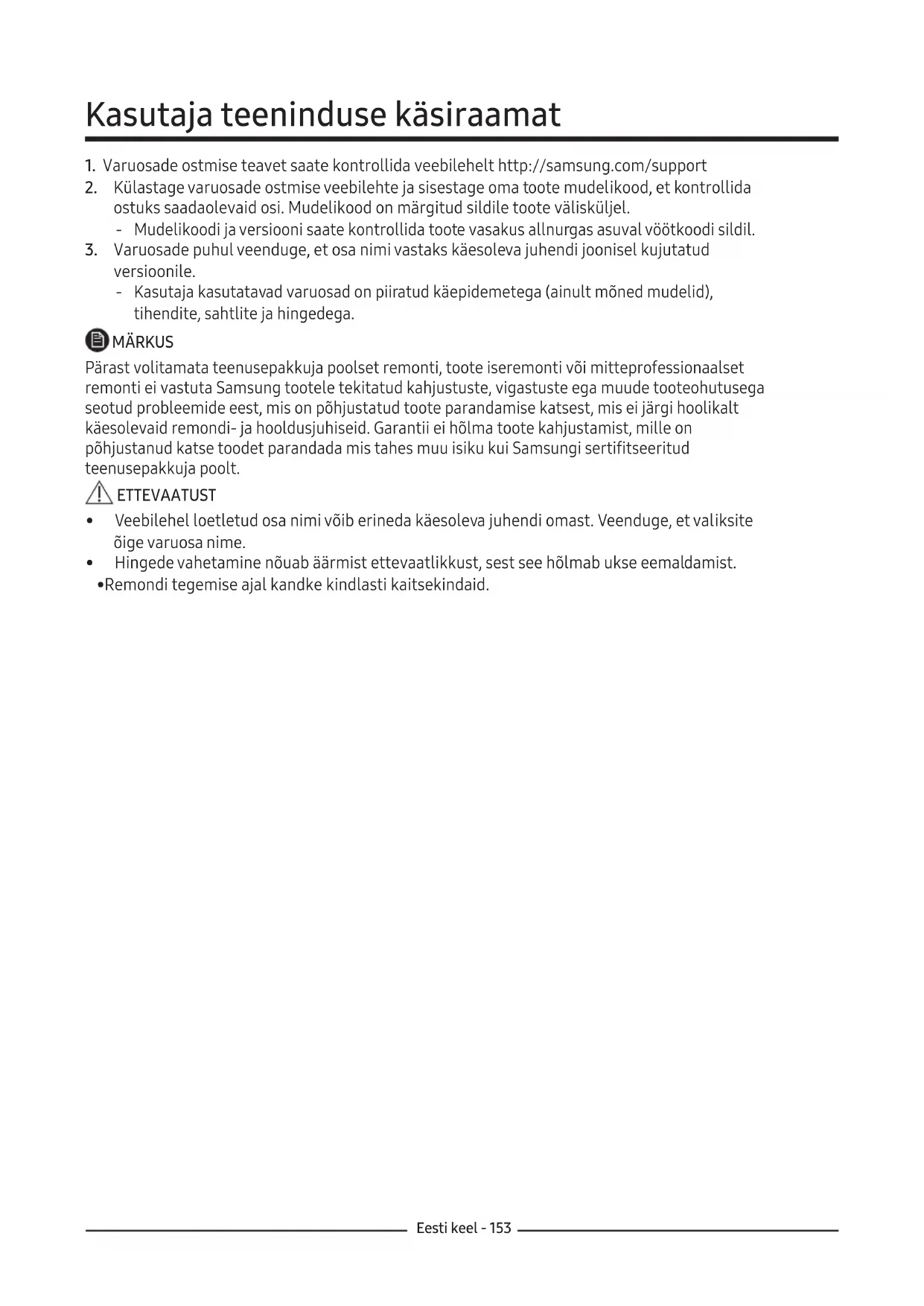 versioonile. ‐ Kasutaja kasutatavad varuosad on piiratud käepidemetega (ainult mõned mudelid), tihendite, sahtlite ja hingedega. MÄRKUS Pärast volitamata teenusepakkuja poolset remonti, toote iseremonti või mitteprofessionaalset remonti ei vastuta Samsung tootele tekitatud kahjustuste, vigastuste ega muude tooteohutusega seotud probleemide eest, mis on põhjustatud toote parandamise katsest, mis ei järgi hoolikalt käesolevaid remondi- ja hooldusjuhiseid. Garantii ei hõlma toote kahjustamist, mille on põhjustanud katse toodet parandada mis tahes muu isiku kui Samsungi sertifitseeritud teenusepakkuja poolt. ETTEVAATUST