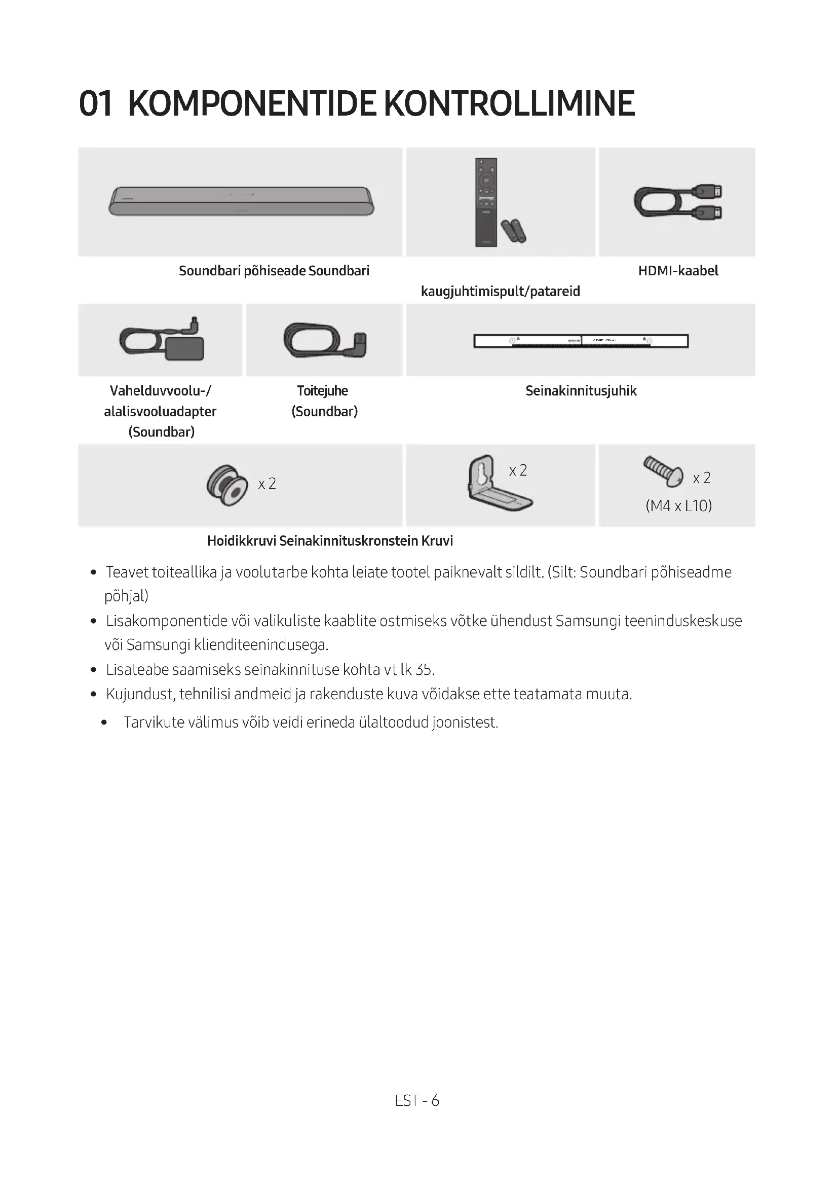 keskkonnale kahjulikke kemikaale. Ärge visake patareisid olmeprügisse. Ärge visake kasutatud patareisid tulle. Ärge laske patareidel lühistuda, ärge võtke neid koost lahti ega laske neil üle kuumeneda. ETTEVAATUST! : Patarei valesti paigaldamisel tekib plahvatusoht. Asendage ainult sama või samaväärset tüüpi patareiga.EST - 4 SISUKORD 01 Komponentide kontrollimine 6 02 Toote ülevaade 7 Soundbari alumine paneel ------------------------- 9 03 Kaugjuhtimispuldi kasutamine 10 Patareide sisestamine enne kaugjuhtimispuldi kasutamist (2 AAA-patareid) ------------------------- 10 Kuidas kaugjuhtimispulti kasutada?