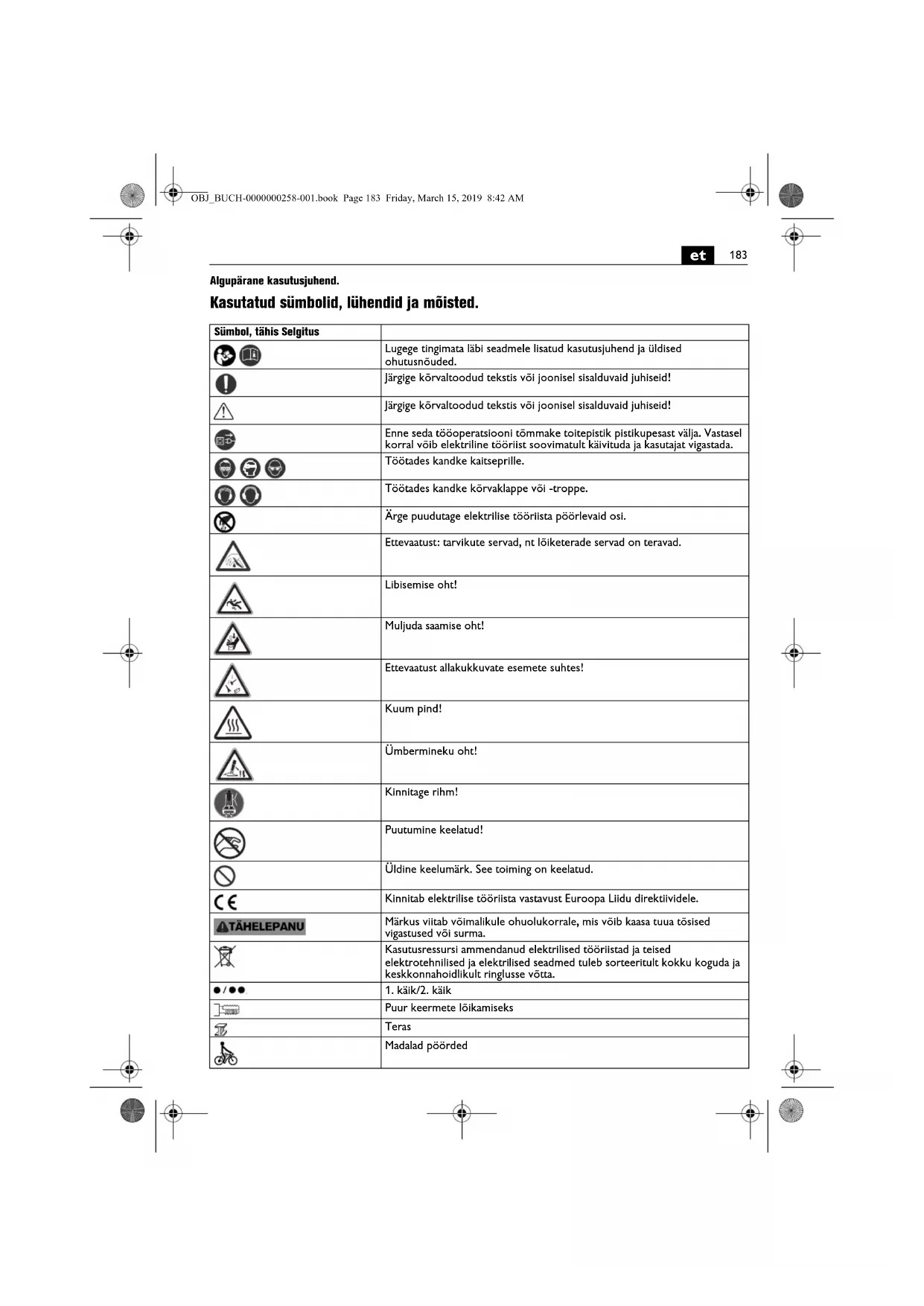 Algupärane kasutusjuhend. Kasutatud sümbolid, lühendid ja mõisted. Sümbol, tähis Selgitus Lugege tingimata läbi seadmele lisatud kasutusjuhend ja üldised ohutusnõuded. Järgige kõrvaltoodud tekstis või joonisel sisalduvaid juhiseid! Järgige kõrvaltoodud tekstis või joonisel sisalduvaid juhiseid! Enne seda tööoperatsiooni tõmmake toitepistik pistikupesast välja. Vastasel korral võib elektriline tööriist soovimatult käivituda ja kasutajat vigastada. Töötades kandke kaitseprille. Töötades kandke kõrvaklappe või -troppe. Ärge puudutage elektrilise tööriista pöörlevaid osi. Ettevaatust: tarvikute servad, nt lõiketerade servad on teravad. Libisemise oht! Muljuda saamise oht! Ettevaatust allakukkuvate esemete suhtes! Kuum pind! Ümbermineku oht! Kinnitage rihm! Puutumine keelatud! Üldine keelumärk. See toiming on keelatud. Kinnitab elektrilise tööriista vastavust Euroopa Liidu direktiividele. Märkus viitab võimalikule ohuolukorrale, mis võib kaasa tuua tõsised vigastused või surma. Kasutusressursi ammendanud elektrilised tööriistad ja teised elektrotehnilised ja elektrilised seadmed tuleb sorteeritult kokku koguda ja keskkonnahoidlikult ringlusse võtta.