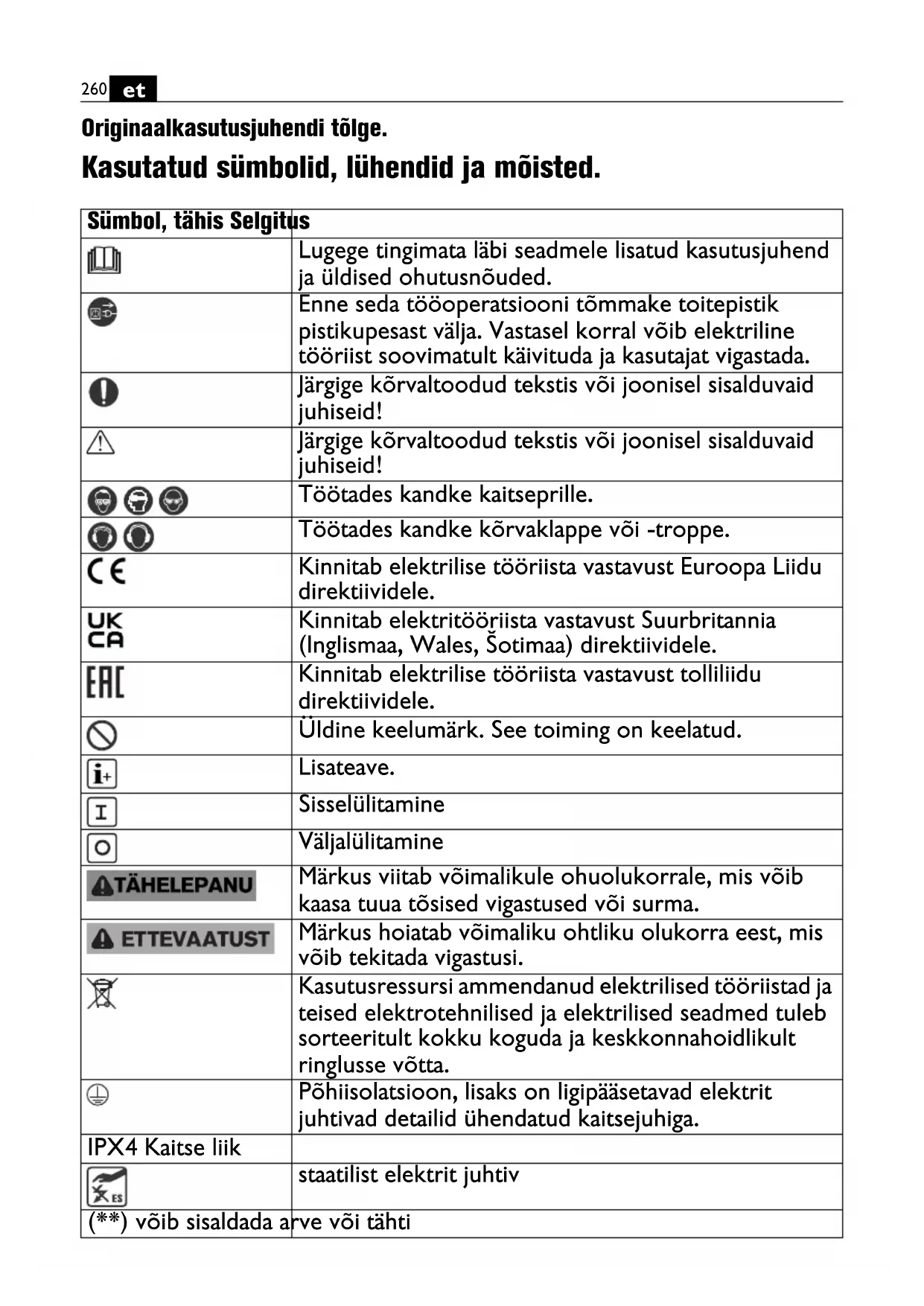 Originaalkasutusjuhendi tõlge. Kasutatud sümbolid, lühendid ja mõisted. Sümbol, tähis Selgitus Lugege tingimata läbi seadmele lisatud kasutusjuhend ja üldised ohutusnõuded. Enne seda tööoperatsiooni tõmmake toitepistik pistikupesast välja. Vastasel korral võib elektriline tööriist soovimatult käivituda ja kasutajat vigastada. Järgige kõrvaltoodud tekstis või joonisel sisalduvaid juhiseid! Järgige kõrvaltoodud tekstis või joonisel sisalduvaid juhiseid! Töötades kandke kaitseprille. Töötades kandke kõrvaklappe või -troppe. Kinnitab elektrilise tööriista vastavust Euroopa Liidu direktiividele. Kinnitab elektritööriista vastavust Suurbritannia (Inglismaa, Wales, Šotimaa) direktiividele. Kinnitab elektrilise tööriista vastavust tolliliidu direktiividele. Üldine keelumärk. See toiming on keelatud. Lisateave. Sisselülitamine Väljalülitamine Märkus viitab võimalikule ohuolukorrale, mis võib kaasa tuua tõsised vigastused või surma. Märkus hoiatab võimaliku ohtliku olukorra eest, mis võib tekitada vigastusi. Kasutusressursi ammendanud elektrilised tööriistad ja teised elektrotehnilised ja elektrilised seadmed tuleb sorteeritult kokku koguda ja keskkonnahoidlikult ringlusse võtta. Põhiisolatsioon, lisaks on ligipääsetavad elektrit juhtivad detailid ühendatud kaitsejuhiga. IPX4 Kaitse liik staatilist elektrit juhtiv (**) võib sisaldada arve või tähti261