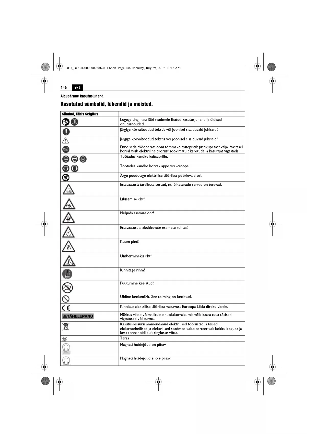 Algupärane kasutusjuhend. Kasutatud sümbolid, lühendid ja mõisted. Sümbol, tähis Selgitus Lugege tingimata läbi seadmele lisatud kasutusjuhend ja üldised ohutusnõuded. Järgige kõrvaltoodud tekstis või joonisel sisalduvaid juhiseid! Järgige kõrvaltoodud tekstis või joonisel sisalduvaid juhiseid! Enne seda tööoperatsiooni tõmmake toitepistik pistikupesast välja. Vastasel korral võib elektriline tööriist soovimatult käivituda ja kasutajat vigastada. Töötades kandke kaitseprille. Töötades kandke kõrvaklappe või -troppe. Ärge puudutage elektrilise tööriista pöörlevaid osi. Ettevaatust: tarvikute servad, nt lõiketerade servad on teravad. Libisemise oht! Muljuda saamise oht! Ettevaatust allakukkuvate esemete suhtes! Kuum pind! Ümbermineku oht! Kinnitage rihm! Puutumine keelatud! Üldine keelumärk. See toiming on keelatud. Kinnitab elektrilise tööriista vastavust Euroopa Liidu direktiividele. Märkus viitab võimalikule ohuolukorrale, mis võib kaasa tuua tõsised vigastused või surma. Kasutusressursi ammendanud elektrilised tööriistad ja teised elektrotehnilised ja elektrilised seadmed tuleb sorteeritult kokku koguda ja keskkonnahoidlikult ringlusse võtta. Teras Magneti hoidejõud on piisav Magneti hoidejõud ei ole piisav OBJ_BUCH-0000000386-001.book Page 146 Monday, July 29, 2019 11:43 AM147