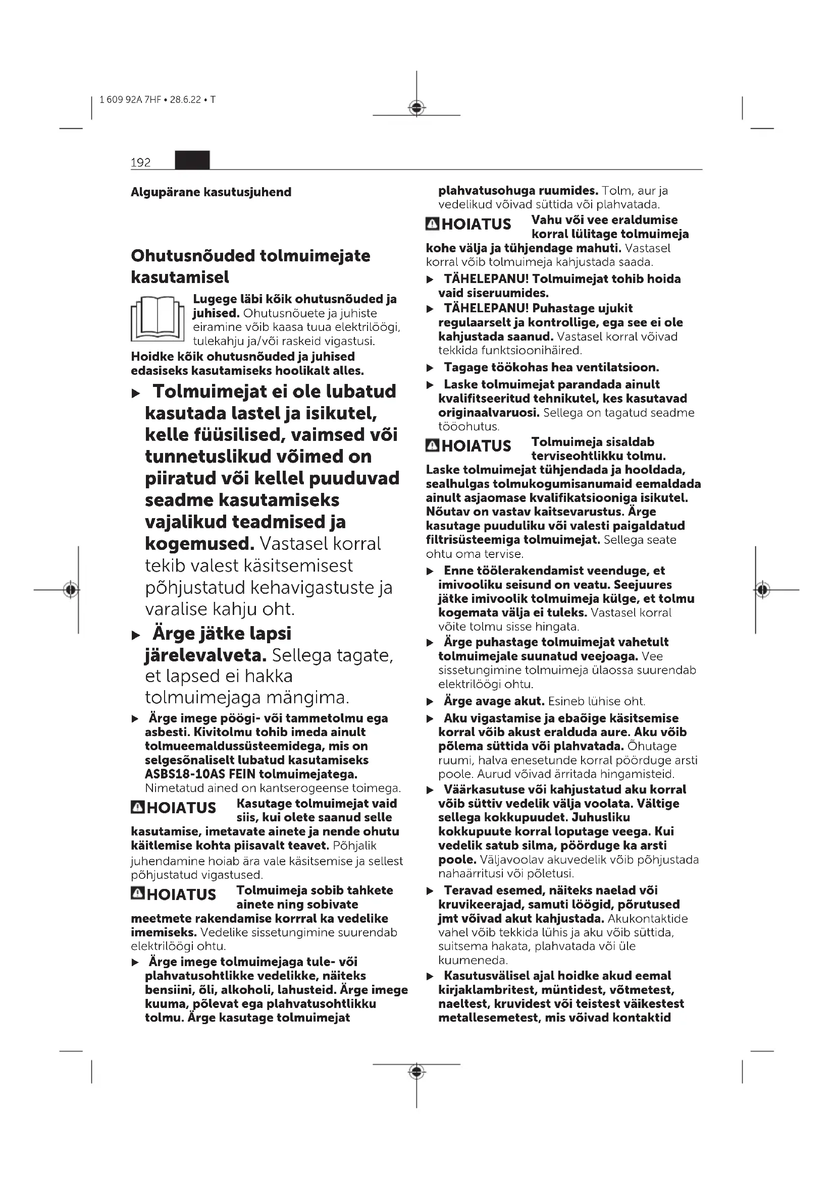 След въвеждането на продукта на британския пазар СЕ знакът губи своята валидност. Фирма FEIN декларира на своя отговорност, че този продукт отговаря на посочените реле- вантни разпоредби на последните страници от настоящата инструкция за експлоатация. Технически документи при: C.&E.FeinGmbH, 73529 Schwäbisch Gmünd, Germany ТранспортиранеБългарски Препоръчителните литиево-йонни акумула- торни батерии трябва да изпълняват изисква- ния за транспортиране на опасни товари. Аку- мулаторните батерии могат да бъдат транс- портирани от потребителя на публични места без допълнителни разрешителни. При транспортиране от трети страни (напр. при въздушен транспорт или ползване на ку- риерски услуги) има специални изисквания към опаковането и обозначаването им. За цел- та при подготовката на пакетирането се кон- султирайте с експерт в съответната област. Изпращайте акумулаторни батерии само ако корпусът им не е повреден. Изолирайте отк- рити контактни клеми с лепящи ленти и опа- ковайте акумулаторните батерии така, че да не могат да се изместват в опаковката си. Мо- ля, спазвайте също и допълнителни национал- ни предписания. БракуванеБългарски С оглед опазване на околната среда прахос- мукачката, акумулаторните батерии, допълни- телните приспособления и опаковките трябва да се предават за оползотворяване на съдър- жащите с е в тях суровини. Не изхвърляйте прахосмукачки и обикновени или акумулаторни ба- терии при битовите отпадъци! Само за страни от ЕС:Български Съгласно европейска директива 2012/19/EС за старите електрически и електронни уреди и нейното транспортиране в националното право прахосмукачките, които не могат да се ползват повече, а съгласно европейска дирек- тива 2006/66/EО повредени или изхабени обикновени или акумулаторни батерии, тряб- ва да се събират и предават за оползотворява- не на съдържащите се в тях суровини. При неправилно изхвърляне старите електри- чески и електронни уреди поради възможното наличие на опасни вещества могат да окажат вредни влияния върху околната среда и чо- вешкото здраве. Акумулаторни или обикновени батерии:Български Литиево-йонни: Моля, спазвайте указанията в раздела Транс- портиране (вж. „Транспортиране“, Страни- ца191). bg 191 1 609 92A 7HF • 28.6.22 • TAlgupärane kasutusjuhend Ohutusnõuded tolmuimejate kasutamiselEesti Lugege läbi kõik ohutusnõuded ja juhised. Ohutusnõuete ja juhiste eiramine võib kaasa tuua elektrilöögi, tulekahju ja/või raskeid vigastusi. Hoidke kõik ohutusnõuded ja juhised edasiseks kasutamiseks hoolikalt alles. u Tolmuimejat ei ole lubatud kasutada lastel ja isikutel, kelle füüsilised, vaimsed või tunnetuslikud võimed on piiratud või kellel puuduvad seadme kasutamiseks vajalikud teadmised ja kogemused. Vastasel korral tekib valest käsitsemisest põhjustatud kehavigastuste ja varalise kahju oht. u Ärge jätke lapsi järelevalveta. Sellega tagate, et lapsed ei hakka tolmuimejaga mängima. u Ärge imege pöögi- või tammetolmu ega asbesti. Kivitolmu tohib imeda ainult tolmueemaldussüsteemidega, mis on selgesõnaliselt lubatud kasutamiseks ASBS18‑10AS FEIN tolmuimejatega. Nimetatud ained on kantserogeense toimega. HOIATUS Kasutage tolmuimejat vaid siis, kui olete saanud selle kasutamise, imetavate ainete ja nende ohutu käitlemise kohta piisavalt teavet. Põhjalik juhendamine hoiab ära vale käsitsemise ja sellest põhjustatud vigastused. HOIATUS Tolmuimeja sobib tahkete ainete ning sobivate meetmete rakendamise korrral ka vedelike imemiseks. Vedelike sissetungimine suurendab elektrilöögi ohtu. u Ärge imege tolmuimejaga tule- või plahvatusohtlikke vedelikke, näiteks bensiini, õli, alkoholi, lahusteid. Ärge imege kuuma, põlevat ega plahvatusohtlikku tolmu. Ärge kasutage tolmuimejat plahvatusohuga ruumides. Tolm, aur ja vedelikud võivad süttida või plahvatada. HOIATUS Vahu või vee eraldumise korral lülitage tolmuimeja kohe välja ja tühjendage mahuti. Vastasel korral võib tolmuimeja kahjustada saada. u TÄHELEPANU! Tolmuimejat tohib hoida vaid siseruumides. u TÄHELEPANU! Puhastage ujukit regulaarselt ja kontrollige, ega see ei ole kahjustada saanud. Vastasel korral võivad tekkida funktsioonihäired. u Tagage töökohas hea ventilatsioon.u Laske tolmuimejat para