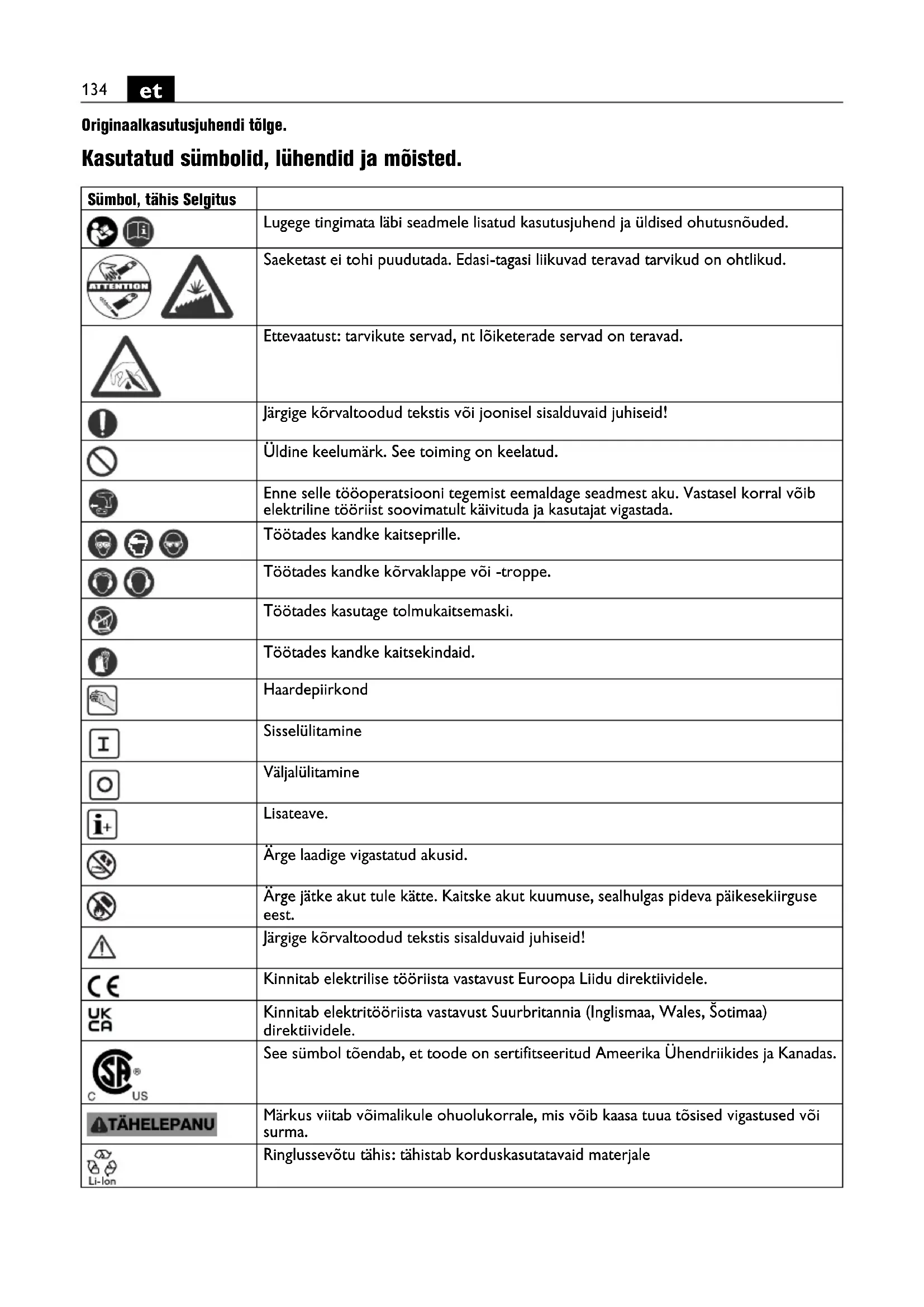 Originaalkasutusjuhendi tõlge. Kasutatud sümbolid, lühendid ja mõisted. Sümbol, tähis Selgitus Lugege tingimata läbi seadmele lisatud kasutusjuhend ja üldised ohutusnõuded. Saeketast ei tohi puudutada. Edasi-tagasi liikuvad teravad tarvikud on ohtlikud. Ettevaatust: tarvikute servad, nt lõiketerade servad on teravad. Järgige kõrvaltoodud tekstis või joonisel sisalduvaid juhiseid! Üldine keelumärk. See toiming on keelatud. Enne selle tööoperatsiooni tegemist eemaldage seadmest aku. Vastasel korral võib elektriline tööriist soovimatult käivituda ja kasutajat vigastada. Töötades kandke kaitseprille. Töötades kandke kõrvaklappe või -troppe. Töötades kasutage tolmukaitsemaski. Töötades kandke kaitsekindaid. Haardepiirkond Sisselülitamine Väljalülitamine Lisateave. Ärge laadige vigastatud akusid. Ärge jätke akut tule kätte. Kaitske akut kuumuse, sealhulgas pideva päikesekiirguse eest. Järgige kõrvaltoodud tekstis sisalduvaid juhiseid! Kinnitab elektrilise tööriista vastavust Euroopa Liidu direktiividele. Kinnitab elektritööriista vastavust Suurbritannia (Inglismaa, Wales, Šotimaa) direktiividele. See sümbol tõendab, et toode on sertifitseeritud Ameerika Ühendriikides ja Kanadas. Märkus viitab võimalikule ohuolukorrale, mis võib kaasa tuua tõsised vigastused või surma. Ringlussevõtu tähis: tähistab korduskasutatavaid materjale135