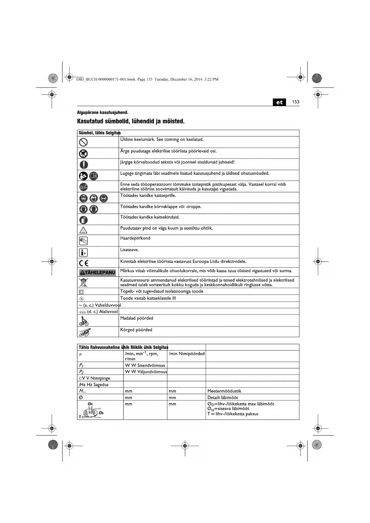 Algupärane kasutusjuhend. Kasutatud sümbolid, lühendid ja mõisted. Sümbol, tähis Selgitus Üldine keelumärk. See toiming on keelatud. Ärge puudutage elektrilise tööriista pöörlevaid osi. Järgige kõrvaltoodud tekstis või joonisel sisalduvaid juhiseid! Lugege tingimata läbi seadmele lisatud kasutusjuhend ja üldised ohutusnõuded. Enne seda tööoperatsiooni tõmmake toitepistik pistikupesast välja. Vastasel korral võib elektriline tööriist soovimatult käivituda ja kasutajat vigastada. Töötades kandke kaitseprille. Töötades kandke kõrvaklappe või -troppe. Töötades kandke kaitsekindaid. Puudutatav pind on väga kuum ja seetõttu ohtlik. Haardepiirkond Lisateave. Kinnitab elektrilise tööriista vastavust Euroopa Liidu direktiividele. Märkus viitab võimalikule ohuolukorrale, mis võib kaasa tuua tõsised vigastused või surma. Kasutusressursi ammendanud elektrilised tööriistad ja teised elektrotehnilised ja elektrilised seadmed tuleb sorteeritult kokku koguda ja keskkonnahoidlikult ringlusse võtta. Topelt- või tugevdatud isolatsiooniga toode Toode vastab kaitseklassile III ~ (a. c.) Vahelduvvool (d. c.) Alalisvool Madalad pöörded Kõrged pöörded Tähis Rahvusvaheline ühik Riiklik ühik Selgitus