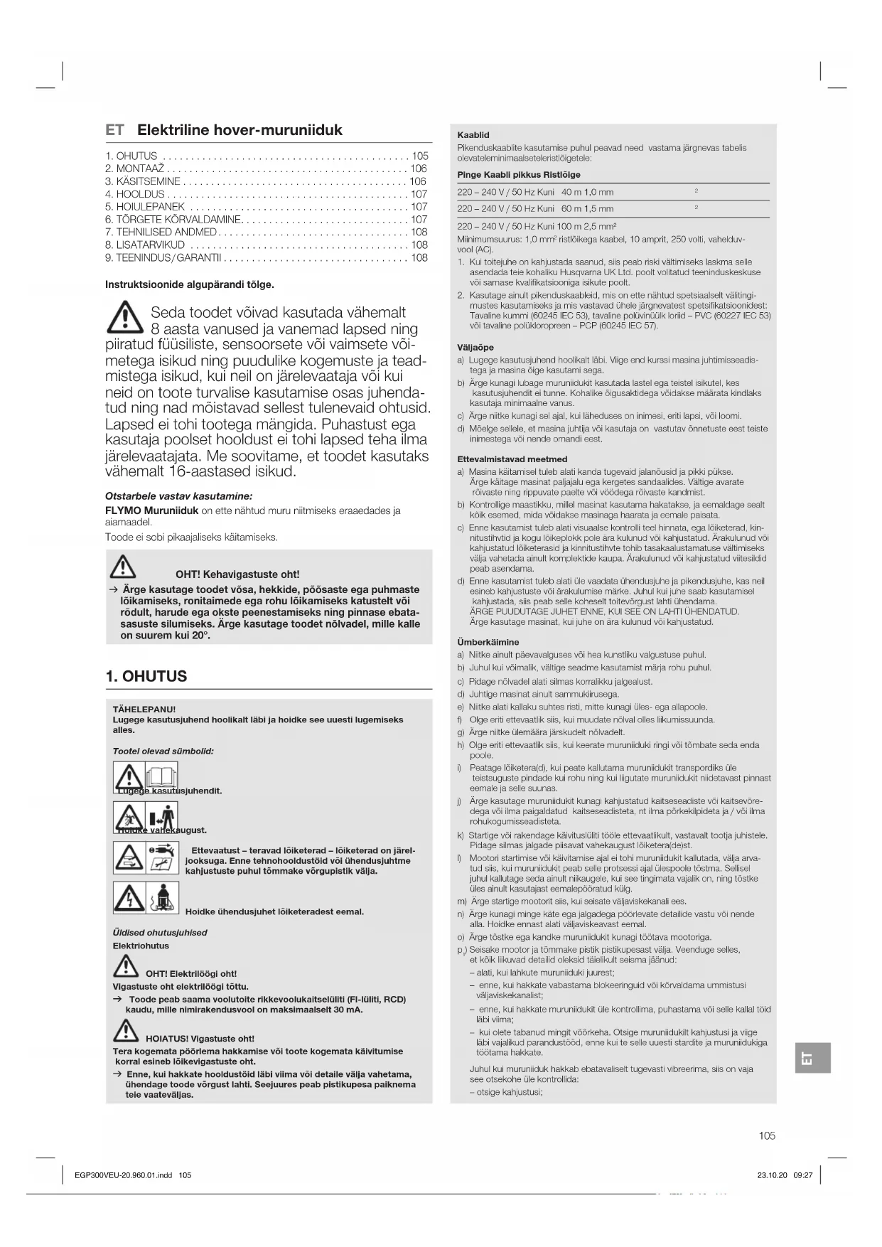 Instruktsioonide algupärandi tõlge. Seda toodet võivad kasutada vähemalt 8aasta vanused ja vanemad lapsed ning piiratud füüsiliste, sensoorsete või vaimsete või- metega isikud ning puudulike kogemuste ja tead- mistega isikud, kui neil on järelevaataja või kui neid on toote turvalise kasutamise osas juhenda- tud ning nad mõistavad sellest tulenevaid ohtusid. Lapsed ei tohi tootega mängida. Puhastust ega kasutaja poolset hooldust ei tohi lapsed teha ilma järelevaatajata. Me soovitame, et toodet kasutaks vähemalt 16-aastased isikud. Otstarbele vastav kasutamine: FLYMO Muruniiduk on ette nähtud muru niitmiseks eraaedades ja aiamaadel. Toode ei sobi pikaajaliseks käitamiseks. OHT! Kehavigastuste oht! v Ärge kasutage toodet võsa, hekkide, põõsaste ega puhmaste lõikamiseks, ronitaimede ega rohu lõikamiseks katustelt või rõdult, harude ega okste peenestamiseks ning pinnase ebata- sasuste silumiseks. Ärge kasutage toodet nõlvadel, mille kalle on suurem kui 20°. TÄHELEPANU! Lugege kasutusjuhend hoolikalt läbi ja hoidke see uuesti lugemiseks alles. Tootel olevad sümbolid: Lugege kasutusjuhendit. Hoidke vahekaugust. Ettevaatust – teravad lõiketerad – lõiketerad on järel- jooksuga. Enne tehnohooldustöid või ühendusjuhtme kahjustuste puhul tõmmake võrgupistik välja.