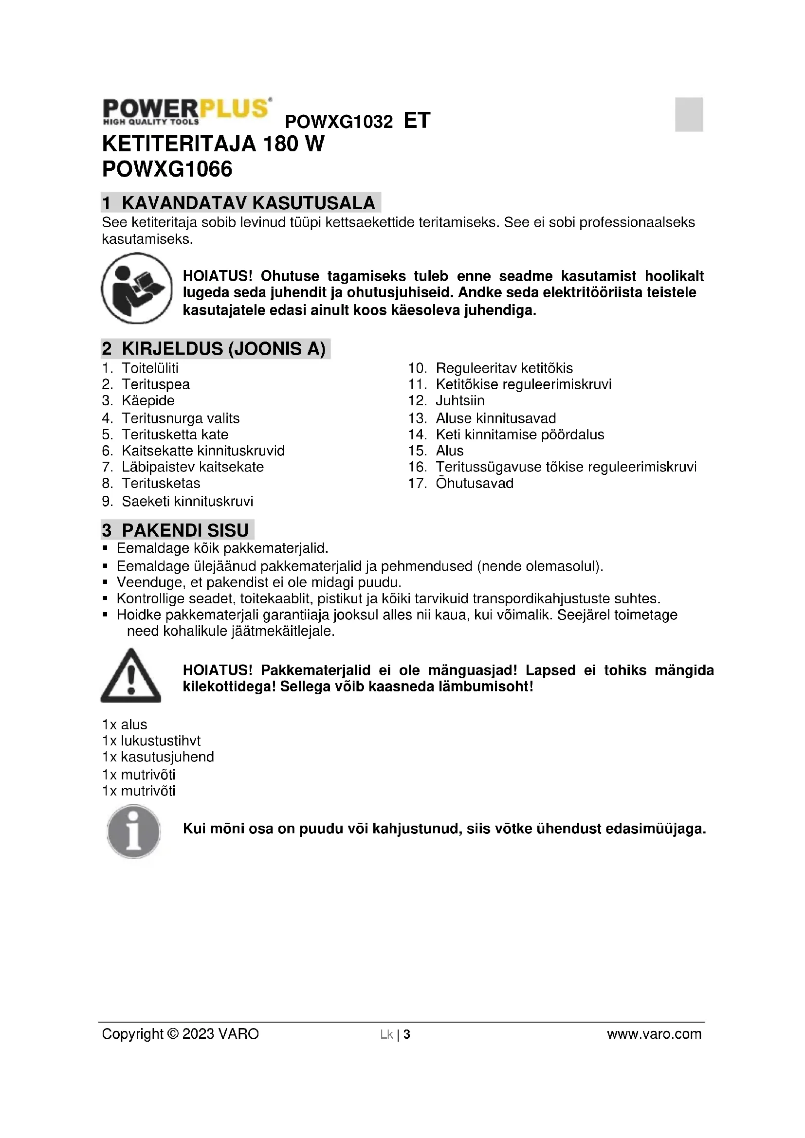 Copyright © 2023 VARO Lk | 3 www.varo.com KETITERITAJA 180 W POWXG1066 1 KAVANDATAV KASUTUSALA See ketiteritaja sobib levinud tüüpi kettsaekettide teritamiseks. See ei sobi professionaalseks kasutamiseks. HOIATUS! Ohutuse tagamiseks tuleb enne seadme kasutamist hoolikalt lugeda seda juhendit ja ohutusjuhiseid. Andke seda elektritööriista teistele kasutajatele edasi ainult koos käesoleva juhendiga. 2 KIRJELDUS (JOONIS A)
