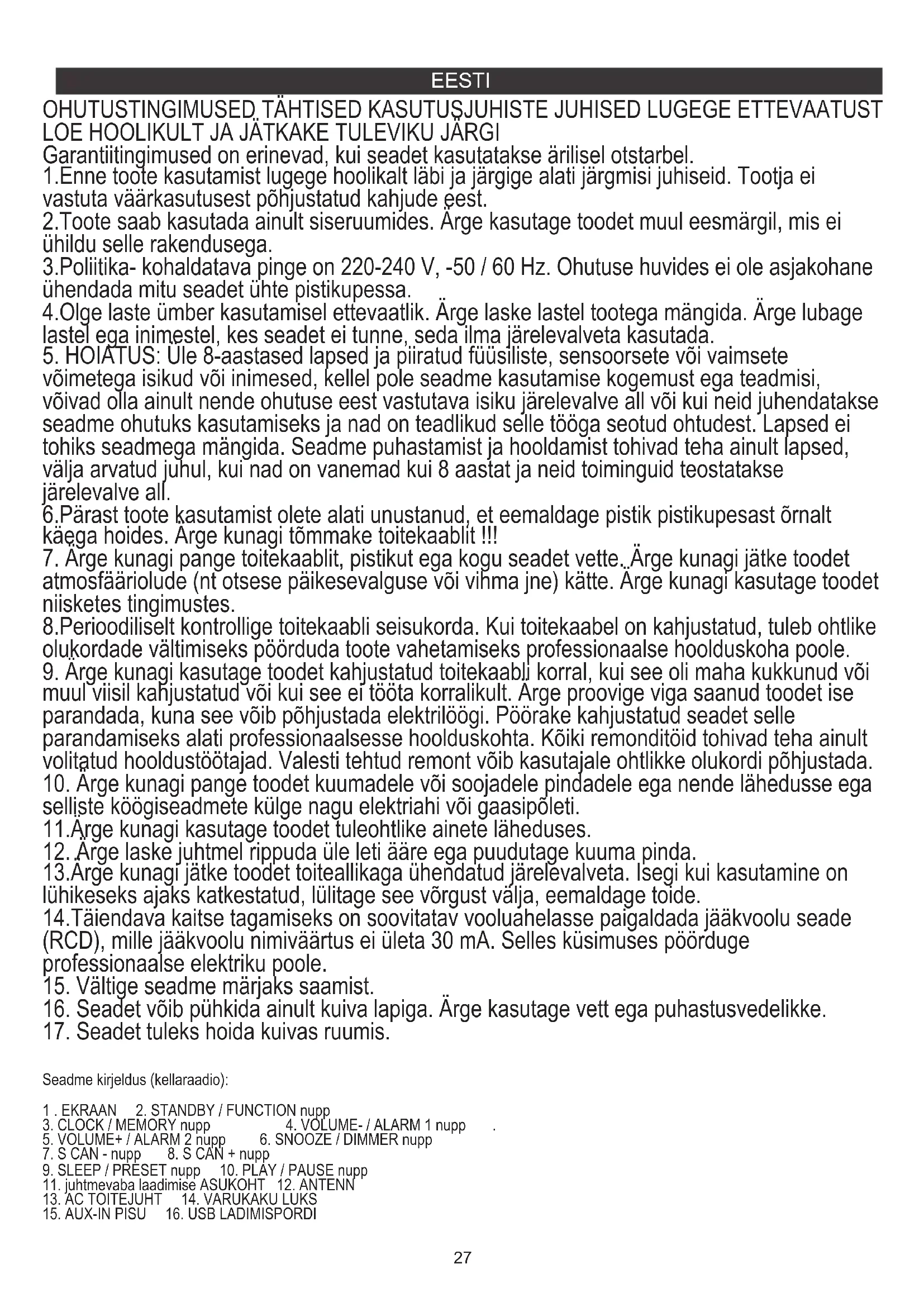 16. Seadet võib pühkida ainult kuiva lapiga. Ärge kasutage vett ega puhastusvedelikke.