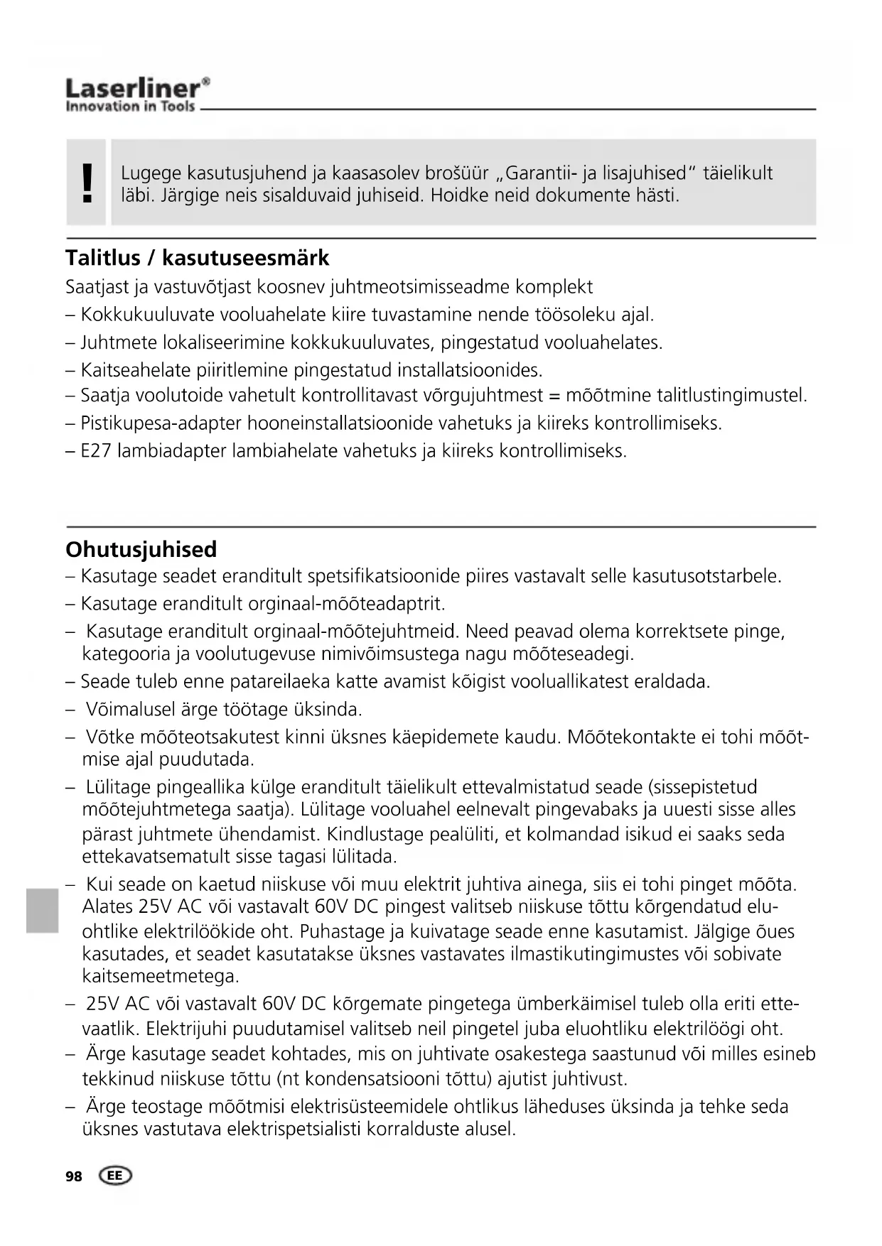 – Kasutage seadet eranditult spetsiÖ katsioonide piires vastavalt selle kasutusotstarbele. – Kasutage eranditult orginaal-mõõteadaptrit. – Kasutage eranditult orginaal-mõõtejuhtmeid. Need peavad olema korrektsete pinge, kategooria ja voolutugevuse nimivõimsustega nagu mõõteseadegi. – Seade tuleb enne patareilaeka katte avamist kõigist vooluallikatest eraldada. – Võimalusel ärge töötage üksinda. – Võtke mõõteotsakutest kinni üksnes käepidemete kaudu. Mõõtekontakte ei tohi mõõt- mise ajal puudutada. – Lülitage pingeallika külge eranditult täielikult ettevalmistatud seade (sissepistetud mõõtejuhtmetega saatja). Lülitage vooluahel eelnevalt pingevabaks ja uuesti sisse alles pärast juhtmete ühendamist. Kindlustage pealüliti, et kolmandad isikud ei saaks seda ettekavatsematult sisse tagasi lülitada. – Kui seade on kaetud niiskuse või muu elektrit juhtiva ainega, siis ei tohi pinget mõõta. Alates 25V AC või vastavalt 60V DC pingest valitseb niiskuse tõttu kõrgendatud elu- ohtlike elektrilöökide oht. Puhastage ja kuivatage seade enne kasutamist. Jälgige õues kasutades, et seadet kasutatakse üksnes vastavates ilmastikutingimustes või sobivate kaitsemeetmetega. – 25V AC või vastavalt 60V DC kõrgemate pingetega ümberkäimisel tuleb olla eriti ette- vaatlik. Elektrijuhi puudutamisel valitseb neil pingetel juba eluohtliku elektrilöögi oht. – Ärge kasutage seadet kohtades, mis on juhtivate osakestega saastunud või milles esineb tekkinud niiskuse tõttu (nt kondensatsiooni tõttu) ajutist juhtivust. – Ärge teostage mõõtmisi elektrisüsteemidele ohtlikus läheduses üksinda ja tehke seda üksnes vastutava elektrispetsialisti korralduste alusel. Ohutusjuhised Saatjast ja vastuvõtjast koosnev juhtmeotsimisseadme komplekt – Kokkukuuluvate vooluahelate kiire tuvastamine nende töösoleku ajal. – Juhtmete lokaliseerimine kokkukuuluvates, pingestatud vooluahelates. – Kaitseahelate piiritlemine pingestatud installatsioonides. – Saatja voolutoide vahetult kontrollitavast võrgujuhtmest = mõõtmine talitlustingimustel. – Pistikupesa-adapter hooneinstallatsioonide vahetuks ja kiireks kontrollimiseks. – E27 lambiadapter lambiahelate vahetuks ja kiireks kontrollimiseks. Talitlus / kasutuseesmärk Lugege kasutusjuhend ja kaasasolev brošüür „Garantii- ja lisajuhised“ täielikult läbi. Järgige neis sisalduvaid juhiseid. Hoidke neid dokumente hästi.