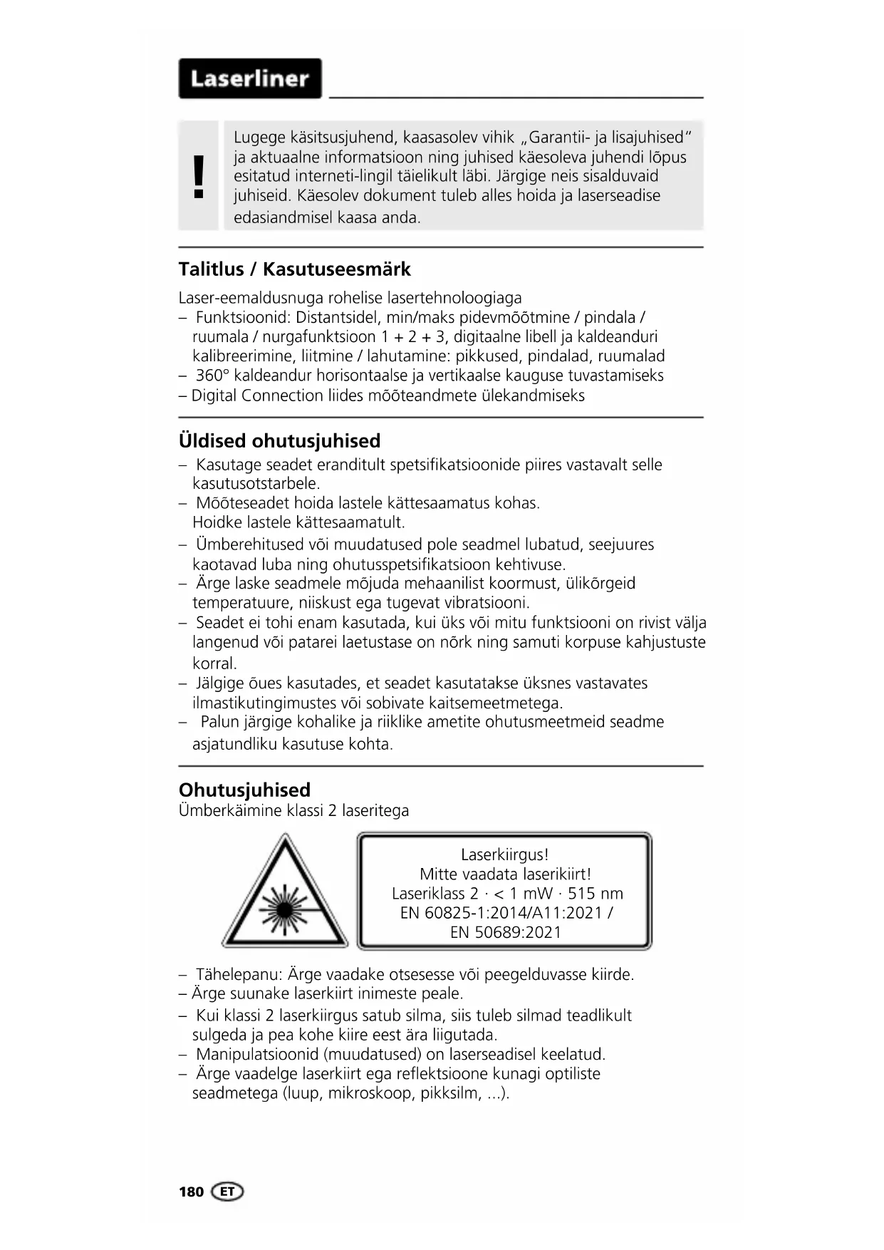 - Mõõtmiskaugus kuni 10 m hästi peegeldavate sihtpindade ja ruumitemperatuuri puhul. Suurematel distantsidel ja ebasoodsamatel mõõtmistingimustel nagu nt tugeva päikesekiirguse või halvasti peegeldavate sihtpindade puhul võib mõõtehälve ± 0,2 mm/m võrra suureneda. Tehnilised andmed (Jätame endale õiguse teha tehnilisi muudatusi. 24W43) Distantsi mõõtmine Täpsus (tüüpiline)* ± 2 mm Mõõtepind sees** 0,05 m - 70 m Nurga mõõtmine Mõõtevahemik ± 90° Resolutsioon 0,1° Täpsus 0,1° Laseriklass 2 < 1 mW Laserkiire lainepikkus 515 nm Töötingimused -10°C … 40°C, õhuniiskus max 20 … 85% rH, mittekondenseeruv, töökõrgus max 2000 m üle NN (normaalnull) Ladustamistingimused -20°C … 70°C, õhuniiskus max 80% rH Raadiomooduli tööandmed IEEE 802.15.4. LE ≥ 4.x (Digital Connection) liides; Sagedusriba: ISM-riba 2400–2483,5 MHz, 40 kanalit; Saatmisvõimsus: max. 10 mW; Ribalaius: 2 MHz; Bitikiirus: 1 Mbit/s; Modulatsioon: GFSK / FHSS Automaatne väljalülitumine 30 sek laser / 3 min seade Toitepinge 2 x 1,5V LR6 (AA) Mõõdud (L x K x S) 50 x 122 x 27 mm Kaal 140 g (koos patareiga) ET190 ELi ja UK nõuded ja utiliseerimine Seade täidab kõik nõutavad normid vabaks kaubavahetuseks ELi ja UK piires. See toode, kaasa arvatud tarvikud ja pakend, on elektriseade, mis tuleb väärtuslike toorainete tagasisaamiseks suunata Euroopa ja UK kasutatud elektri- ja elektroonikaseadmete, akude ja pakendite direktiividele keskkonnasõbralikku taaskasutusse. Elektriseadmed, patareid ja pakend ei kuulu olmeprügi hulka. Tarbijad on kohustatud andma kasutatud patareid ja akud tasuta avalikku kogumiskohta, müügipunkti või tehnilisse klienditeenindusse. Patarei tuleb kaubanduses saadaval olevate tööriistadega seadmest eemaldada ning suunata enne seadme jäätmekäitlusse andmist eraldi kogumisse. Kui teil on patarei eemaldamise kohta küsimusi, siis pöörduge UMAREX-LASERLINERi klienditeeninduse poole. Palun võtke ühendust oma asukohajärgse omavalitsusega, et saada teavet sobivate jäätmejaamade kohta ning järgige vastavaid jäätmekäitlus- ja ohutusjuhiseid kogumispunktides. Edasised ohutus- ja lisajuhised aadressil: http://laserliner.com/info?an=AHE ETLaserRange-Master Gi7 Pro