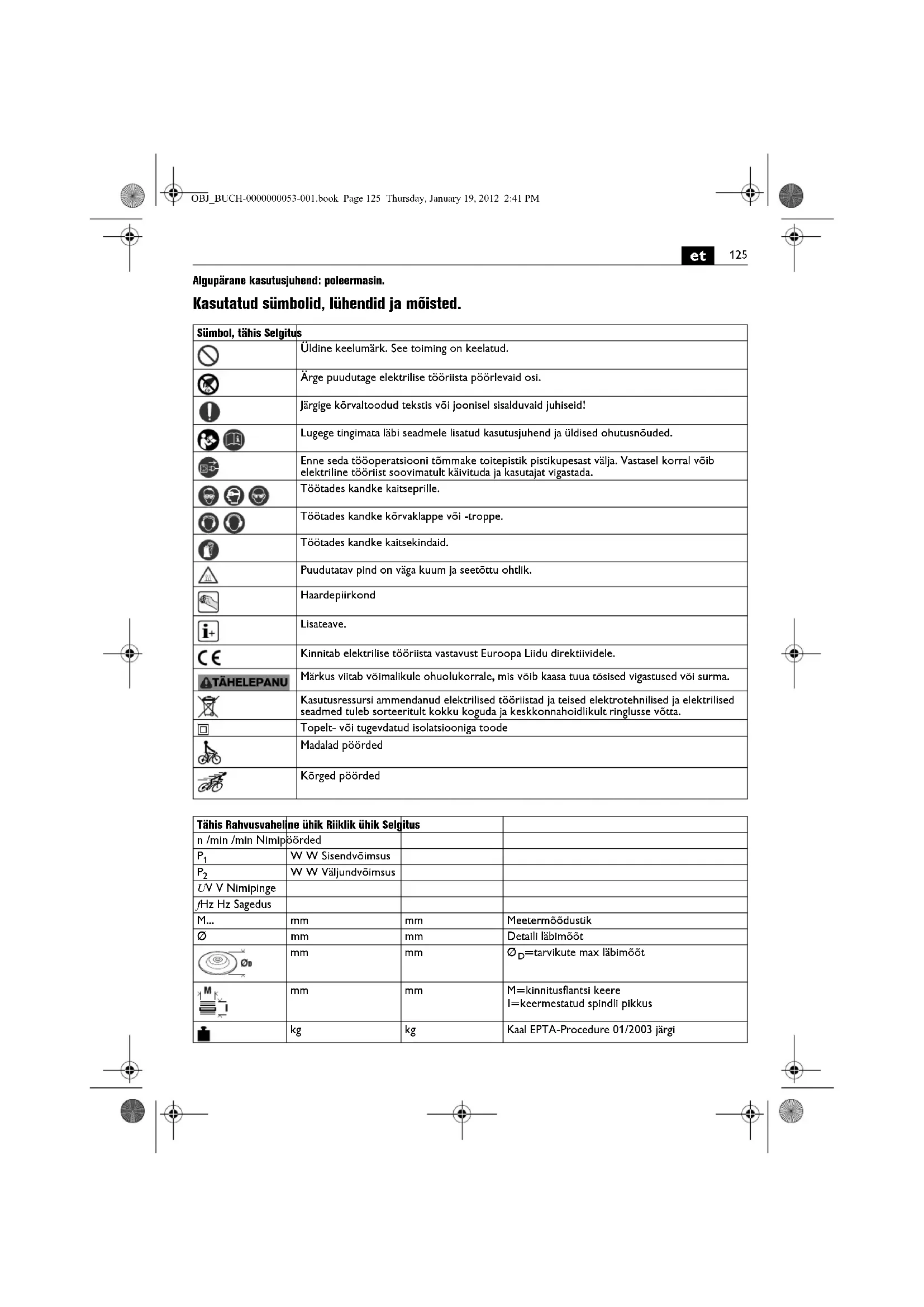 | Kasutusressursi ammendanud elektrilised tõöristad ja teised elektrotehnilised ja elektrilised seadmed tuleb sorteeritult kokku koguda ja keskkonnaholdllkult ringlusse võtta. | |