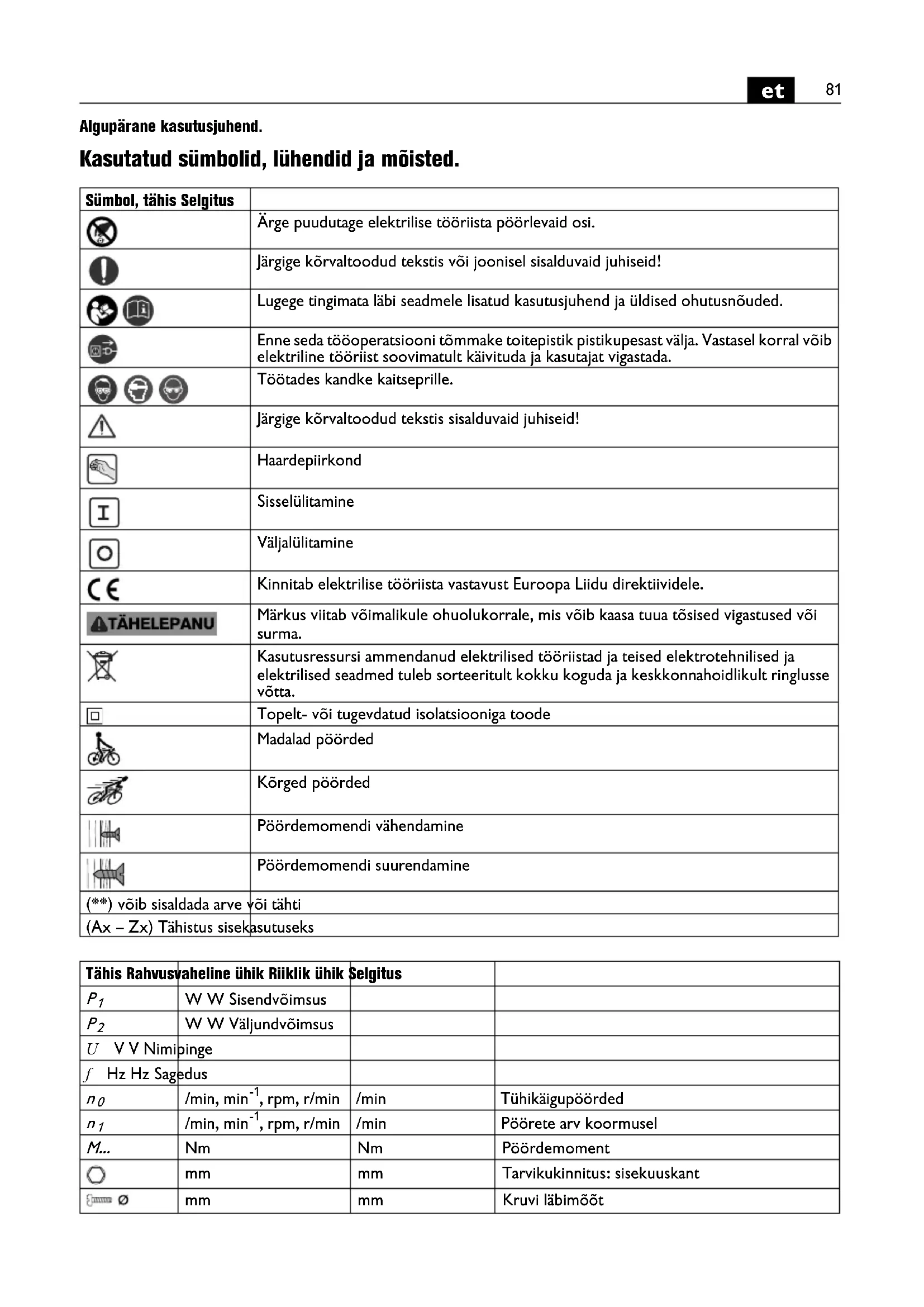 Algupärane kasutusjuhend. Kasutatud sümbolid, lühendid ja mõisted. Sümbol, tähis Selgitus Ärge puudutage elektrilise tööriista pöörlevaid osi. Järgige kõrvaltoodud tekstis või joonisel sisalduvaid juhiseid! Lugege tingimata läbi seadmele lisatud kasutusjuhend ja üldised ohutusnõuded. Enne seda tööoperatsiooni tõmmake toitepistik pistikupesast välja. Vastasel korral võib elektriline tööriist soovimatult käivituda ja kasutajat vigastada. Töötades kandke kaitseprille. Järgige kõrvaltoodud tekstis sisalduvaid juhiseid! Haardepiirkond Sisselülitamine Väljalülitamine Kinnitab elektrilise tööriista vastavust Euroopa Liidu direktiividele. Märkus viitab võimalikule ohuolukorrale, mis võib kaasa tuua tõsised vigastused või surma. Kasutusressursi ammendanud elektrilised tööriistad ja teised elektrotehnilised ja elektrilised seadmed tuleb sorteeritult kokku koguda ja keskkonnahoidlikult ringlusse võtta. Topelt- või tugevdatud isolatsiooniga toode Madalad pöörded Kõrged pöörded Pöördemomendi vähendamine Pöördemomendi suurendamine (**) võib sisaldada arve või tähti (Ax – Zx) Tähistus sisekasutuseks Tähis Rahvusvaheline ühik Riiklik ühik Selgitus