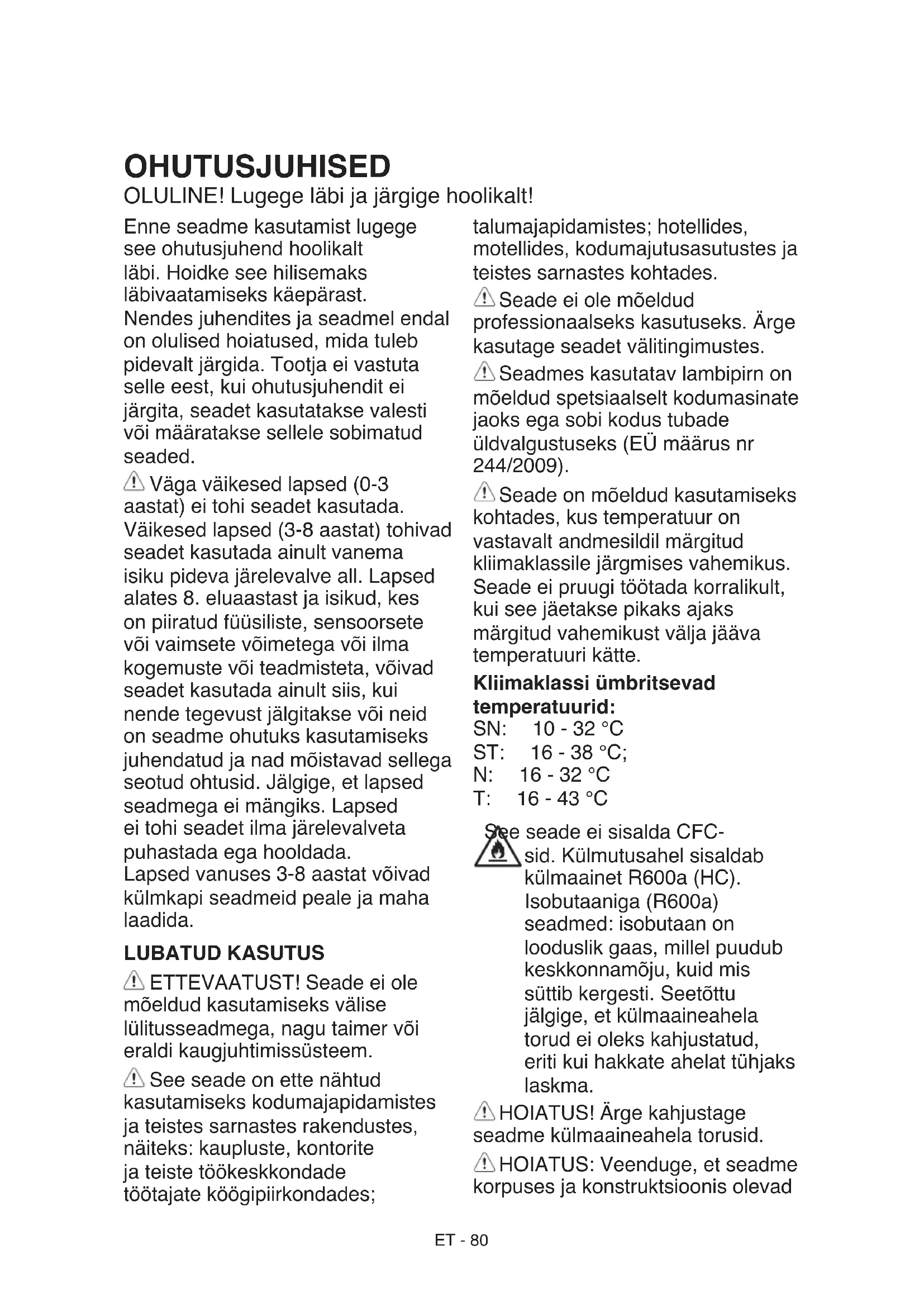 12.Estanteparabotellas 13.Estantedepuertaajustable*/Estantede puerta 14.Estantesdelapuertadelcompartimiento refrigerado 15.1Soporteparahuevos* Enalgunosmodelos Estapresentaciónsoloesparainformaciónsobrelaspiezasdelaparato. Laspiezaspuedenvariarsegúnelmodelodelaparato.ET-80 OHUTUSJUHISED OLULINE!Lugegeläbijajärgigehoolikalt! Enneseadmekasutamistlugege seeohutusjuhendhoolikalt läbi.Hoidkeseehilisemaks läbivaatamisekskäepärast. Nendesjuhenditesjaseadmelendal onolulisedhoiatused,midatuleb pidevaltjärgida.Tootjaeivastuta selleeest,kuiohutusjuhenditei järgita,seadetkasutataksevalesti võimäärataksesellelesobimatud seaded. Vägaväikesedlapsed(0-3 aastat)eitohiseadetkasutada. Väikesedlapsed(3-8aastat)tohivad seadetkasutadaainultvanema isikupidevajärelevalveall.Lapsed alates8.eluaastastjaisikud,kes onpiiratudfüüsiliste,sensoorsete võivaimsetevõimetegavõiilma kogemustevõiteadmisteta,võivad seadetkasutadaainultsiis,kui nendetegevustjälgitaksevõineid onseadmeohutukskasutamiseks juhendatudjanadmõistavadsellega seotudohtusid.Jälgige,etlapsed seadmegaeimängiks.Lapsed eitohiseadetilmajärelevalveta puhastadaegahooldada. Lapsedvanuses3-8aastatvõivad külmkapiseadmeidpealejamaha laadida. LUBATUD KASUTUS ETTEVAATUST!Seadeeiole mõeldudkasutamiseksvälise lülitusseadmega,nagutaimervõi eraldikaugjuhtimissüsteem. Seeseadeonettenähtud kasutamisekskodumajapidamistes jateistessarnastesrakendustes, näiteks:kaupluste,kontorite jateistetöökeskkondade töötajateköögipiirkondades; talumajapidamistes;hotellides, motellides,kodumajutusasutustesja teistessarnasteskohtades. Seadeeiolemõeldud professionaalsekskasutuseks.Ärge kasutageseadetvälitingimustes. Seadmeskasutatavlambipirnon mõeldudspetsiaalseltkodumasinate jaoksegasobikodustubade üldvalgustuseks(EÜmäärusnr 244/2009). Seadeonmõeldudkasutamiseks kohtades,kustemperatuuron vastavaltandmesildilmärgitud kliimaklassilejärgmisesvahemikus. Seadeeipruugitöötadakorralikult, kuiseejäetaksepikaksajaks märgitudvahemikustväljajääva temperatuurikätte. Kliimaklassi ümbritsevad temperatuurid: SN: 10-32°C ST: 16-38°C; N: 16-32°C T: 16-43°C SeeseadeeisisaldaCFC- sid.Külmutusahelsisaldab külmaainetR600a(HC). Isobutaaniga(R600a) seadmed:isobutaanon looduslikgaas,millelpuudub keskkonnamõju,kuidmis süttibkergesti.Seetõttu jälgige,etkülmaaineahela torudeiolekskahjustatud, eritikuihakkateahelattühjaks laskma. HOIATUS!Ärgekahjustage seadmekülmaaineahelatorusid. HOIATUS:Veenduge,etseadme korpusesjakonstruktsioonisolevadET-81 ventilatsiooniavadeioleblokeeritud. HOIATUS:Ärgekasutage sulamisekiirendamiseksmuid kuitootjasoovitatudmehaanilisi, elektrilisivõikeemilisivahendeid. HOIATUS:Ärgeasetageseadme sektsioonidesseelektriseadmeid, kuineedeioletootjapoolt selgesõnaliseltlubatudtüüpi. HOIATUS:Veevarustusega mitteühendatudjäävalmistajaidja/ võiveeautomaatevõibtäitaainult joogiveega. HOIATUS:Automaatsed jäävalmistajadja/võiveeautomaadid tohibühendadaainult joogiveetorustikuga,kusveesurve onvahemikus0,17-0,81mPa(1,7- 8,1bar). Ärgehoidkeseadmesegaselle lähedalplahvatusohtlikkeaineid, näiteksaerosoolipurke,bensiinija muidtuleohtlikkeaineid. Ärgeneelake(mõnemudeliga kaasasolevate)jääpakkidesisu (mittemürgine).Ärgesööge jääkuubikuidvõijääpulkikohe pärastnendesügavkülmikust võtmist,sestneedvõivad põhjustadakülmapõletust. Ärgeneelake(mõnemudeliga kaasasolevate)jääpakkidesisu (mittemürgine).Ärgesööge jääkuubikuidvõijääpulkikohe pärastnendesügavkülmikust võtmist,sestneedvõivad põhjustadakülmapõletust. Ärgehoidkekülmutussektsioonis vedelikegaklaasnõusid,sestneed võivadpuruneda. Ärgeblokeerigeventilaatorit(kuisee onpaigaldatud)toiduainetega. Kontrolligepärasttoidukülmikusse asetamist,kassektsioonideuksed, eritisügavkülmikuuks,sulguvad korralikult. Kahjustatudtihendtuleb võimalikultkiirestiväljavahetada. Kasutagekülmikusektsiooni ainultvärsketoiduning külmutussektsiooniainult külmutatudtoiduhoidmiseks,värske toidukülmutamiseksjajääkuubikute tegemiseks. Vältigekatmatatoiduhoidmist otseseskontaktiskülmiku-või külmutussektsioonisisepindadega. Seadmetelvõivadollaspetsiaalsed sektsioonid(värsketoidusektsioon, null-kraadikastjms). Kuikonkreetsestootejuhendisei olemärgitudteisiti,võibsellised sektsioonideemaldadaseadme toimimisnäitajaidmõjutamata. C-pentaanikasutatakse isolatsioonivahus puhumisvahendinajaseeon kergestisüttivgaas. Kõigesobilikumadseadme sektsioonid,kussäilitadateatud tüüpitoiduaineid,võttesarvesse erinevattemperatuurijaotust erinevatesseadmesektsioonides, onjaotatudjärgnevalt: -Külmikusektsioon: 1)Külmkapisektsiooniülemine ala&uks-temperatuuritsoon: Hoiustagetroopilisipuuvilju, konserve,jooke,mune,kastmeid, marineeritudköögivilju,võid,moosi 2)Külmkapisektsioonikeskmineala -jahetsoon:Säilitagejuustu,piima, piimatooteid,valmistoite,jogurtit 3)Külmkapisektsioonialumine ala-külmimtsoon:Hoiustage töödeldudlihatooteid,magustoite, lihajakala,juustukooki,värsketET-82 pastat,hapukoort,pestot/salsat, kodusttoitu,pagaritoodetekreeme, puddingitjakreemjuustu 4)Puuviljade&köögiviljadesahtel, misasubkülmkapialumises sektsioonis:Hoiustageköögiviljuja puuvilju(va.troopilisedpuuviljad) 5)Jahutusesektsioon:Hoiustage lihajakalakõigekülmemassahtlis -Külmutussektsioon: 4tärnitsooni(****)sektsioonon sobiliktoatemperatuurilolevate toiduainetekülmutamiseksning külmutatudtoiduhoiustamiseks, kunasealnetemperatuuron ühtlaselttervessektsioonis jagunenud.Ostetudkülmutatud toidulonpakendilmärgitud sellesäilivusaeg.Seevõtab arvessehoiustatavatoiduaine tüüpiningseegapeaksseda kuupäevaarvessevõtma.Värsket toitutohibsäilitadajärgmiste ajaperioodidejooksul:1-3kuud juustu,koorikloomade,jäätise, singi/vorstide,piima,värskete vedelikejaoks;4kuudpraetüki võikarbonaadi(loom,lammas, siga)jaoks;6kuudvõi/margariini, linnuliha(kana,kalkun)jaoks; 8-12puuviljade(va.tsiruselised), praeliha(loomaliha,siga,lammas), köögiviljad,jaoks.2tär
