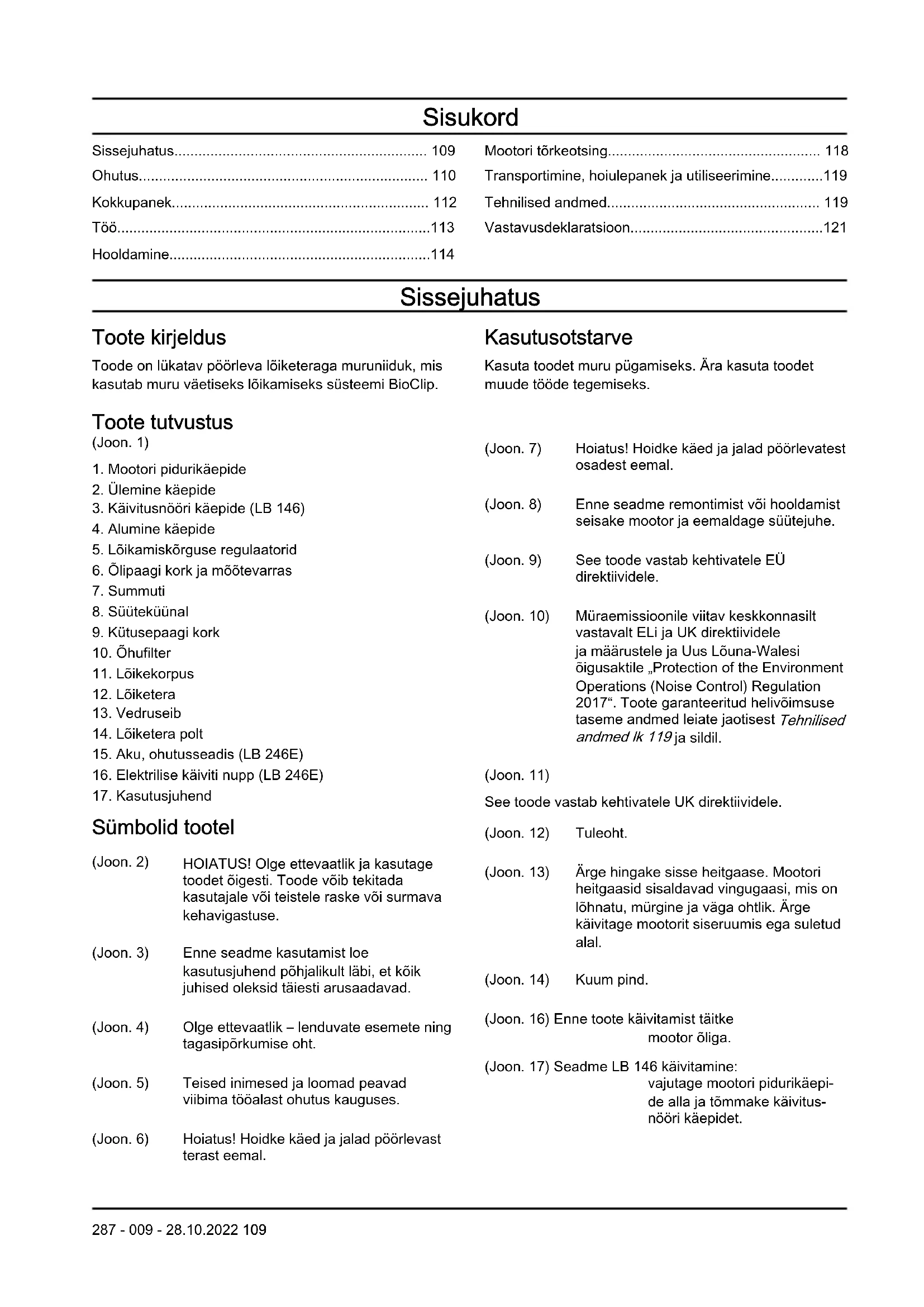 Sümbolid tootel (Joon. 2) HOIATUS! Olge ettevaatlik ja kasutage toodet õigesti. Toode võib tekitada kasutajale või teistele raske või surmava kehavigastuse. (Joon. 3) Enne seadme kasutamist loe kasutusjuhend põhjalikult läbi, et kõik juhised oleksid täiesti arusaadavad. (Joon. 4) Olge ettevaatlik – lenduvate esemete ning tagasipõrkumise oht. (Joon. 5) Teised inimesed ja loomad peavad viibima tööalast ohutus kauguses. (Joon. 6) Hoiatus! Hoidke käed ja jalad pöörlevast terast eemal. (Joon. 7) Hoiatus! Hoidke käed ja jalad pöörlevatest osadest eemal. (Joon. 8) Enne seadme remontimist või hooldamist seisake mootor ja eemaldage süütejuhe. (Joon. 9) See toode vastab kehtivatele EÜ direktiividele. (Joon. 10) Müraemissioonile viitav keskkonnasilt vastavalt ELi ja UK direktiividele ja määrustele ja Uus Lõuna-Walesi õigusaktile „Protection of the Environment Operations (Noise Control) Regulation 2017“. Toote garanteeritud helivõimsuse taseme andmed leiate jaotisest Tehnilised andmed lk 119 ja sildil. (Joon. 11) See toode vastab kehtivatele UK direktiividele. (Joon. 12) Tuleoht. (Joon. 13) Ärge hingake sisse heitgaase. Mootori heitgaasid sisaldavad vingugaasi, mis on lõhnatu, mürgine ja väga ohtlik. Ärge käivitage mootorit siseruumis ega suletud alal. (Joon. 14) Kuum pind. (Joon. 16) Enne toote käivitamist täitke mootor õliga. (Joon. 17) Seadme LB 146 käivitamine: vajutage mootori pidurikäepi- de alla ja tõmmake käivitus- nööri käepidet.
