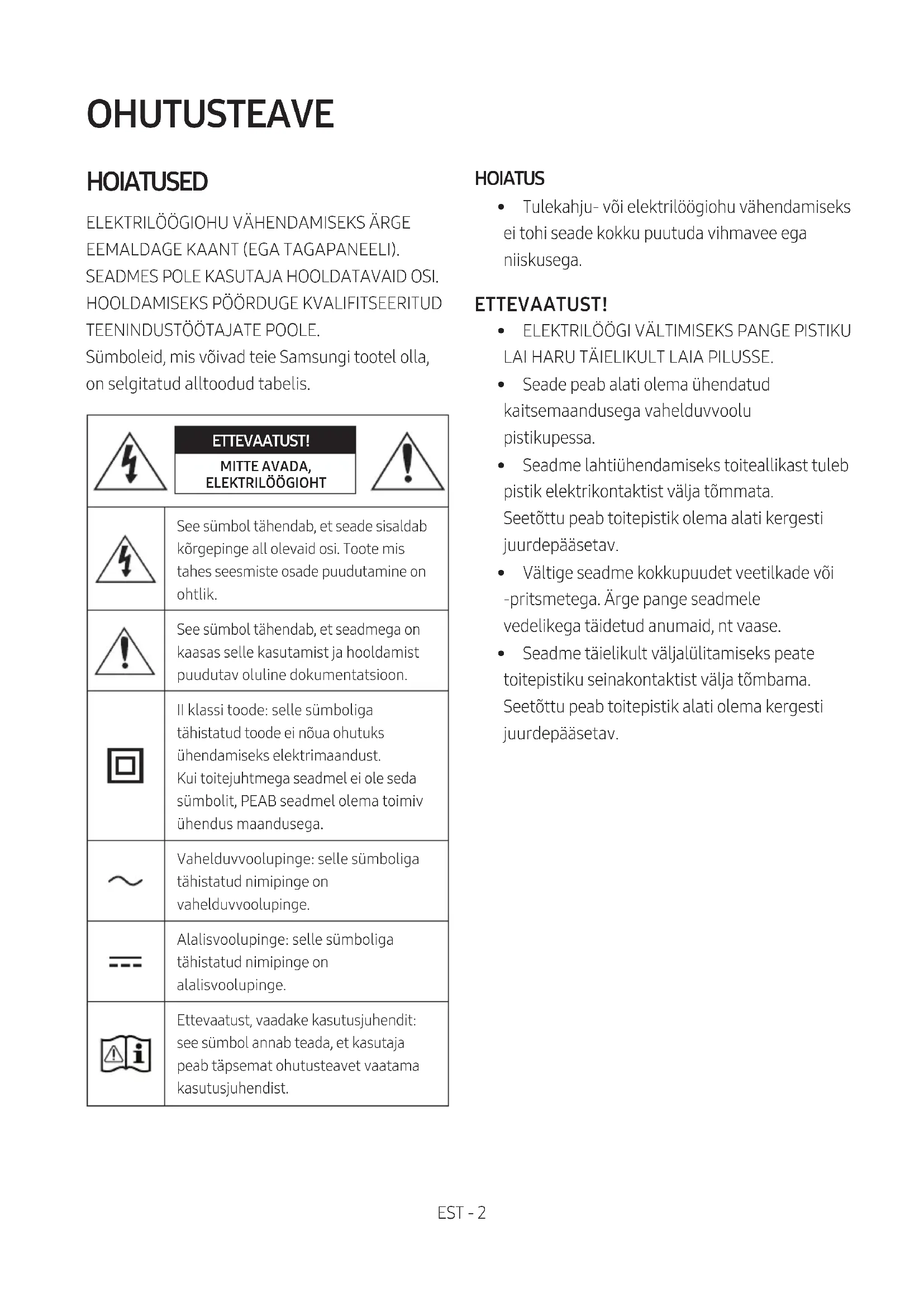TEENINDUSTÖÖTAJATE POOLE. Sümboleid, mis võivad teie Samsungi tootel olla, on selgitatud alltoodud tabelis. ETTEVAATUST! MITTE AVADA, ELEKTRILÖÖGIOHTSee sümbol tähendab, et seade sisaldab kõrgepinge all olevaid osi. Toote mis tahes seesmiste osade puudutamine on ohtlik.See sümbol tähendab, et seadmega on kaasas selle kasutamist ja hooldamist puudutav oluline dokumentatsioon.II klassi toode: selle sümboliga tähistatud toode ei nõua ohutuks ühendamiseks elektrimaandust. Kui toitejuhtmega seadmel ei ole seda sümbolit, PEAB seadmel olema toimiv ühendus maandusega. Vahelduvvoolupinge: selle sümboliga tähistatud nimipinge on vahelduvvoolupinge.Alalisvoolupinge: selle sümboliga tähistatud nimipinge on alalisvoolupinge.Ettevaatust, vaadake kasutusjuhendit: see sümbol annab teada, et kasutaja peab täpsemat ohutusteavet vaatama kasutusjuhendist. HOIATUS