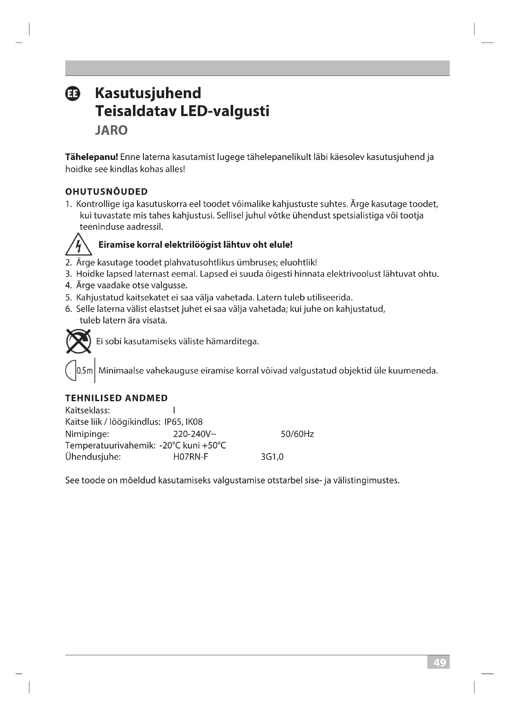 tuleb latern ära visata. Ei sobi kasutamiseks väliste hämarditega. Minimaalse vahekauguse eiramise korral võivad valgustatud objektid üle kuumeneda. TEHNILISED ANDMED Kaitseklass: I Kaitse liik / löögikindlus: IP65, IK08 Nimipinge: 220-240V~ 50/60Hz Temperatuurivahemik: -20°C kuni +50°C Ühendusjuhe: H07RN-F 3G1,0 See toode on mõeldud kasutamiseks valgustamise otstarbel sise- ja välistingimustes. 20P117 Mobiler LED Strahler Jaro 10-50W 0533125 210409.indd 49 09.04.2021 13:15:385050 Kasutusjuhend JARO KASUTUSELEVÕTMINE Seadke valgusti kuivale, tasasele pinnale. Valgusti kaldenurka saab reguleerida. Selleks vabastage küljel olev kiirlukusti, keerake valgusti pea soovitud asendisse ja seejärel kseerige taas kiirlukusti. JUHTELEMENDID Kandekäepide Kiirlukusti Raam STATIIVI PAIGALDAMINE Valgusti saab kinnituse küljes olevate aukude abil paigaldada Brennenstuhli statiivile (kinnitusmaterjal ei sisaldu tarnekomplektis). TARVIKUD Sobivad lisatarvikud leiate meie kodulehelt: www.brennenstuhl.de. HOOLDAMINE TÄHELEPANU! LED-latern ei sisalda komponente, mida oleks vaja hooldada. Valgusti valgusallikas pole vahetatav; kui valgusallika tööiga on läbi, tuleb kogu valgusti välja vahetada. Laternat ei tohi avada. PUHASTAMINE Enne puhastamist lahutage latern võrgutoitest. Ärge kasutage lahusteid, söövitavaid puhastusvahendeid vms. Kasutage puhastamiseks ainult kuiva või kergelt niisutatud lappi. 20P117 Mobiler LED Strahler Jaro 10-50W 0533125 210409.indd 50 09.04.2021 13:15:395151 JARO Kasutusjuhend KÕRVALDAMINE Kõrvaldage elektriseadmete jäätmed keskkonnanõudeid järgides! Ärge visake elektriseadmeid olmejäätmete hulka! Vastavalt Euroopa direktiivile 2012/19/EÜ elektri- ja elektroonikajäätmete kohta tuleb kasutatud elektriseadmed eraldi kokku koguda ja suunata keskkonnasõbralikule utiliseerimisele. Kasutuselt kõrvaldatud seadme utiliseerimise võimaluste kohta saate teavet oma valla- või linnavalitsusest. EL-I VASTAVUSAVALDUS EL-vastavusavaldus on saadaval tootjalt. TOOTJA Hugo Brennenstuhl GmbH & Co. KG Seestraße 1 – 3 · D-72074 Tübingen H. Brennenstuhl S.A.S. 4 rue de Bruxelles ∙ F-67170 Bernolsheim lectra technik ag Blegistrasse 13 · CH-6340 Baar Lisainfot leiate jaotisest Hooldus/KKK meie kodulehel www.brennenstuhl.com. 20P117 Mobiler LED Strahler Jaro 10-50W 0533125 210409.indd 51 09.04.2021 13:15:3952 Návod na používanie Mobilný LED žiarič JARO Pozor: Prečítajte si pred použitím výrobku pozorne tento návod na používanie a potom ho riadne uschovajte!