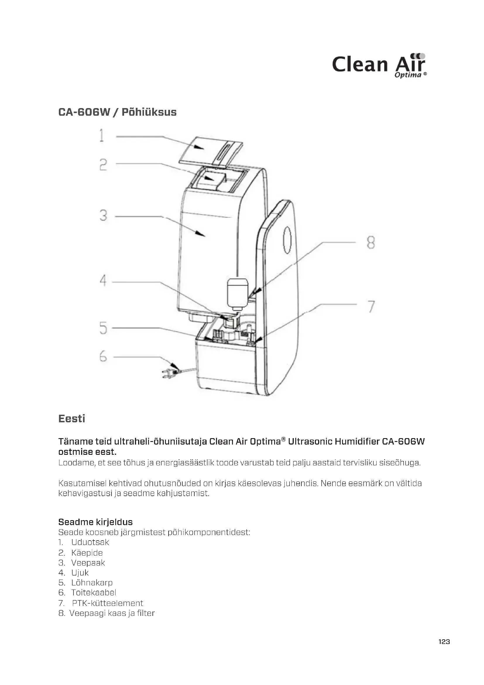 Eesti Täname teid ultraheli-õhuniisutaja Clean Air Optima® Ultrasonic Humidifier CA-606W ostmise eest. Loodame, et see tõhus ja energiasäästlik toode varustab teid palju aastaid tervisliku siseõhuga. Kasutamisel kehtivad ohutusnõuded on kirjas käesolevas juhendis. Nende eesmärk on vältida kehavigastusi ja seadme kahjustamist. Seadme kirjeldus Seade koosneb järgmistest põhikomponentidest: