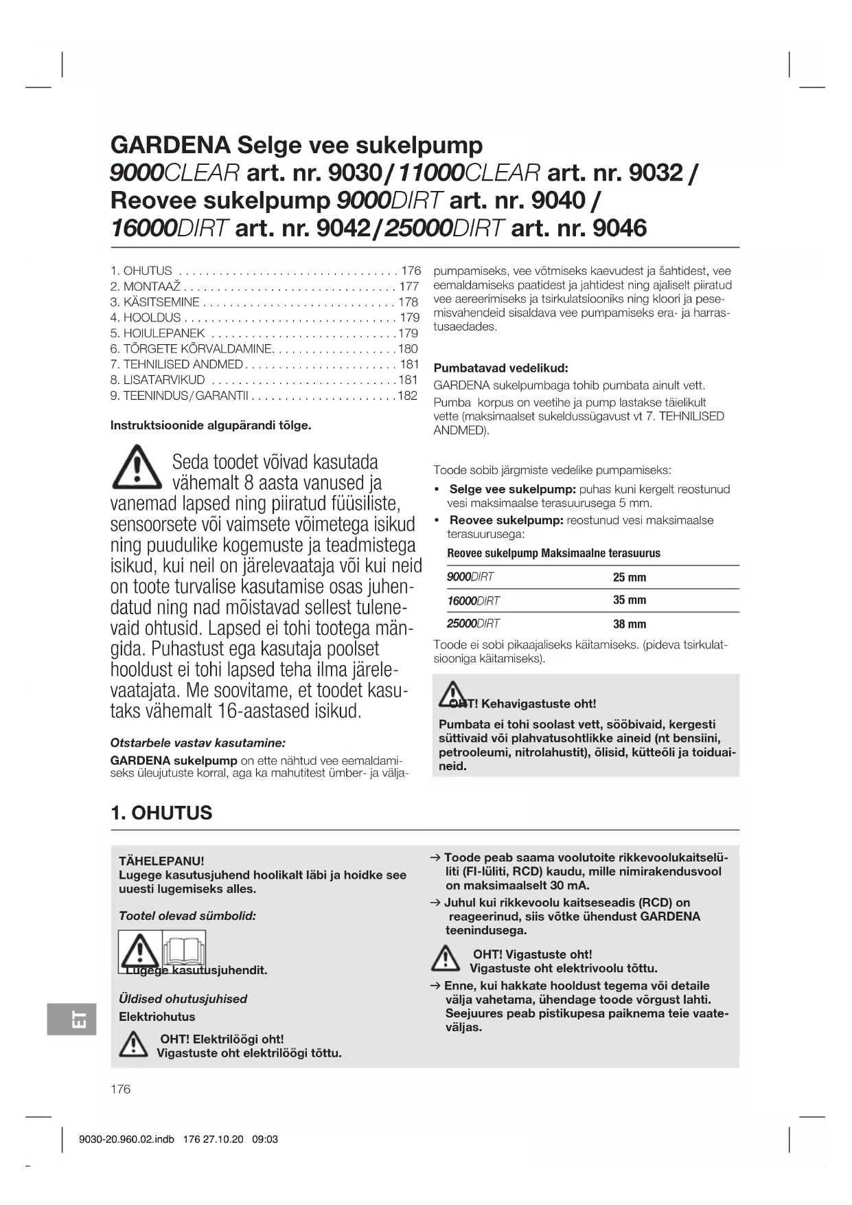 TÄHELEPANU! Lugege kasutusjuhend hoolikalt läbi ja hoidke see uuesti lugemiseks alles. Tootel olevad sümbolid: Lugege kasutusjuhendit. Üldised ohutusjuhised Elektriohutus OHT! Elektrilöögi oht! Vigastuste oht elektrilöögi tõttu. v Toode peab saama voolutoite rikkevoolukaitselü- liti (FI-lüliti, RCD) kaudu, mille nimirakendusvool on maksimaalselt 30 mA. v Juhul kui rikkevoolu kaitseseadis (RCD) on reageerinud, siis võtke ühendust GARDENA teenindusega. OHT! Vigastuste oht! Vigastuste oht elektrivoolu tõttu. v Enne, kui hakkate hooldust tegema või detaile välja vahetama, ühendage toode võrgust lahti. Seejuures peab pistikupesa paiknema teie vaate- väljas. GARDENA Selge vee sukelpump 9000CLEAR art. nr. 9030 / 11000CLEAR art. nr. 9032 / Reovee sukelpump 9000DIRT art. nr. 9040 / 16000DIRT art. nr. 9042 / 25000DIRT art. nr. 9046
