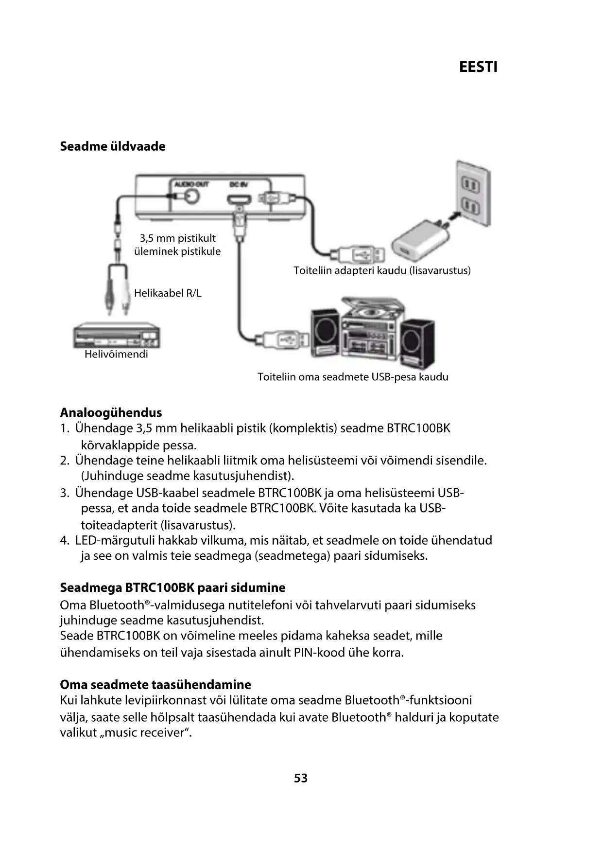 ja see on valmis teie seadmega (seadmetega) paari sidumiseks. Seadmega BTRC100BK paari sidumine Oma Bluetooth®-valmidusega nutitelefoni või tahvelarvuti paari sidumiseks juhinduge seadme kasutusjuhendist. Seade BTRC100BK on võimeline meeles pidama kaheksa seadet, mille ühendamiseks on teil vaja sisestada ainult PIN-kood ühe korra. Oma seadmete taasühendamine Kui lahkute levipiirkonnast või lülitate oma seadme Bluetooth®-funktsiooni välja, saate selle hõlpsalt taasühendada kui avate Bluetooth® halduri ja koputate valikut „music receiver“. EESTI54 Ühendus taastub automaatselt kui seadme BTRC100BK toide sisse lülitatakse. Kui soovite lülitada seadmeid üksteisega ühendada, tehke järgmised toimingud:
