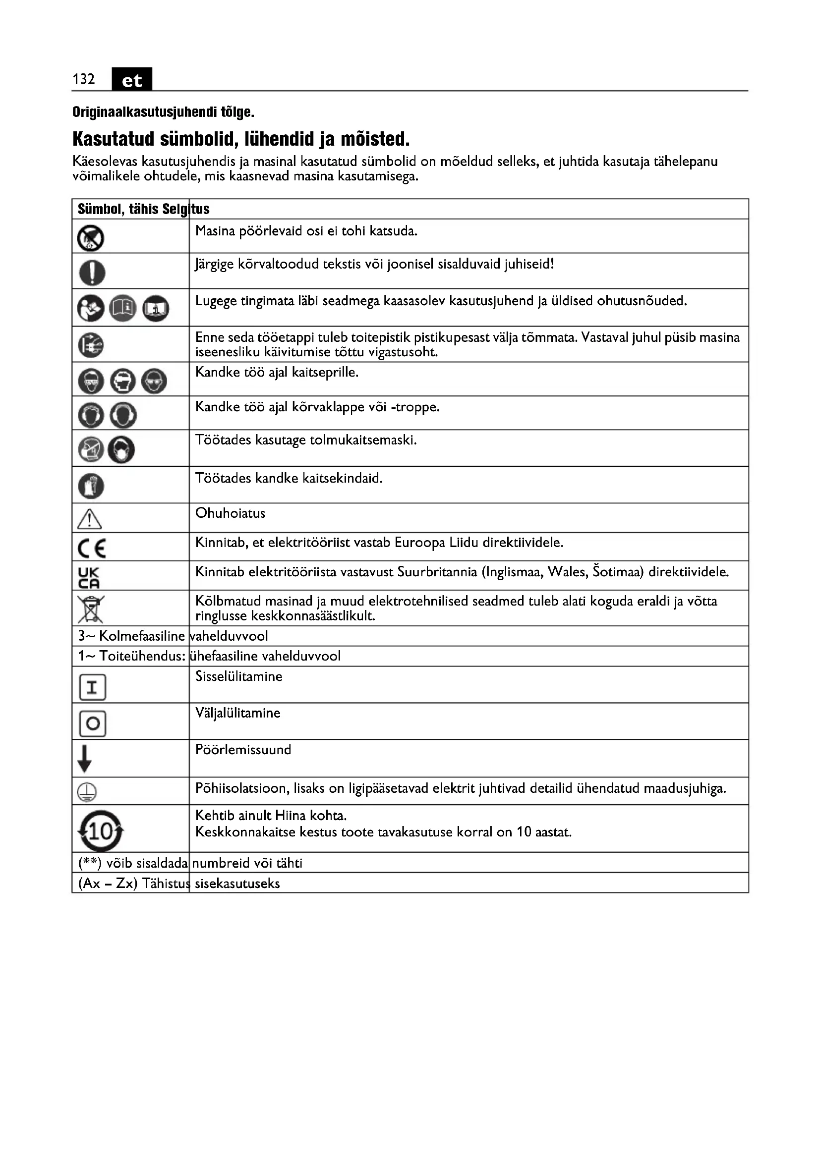 Originaalkasutusjuhendi tõlge. Kasutatud sümbolid, lühendid ja mõisted. Käesolevas kasutusjuhendis ja masinal kasutatud sümbolid on mõeldud selleks, et juhtida kasutaja tähelepanu võimalikele ohtudele, mis kaasnevad masina kasutamisega. Sümbol, tähis Selgitus Masina pöörlevaid osi ei tohi katsuda. Järgige kõrvaltoodud tekstis või joonisel sisalduvaid juhiseid! Lugege tingimata läbi seadmega kaasasolev kasutusjuhend ja üldised ohutusnõuded. Enne seda tööetappi tuleb toitepistik pistikupesast välja tõmmata. Vastaval juhul püsib masina iseenesliku käivitumise tõttu vigastusoht. Kandke töö ajal kaitseprille. Kandke töö ajal kõrvaklappe või -troppe. Töötades kasutage tolmukaitsemaski. Töötades kandke kaitsekindaid. Ohuhoiatus Kinnitab, et elektritööriist vastab Euroopa Liidu direktiividele. Kinnitab elektritööriista vastavust Suurbritannia (Inglismaa, Wales, Šotimaa) direktiividele. Kõlbmatud masinad ja muud elektrotehnilised seadmed tuleb alati koguda eraldi ja võtta ringlusse keskkonnasäästlikult. 3~ Kolmefaasiline vahelduvvool 1~ Toiteühendus: ühefaasiline vahelduvvool Sisselülitamine Väljalülitamine Pöörlemissuund Põhiisolatsioon, lisaks on ligipääsetavad elektrit juhtivad detailid ühendatud maadusjuhiga. Kehtib ainult Hiina kohta. Keskkonnakaitse kestus toote tavakasutuse korral on 10 aastat. (**) võib sisaldada numbreid või tähti (Ax – Zx) Tähistus sisekasutusekset